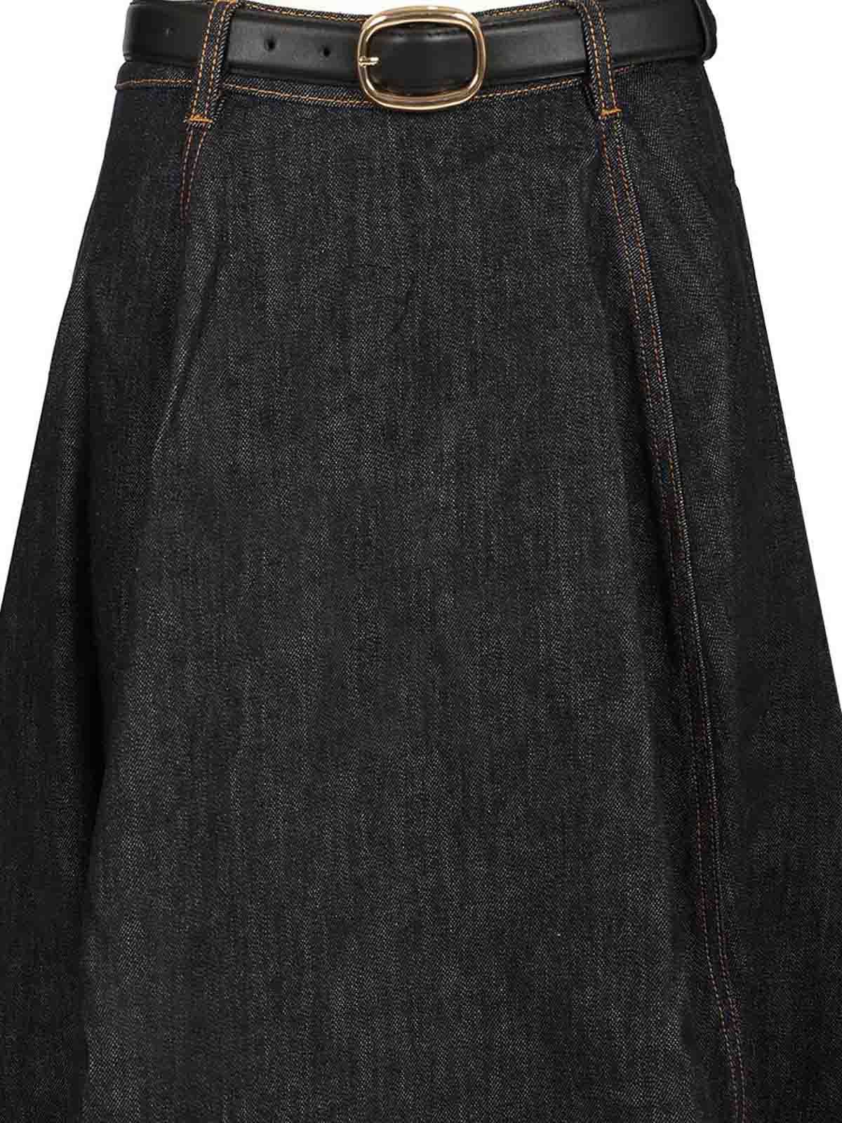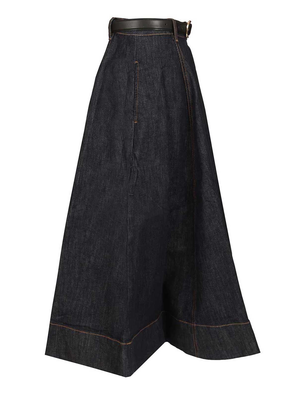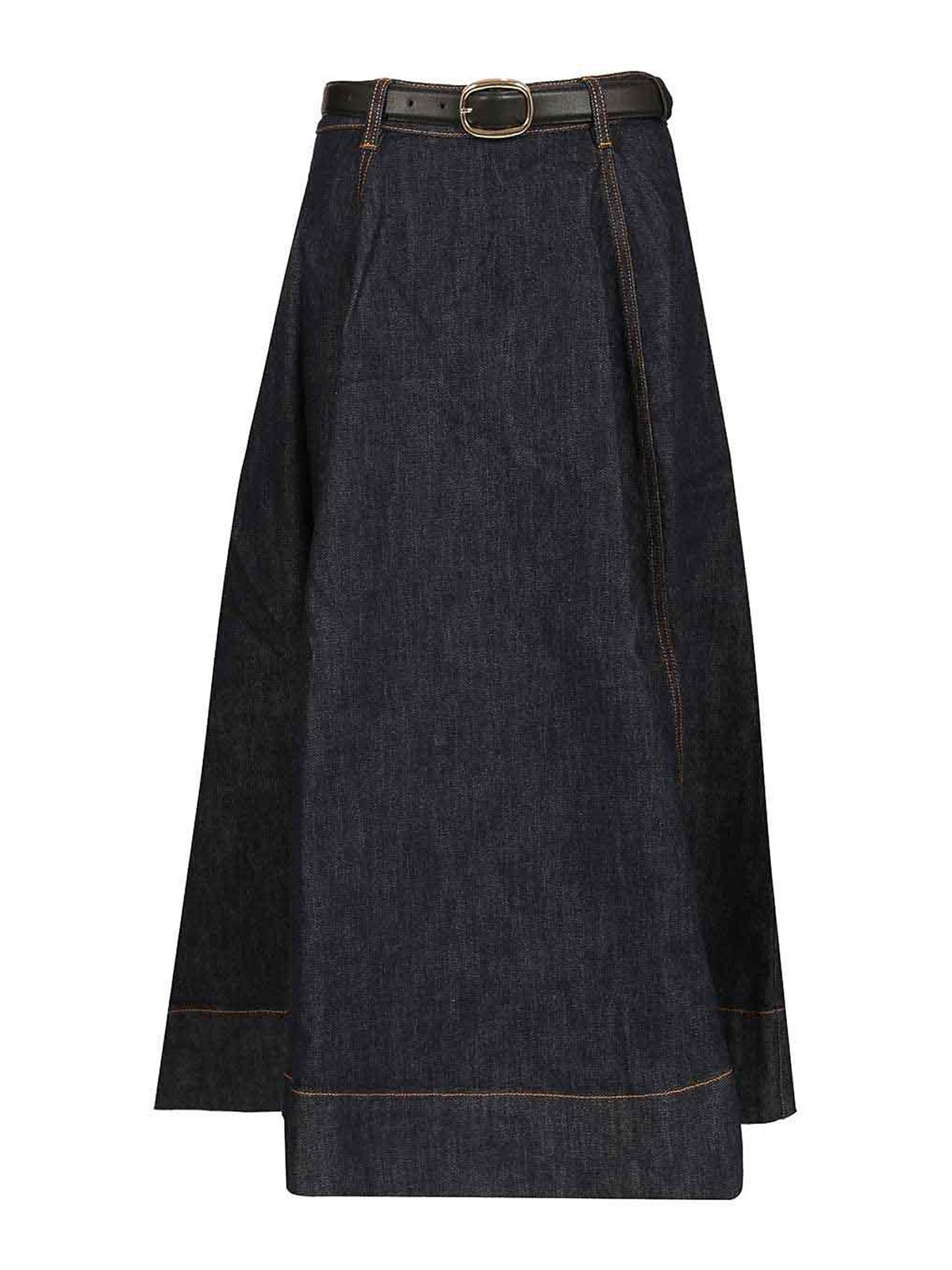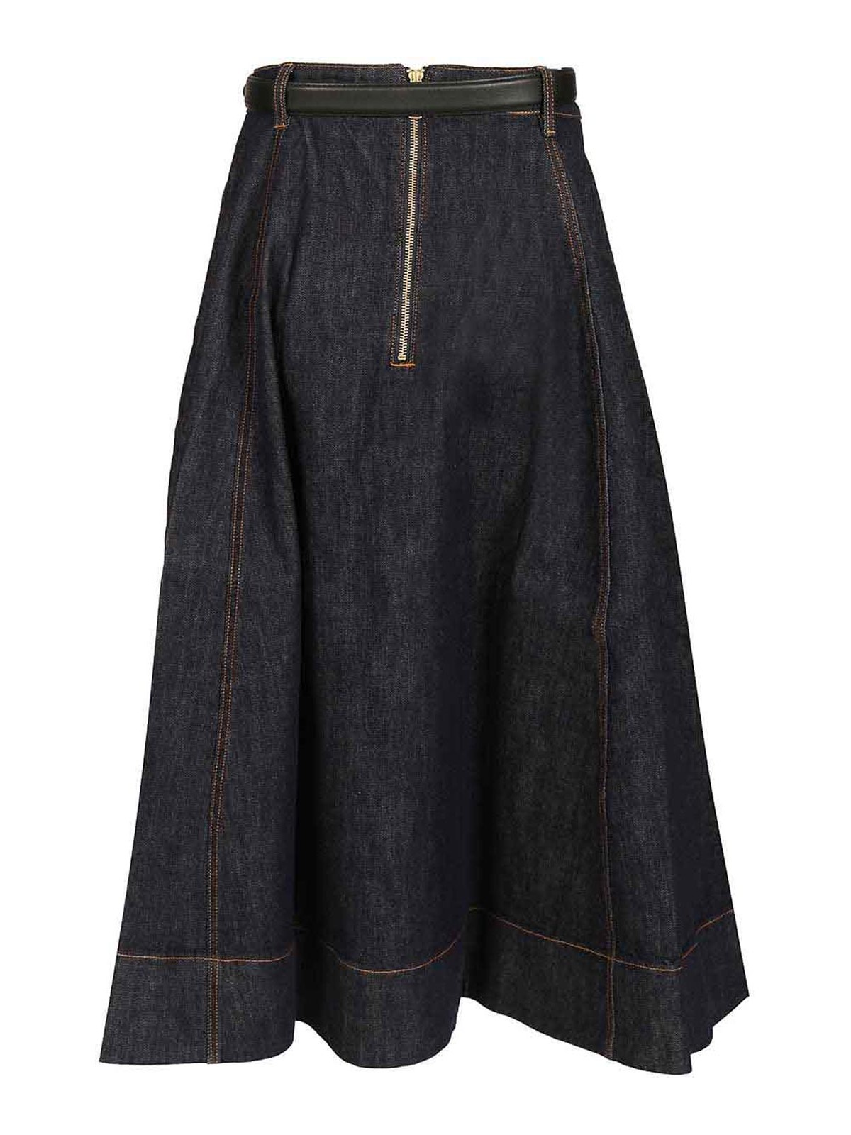 Jupe midi évasée en jean, fermeture éclair apparente au dos, poches fonctionnelles, ceinture amovible