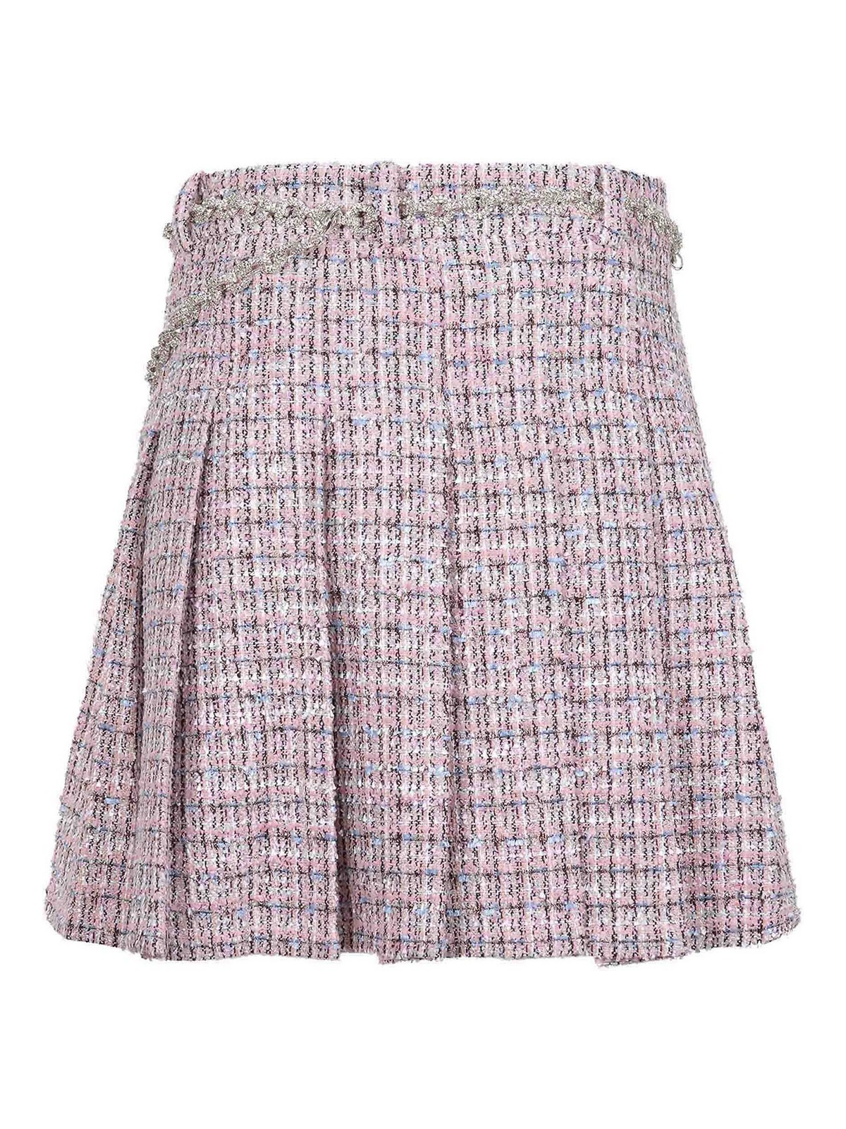 Autoportrait de Gonna réalisé en laine mélangée de couleur rose. Empiècements noirs et bleu ciel. Plissé. Passants de ceinture. Chaîne amovible en strass. Fermeture zippée latérale. Doublé. 91 % polyester, 8 % laine, 1 % fibres métalliques.
