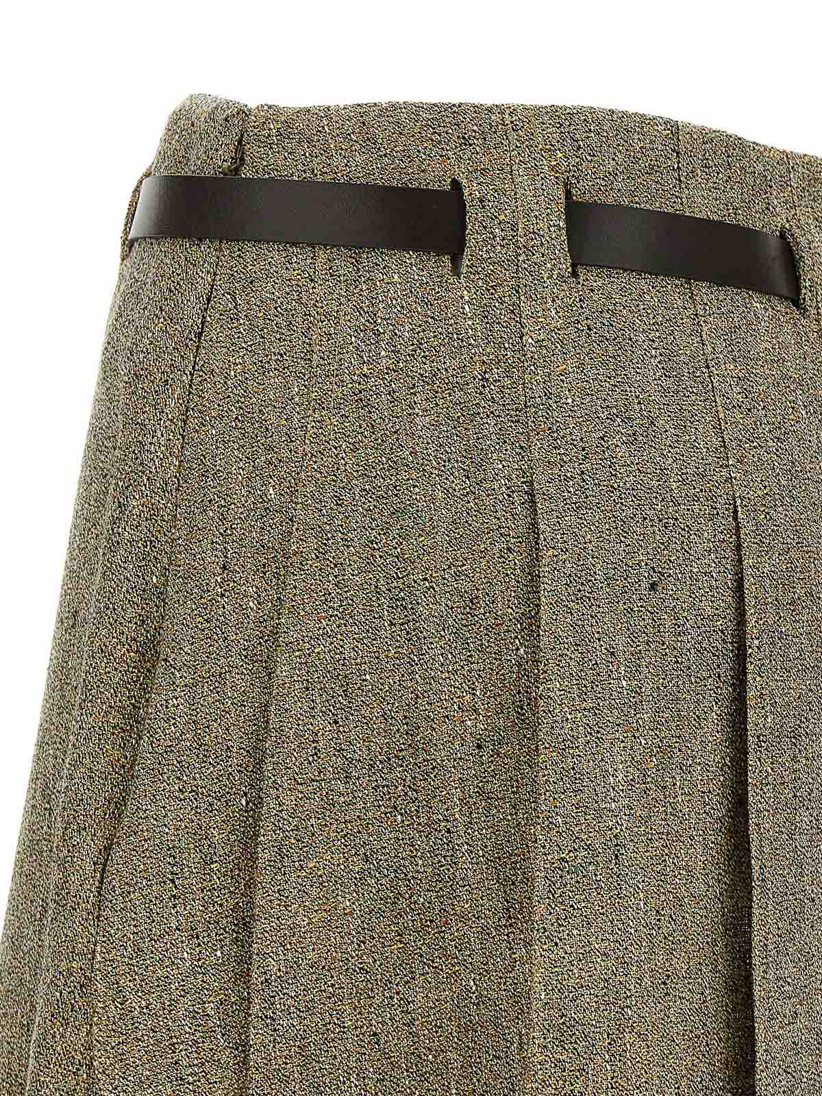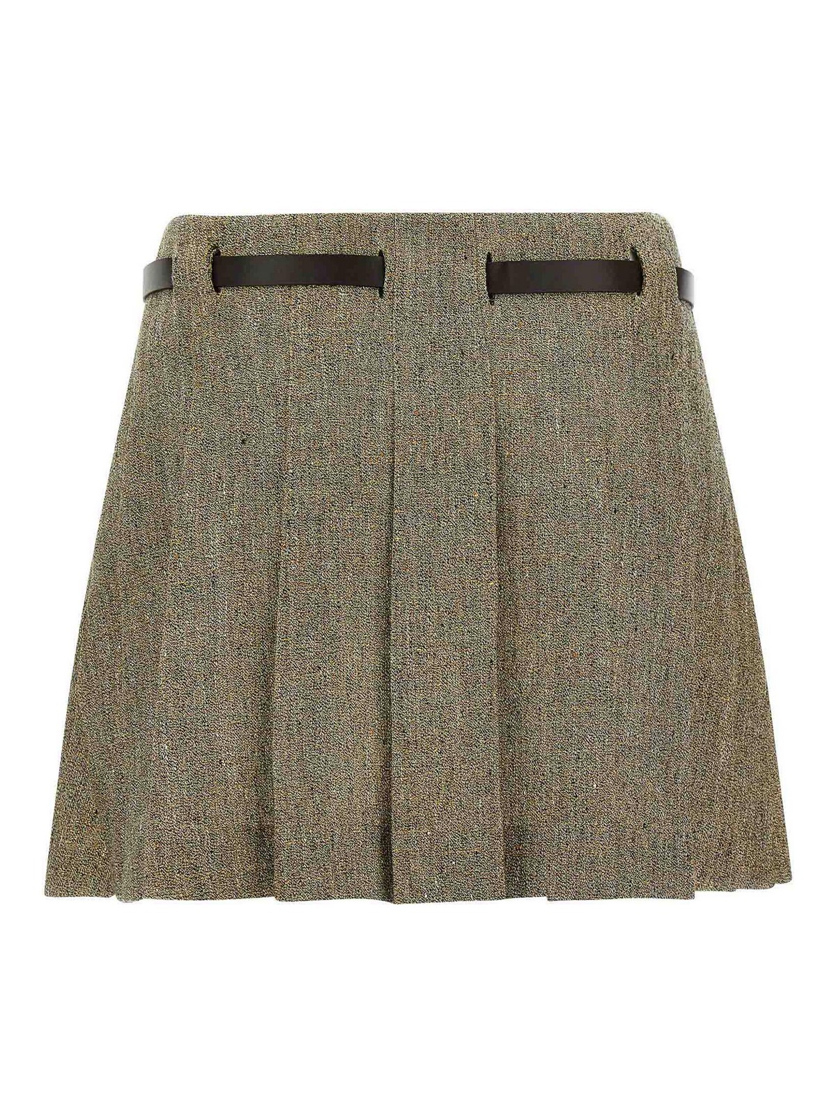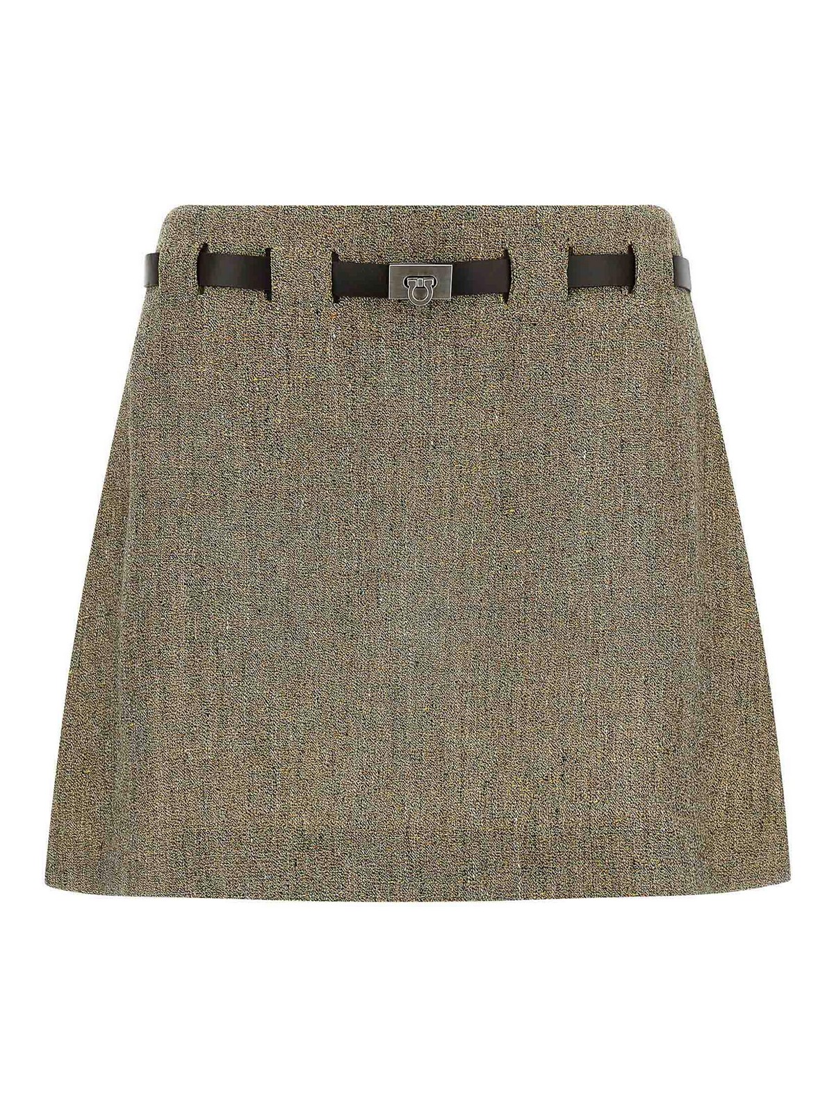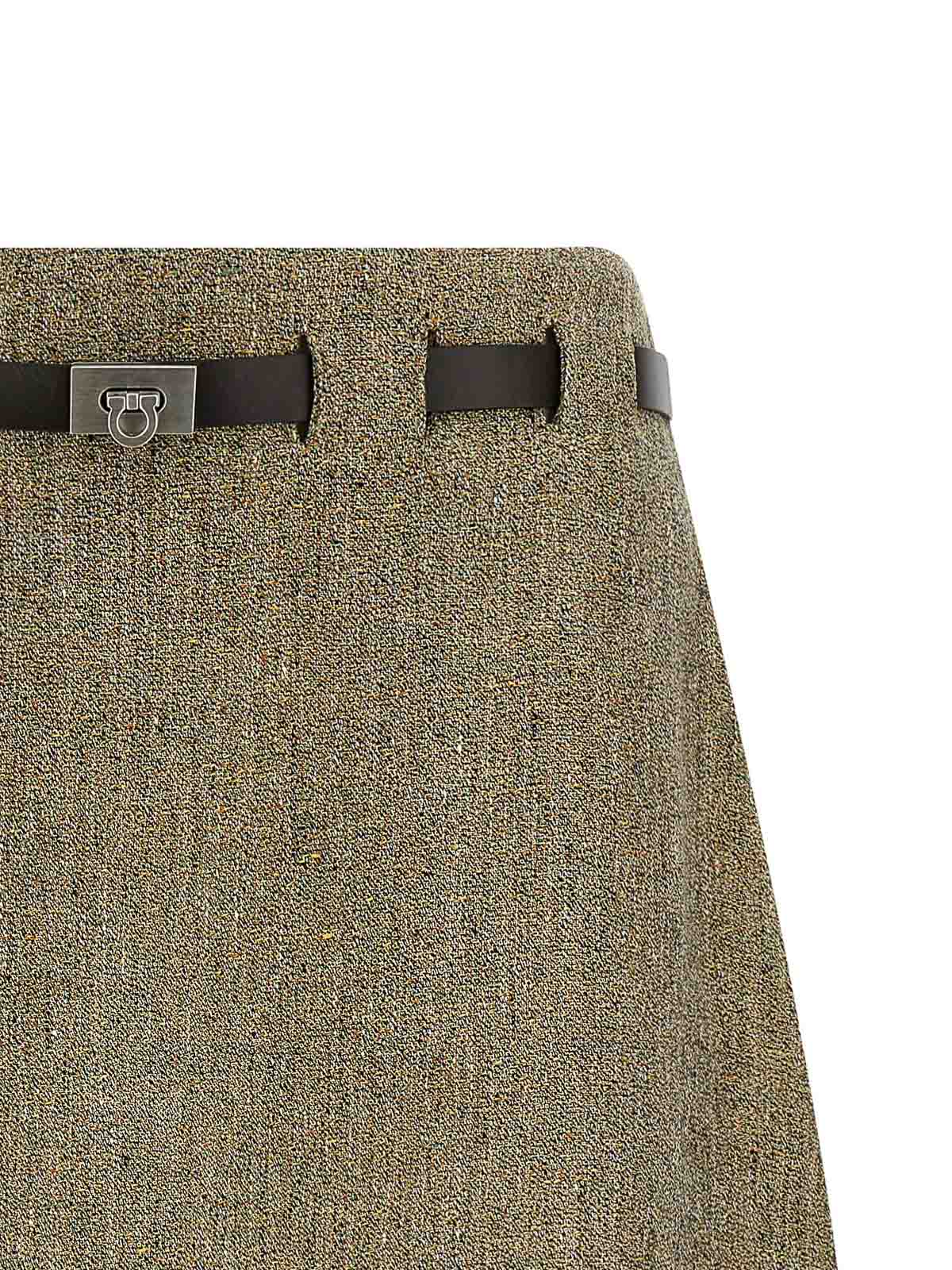 Mini-jupe en lin filé à texture grainée, silhouette légèrement évasée, modèle avec plis au dos, fermeture zippée latérale, boutonnières avec ceinture en cuir avec boucle « gancini » en métal insérée.