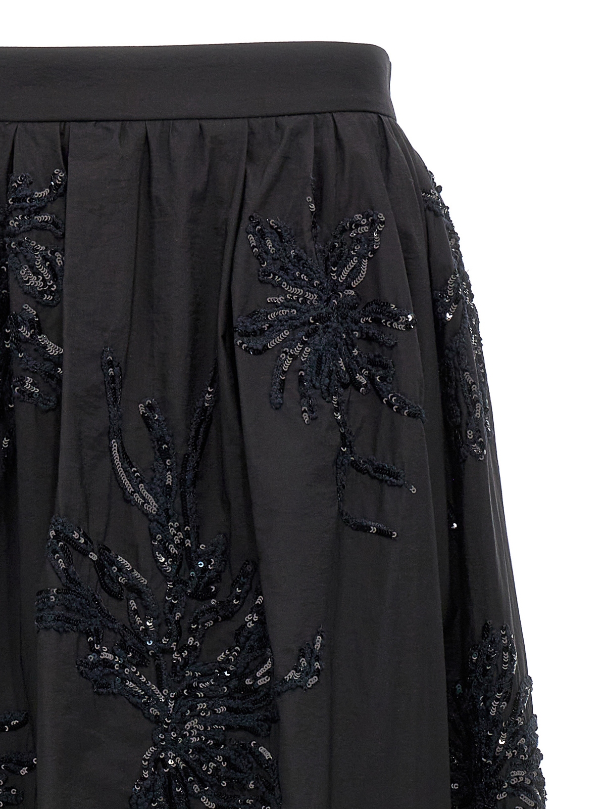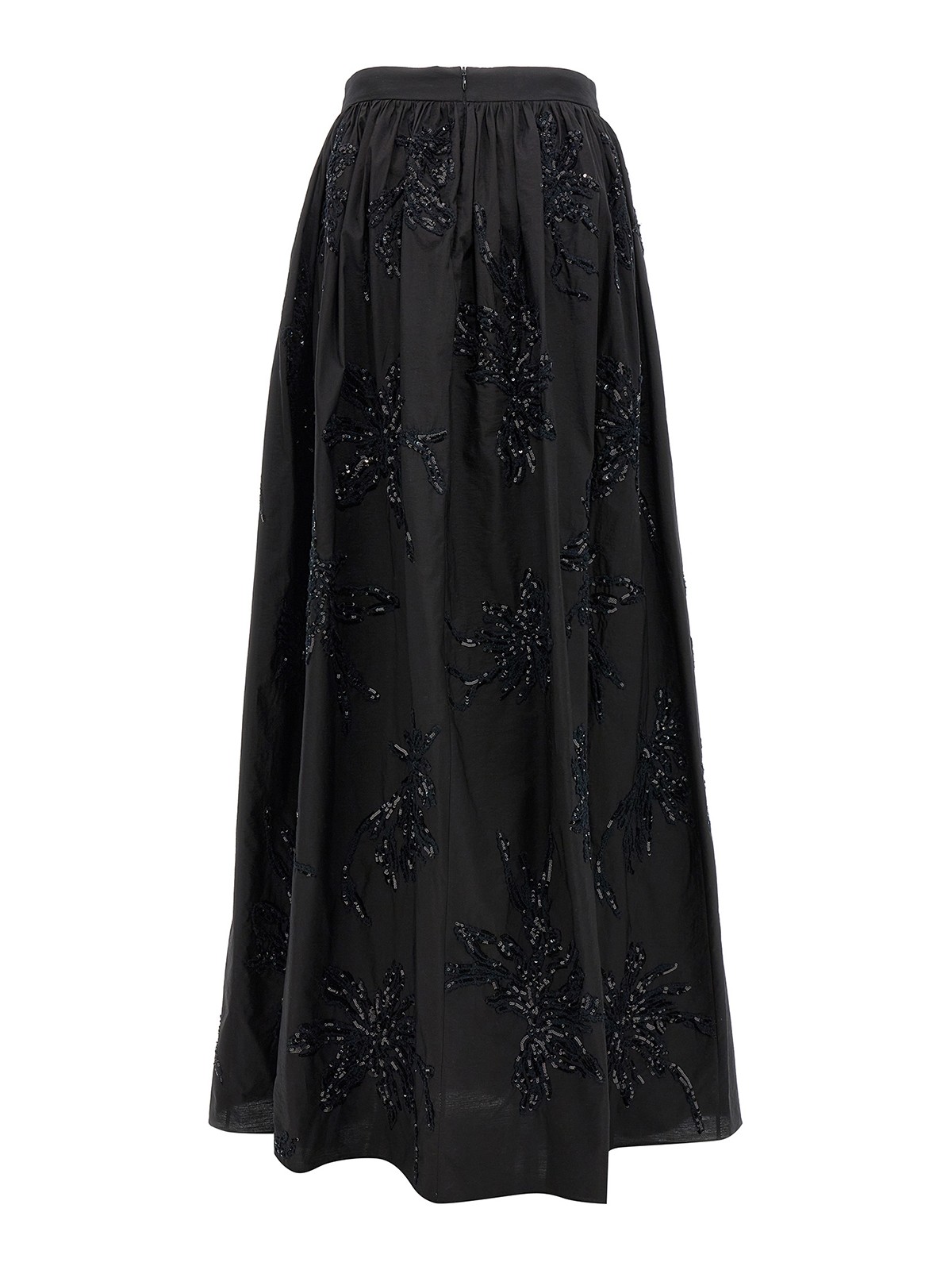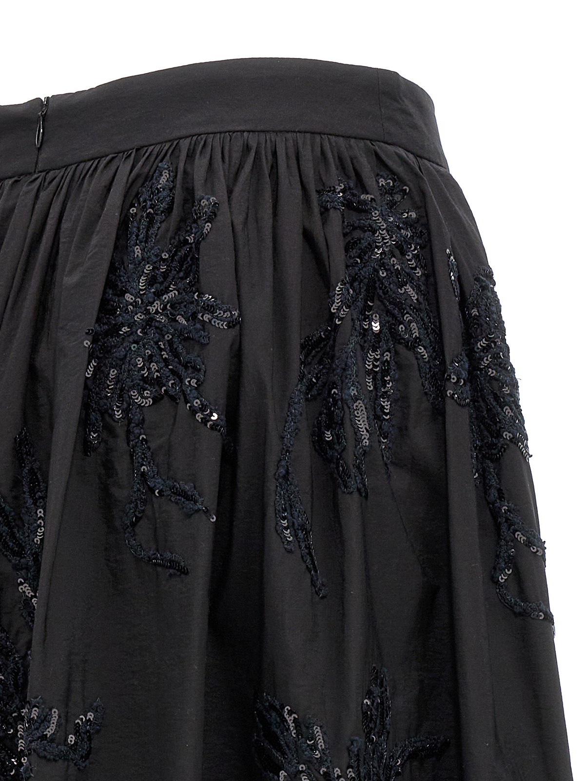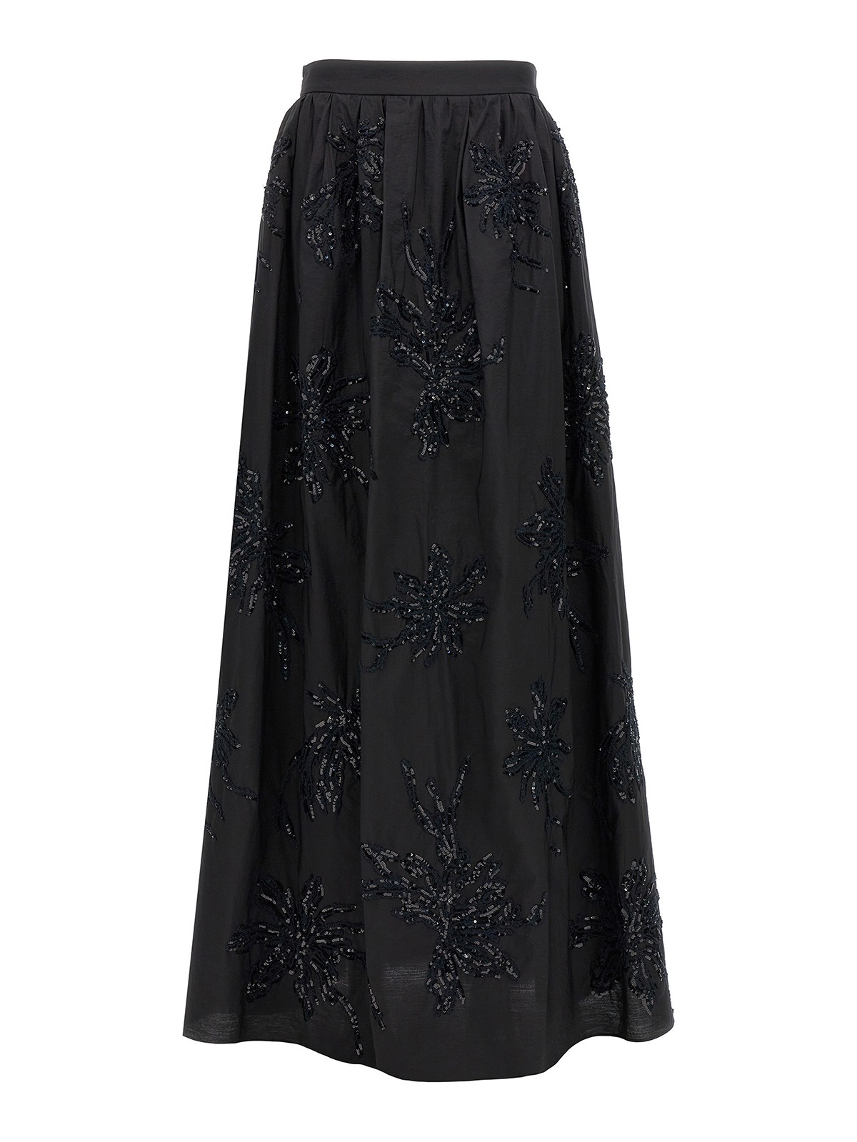 Jupe longue en coton ornée de broderies ton sur ton et de sequins sur l'ensemble ; fermeture zippée au dos