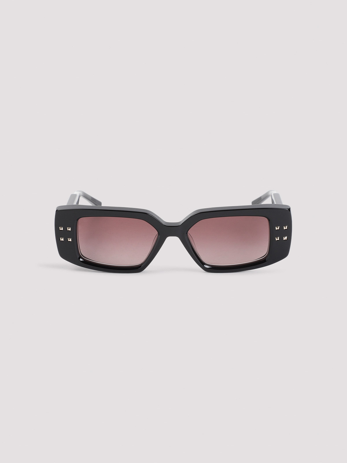 Lunettes de soleil en acétate noir et doré Valentino V-Cinque. Monture en acétate noir, verres rouges de forme rectangulaire, détails de clous emblématiques dorés, branches audacieuses.