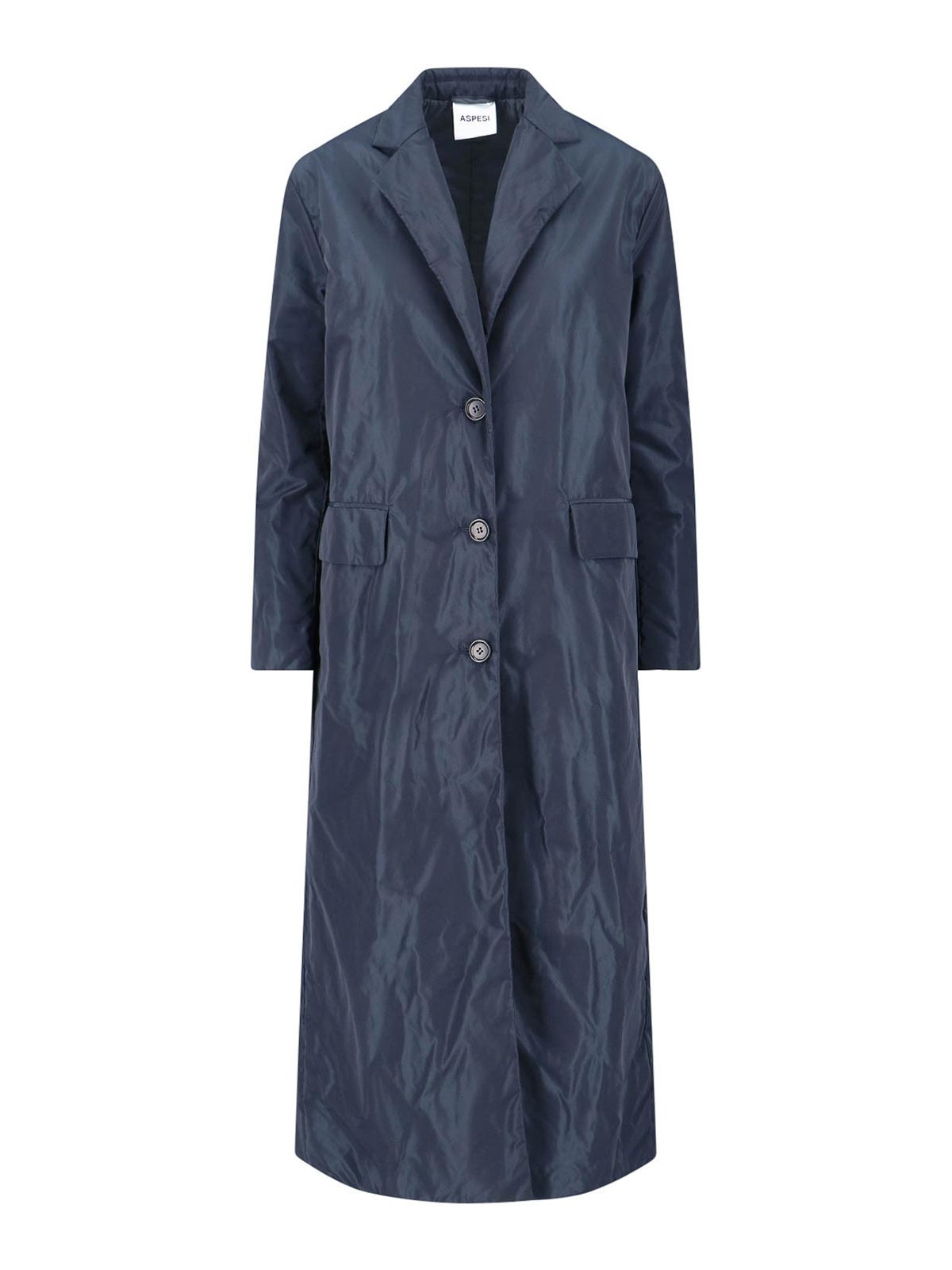 Manteau en tissu technique aspesi, bleu, teinte bleu marine, revers classiques, fermeture boutonnée, deux poches latérales à rabat, poignets boutonnés, fente sur l'ourlet arrière, ourlet droit.