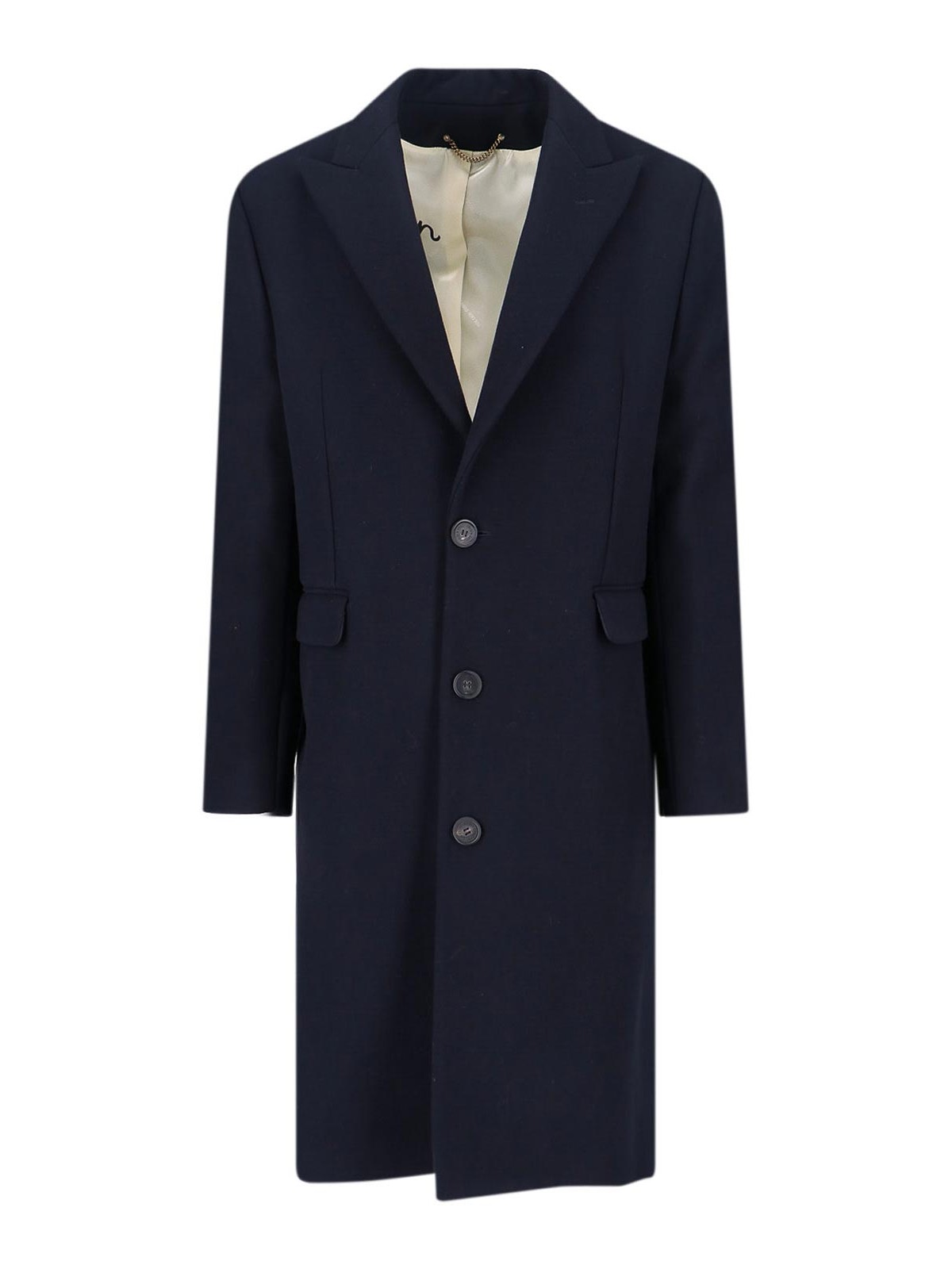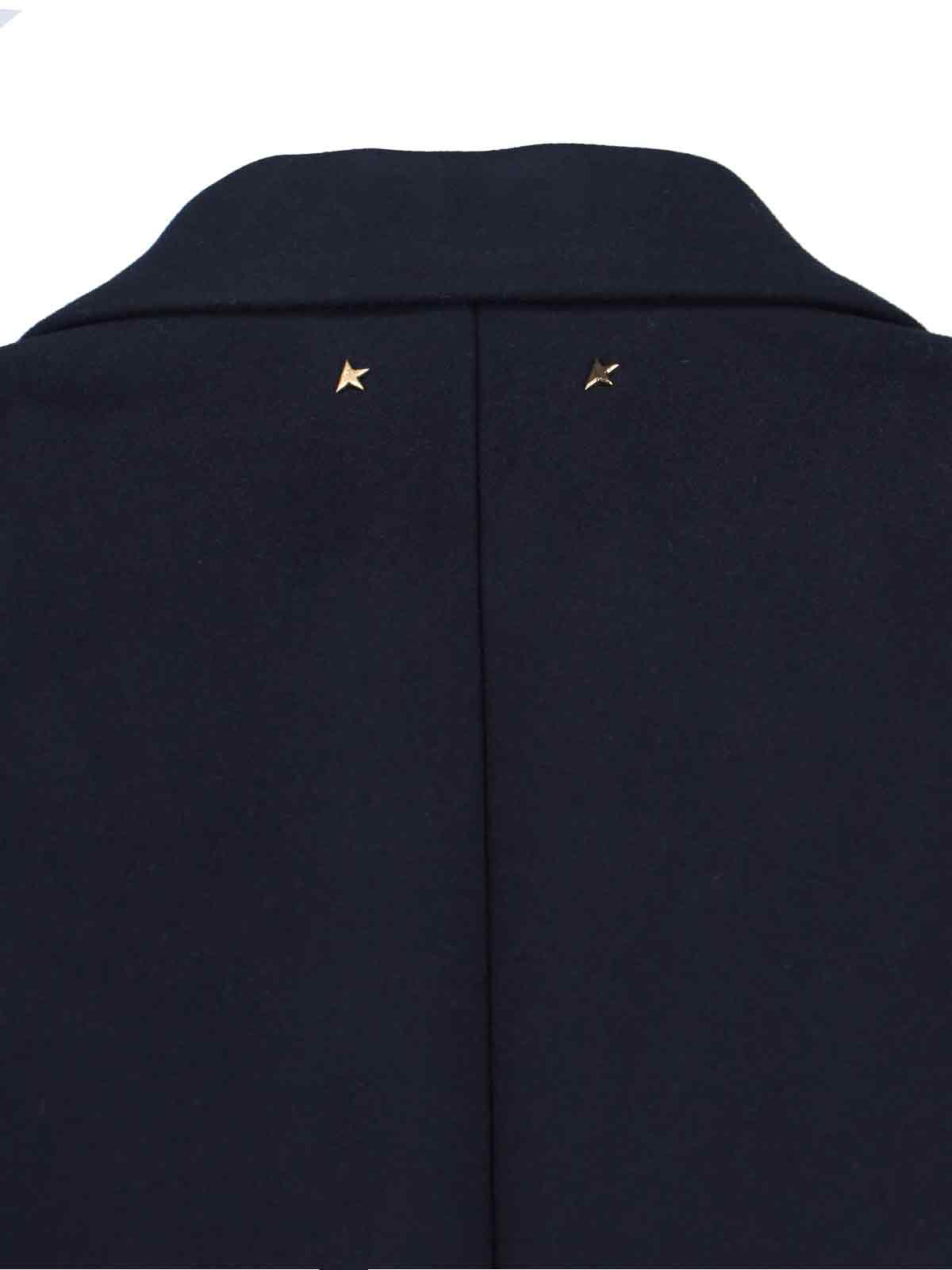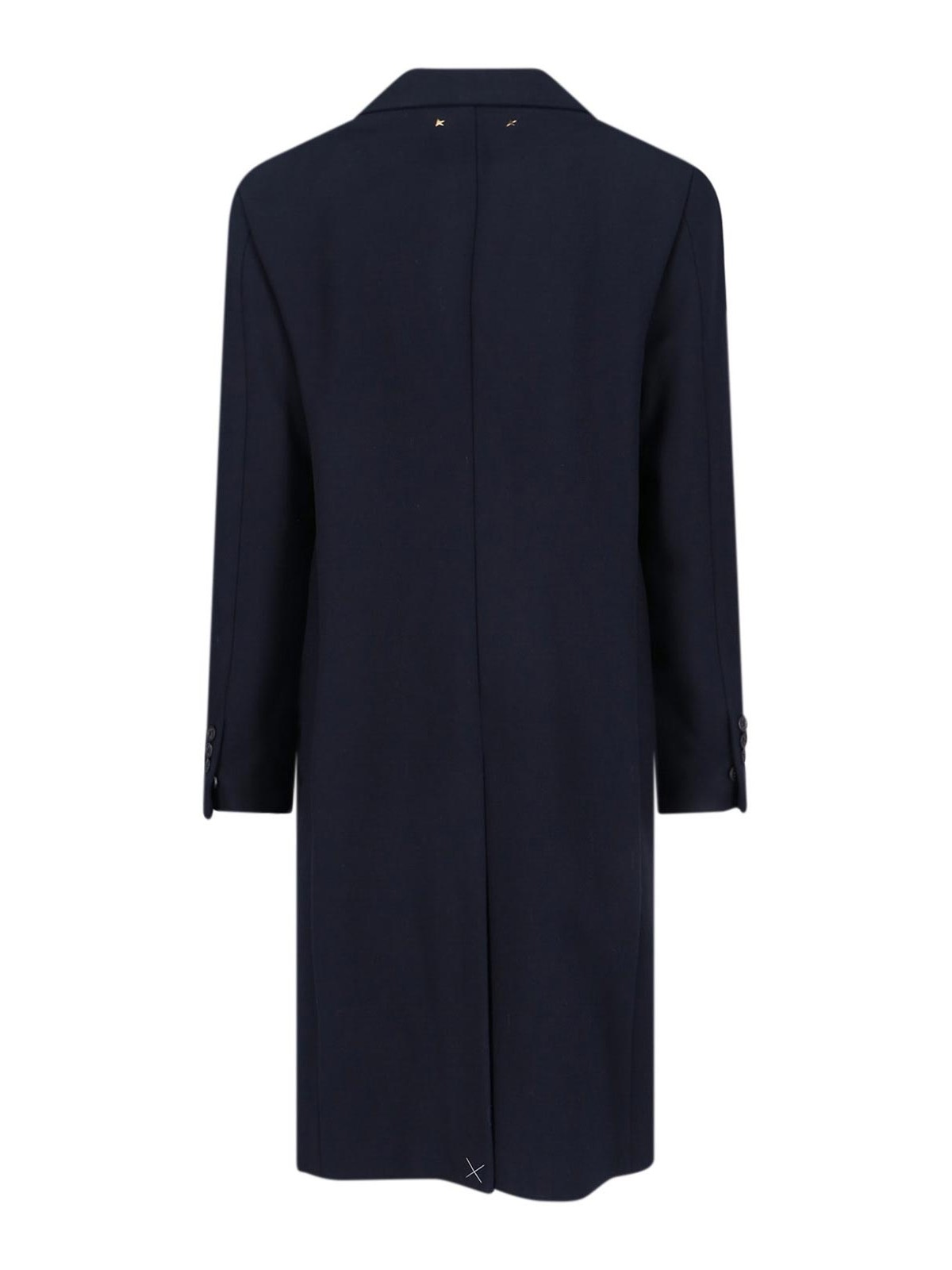 Manteau en laine vierge mélangée Golden Goose, bleu, teinte bleu marine, revers classiques, fermeture boutonnée, deux poches latérales, logo étoile en métal au dos, une poche intérieure boutonnée, grande fente arrière, ourlet droit.