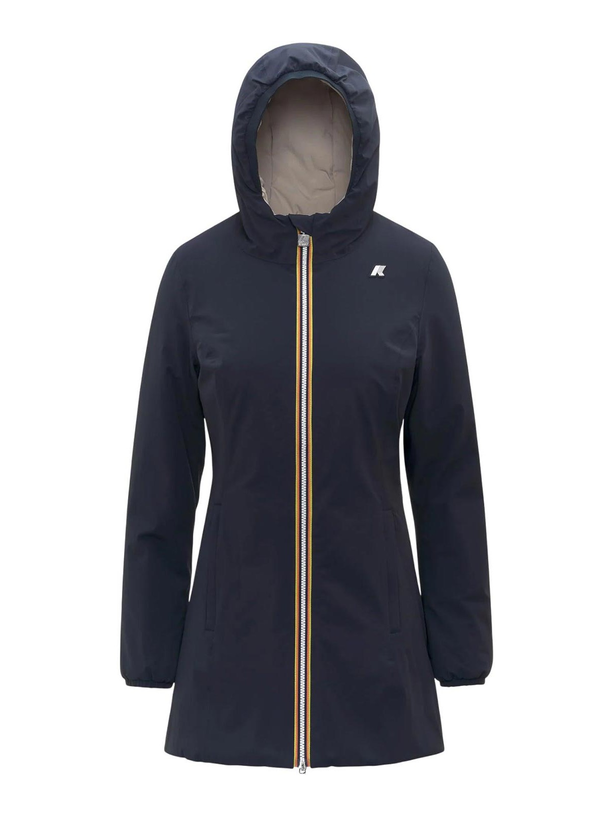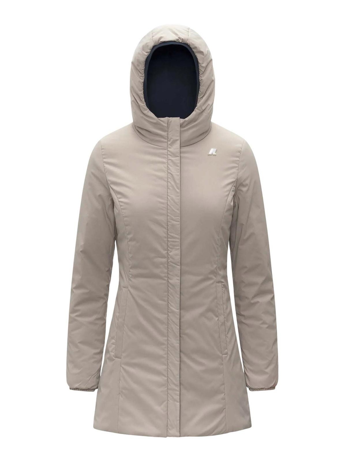 Veste réversible K-way Denise St Warm pour femmes en tissu réversible bleu/beige/coupe ajustée. Veste K-way réversible pour femme de longueur moyenne, inspirée du style fonctionnel de la marque mais réinterprétée dans une touche féminine et contemporaine. le modèle combine un côté en polyester stretch imperméable et respirant et un côté en polyester coupe-vent et hydrofuge de couleur contrastante. le rembourrage léger garantit un degré de chaleur moyen, idéal pour la mi-saison, tandis que les coutures thermosoudées assurent protection et confort en toutes conditions. équipé d'une capuche ajustable avec cordon élastique, fermeture éclair intégrale fermeture, poignets élastiqués, deux poches zippées et deux poches avec boutons-pression, il offre un look élégant et polyvalent, parfait pour la ville et les loisirs. Complété par le logo K-way en silicone blanc, il allie esthétique raffinée et fonctionnalité. veste réversible avec double finition en tissu technique imperméable, hydrofuge, coupe-vent et respirant, côté en polyester coupe-vent et hydrofuge, rembourrage en ouate légère, capuche réglable à température moyenne avec cordon élastique, fermeture zippée complète, poignets élastiqués, deux poches zippées + deux poches avec boutons-pression coutures thermosoudées, coupe ajustée, couleurs : bleu, profondeur/ cachemire beige. Entretien du produit : lavage délicat, max. 30 °C. Ne pas utiliser de javel, ne pas sécher au sèche-linge, repasser à basse température, ne pas nettoyer à sec, laver séparément, protéger les accessoires lors du lavage. Composition : extérieur : 92 % nylon, 8 % élasthanne, doublure : 100 % polyester, rembourrage : 100 % polyester