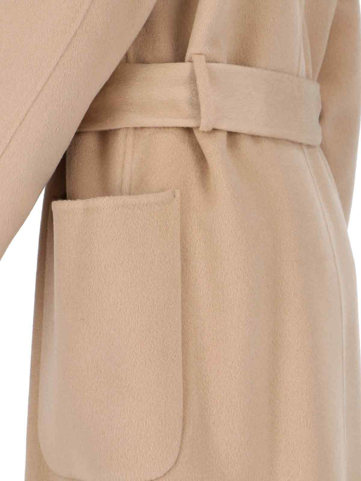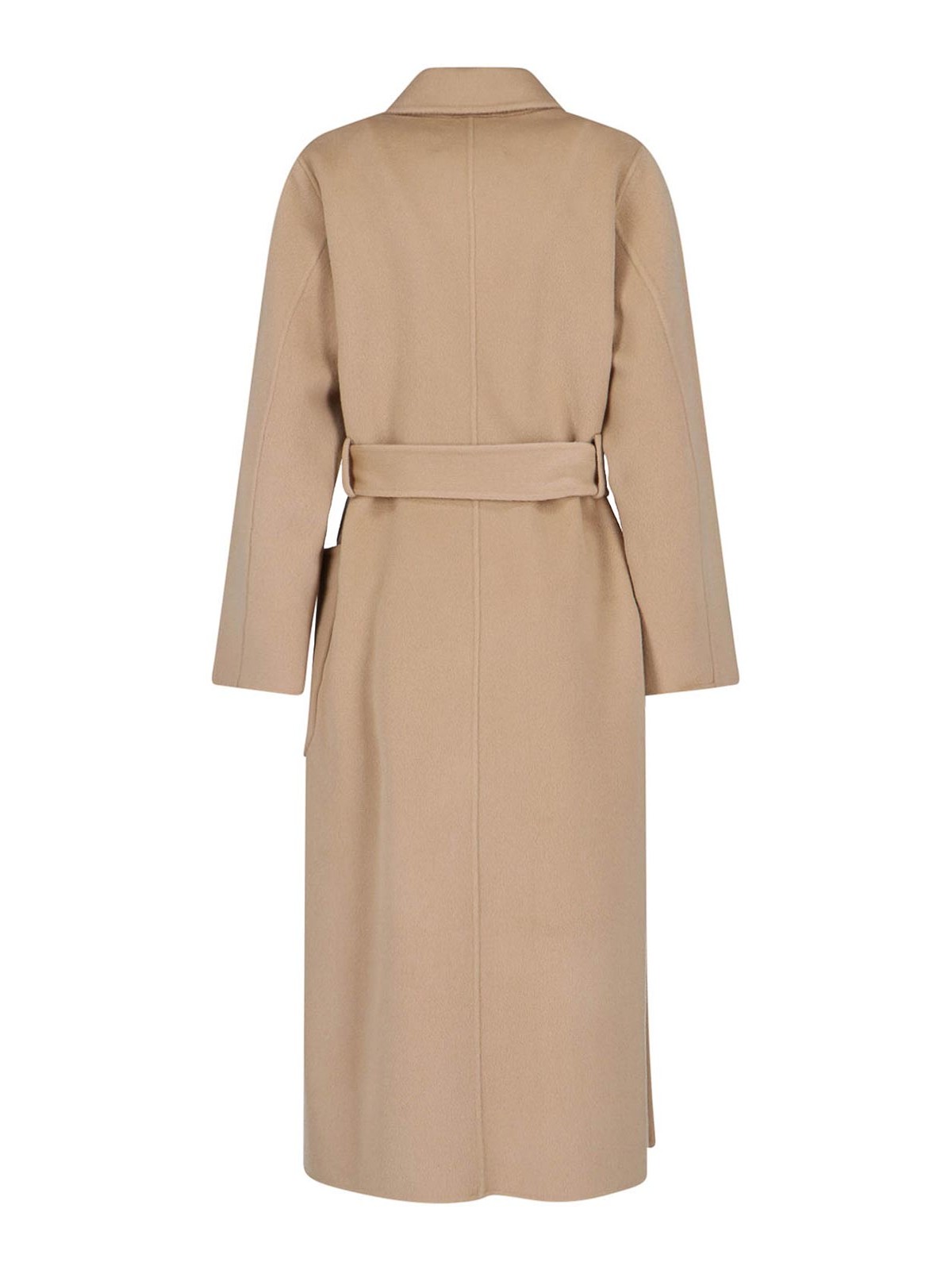 Manteau Celia Ivy Oak, en laine beige, revers classiques, ceinture à la taille, détails des passants de ceinture, deux poches latérales ouvertes, ourlet droit.