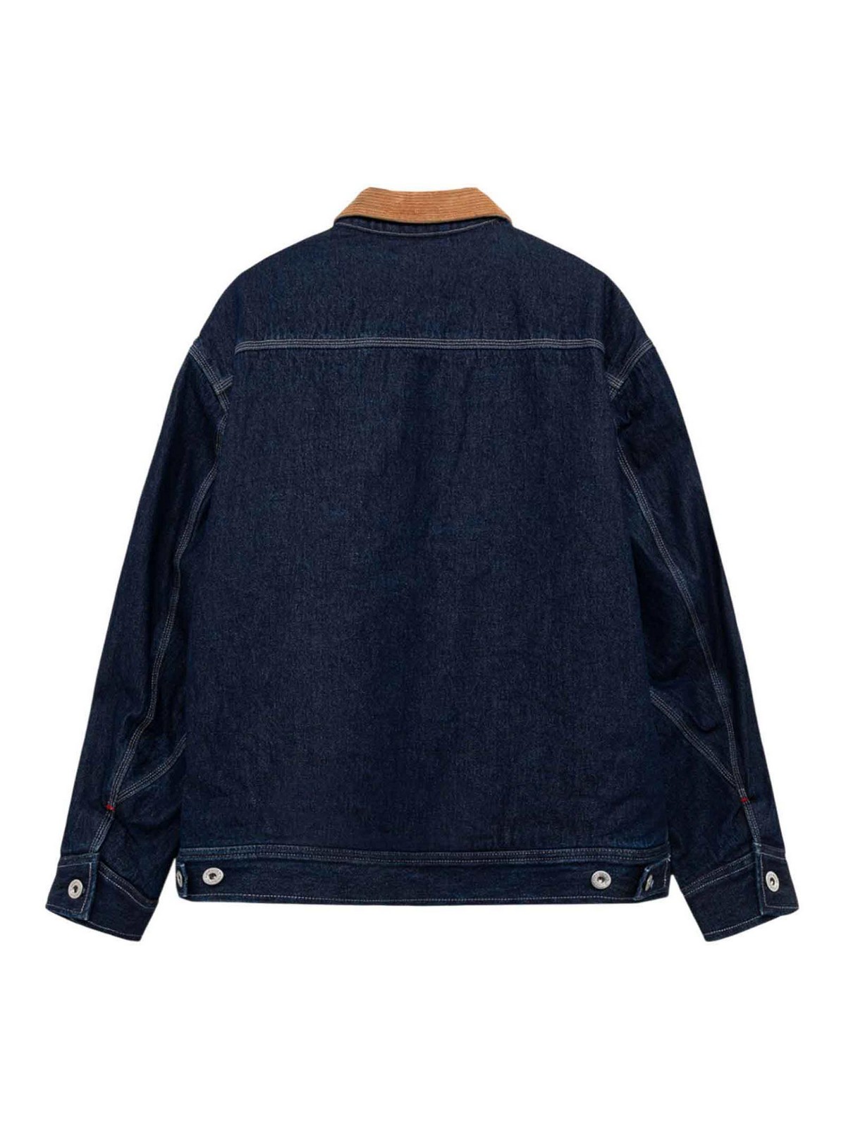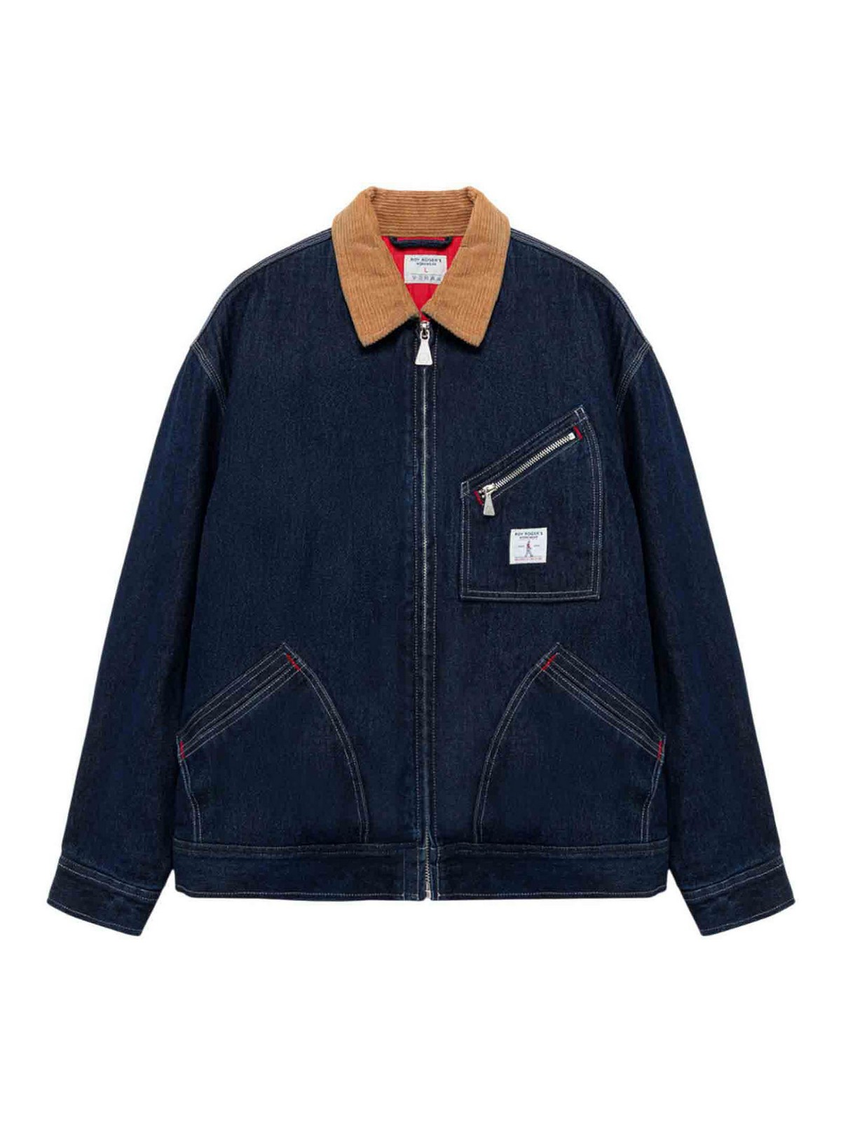 Veste de travail en jean Roy Rogers pour homme avec col en velours Veste pour homme inspirée des vestes de travail classiques, fabriquée en denim 100 % coton avec délavage foncé et coutures contrastantes. le col en velours côtelé ajoute une touche rétro distinctive, tandis que la fermeture avant avec fermeture éclair et tirette zippée de marque garantissent praticité et style. le modèle est complété par une poche poitrine zippée et l'étiquette Roy Rogers appliquée, ainsi que des poches asymétriques sur le devant qui améliorent sa fonctionnalité caractère. La coupe classique assure confort et liberté de mouvement, parfaite pour look décontracté et authentique avec une touche de vêtement de travail.
