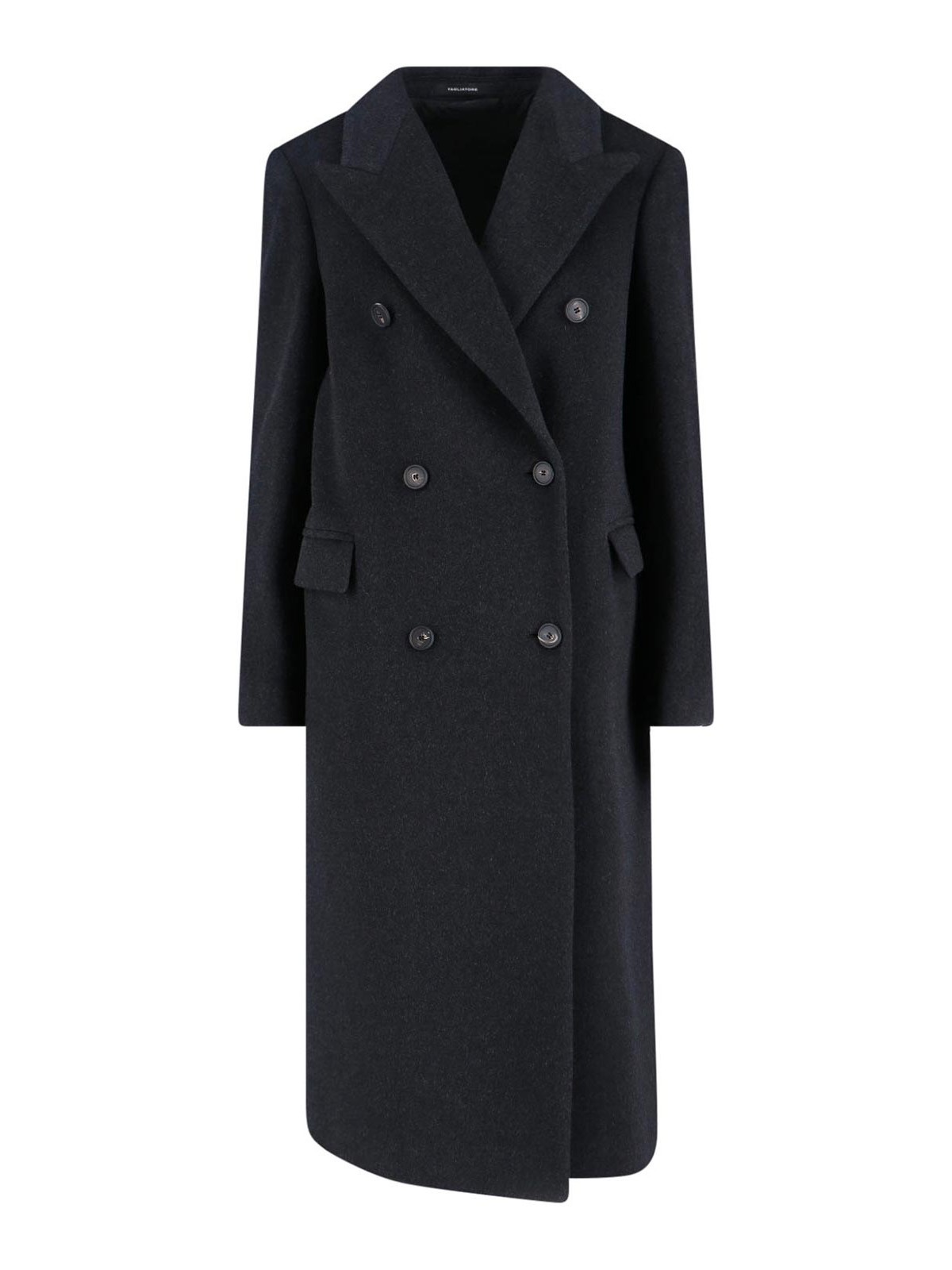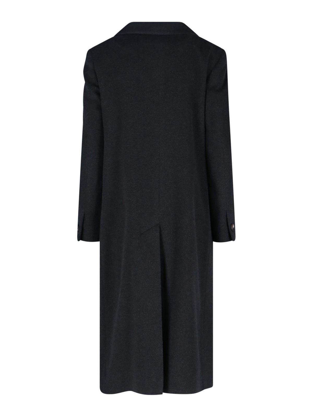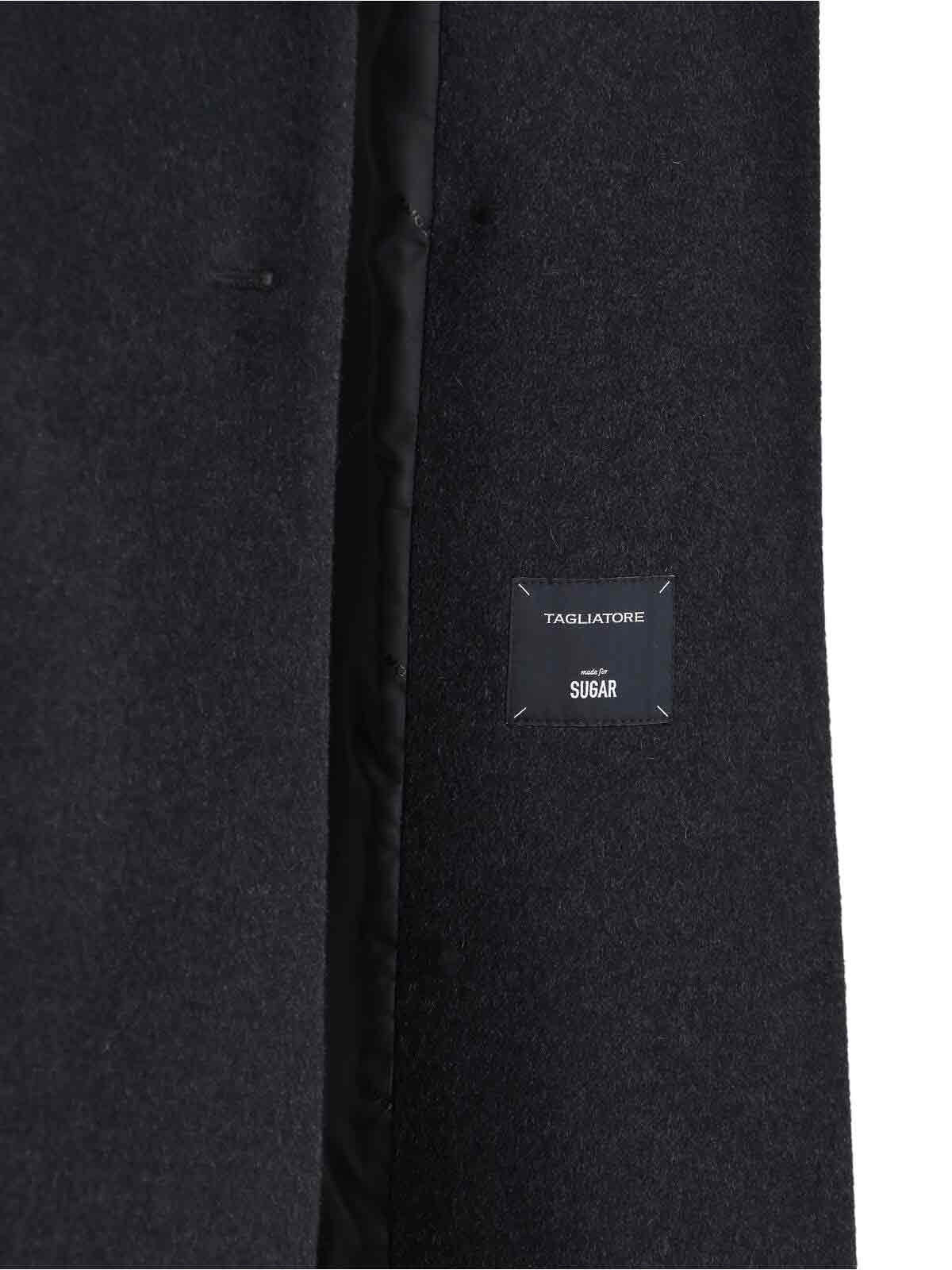 Manteau midi en cachemire Jole Tagliatore, fabriqué exclusivement pour le sucre, en cachemire gris, revers pointus, fermeture boutonnée, poignets boutonnés, deux poches latérales à rabat, fente centrale profonde au dos, étiquette logo interne, ourlet droit.