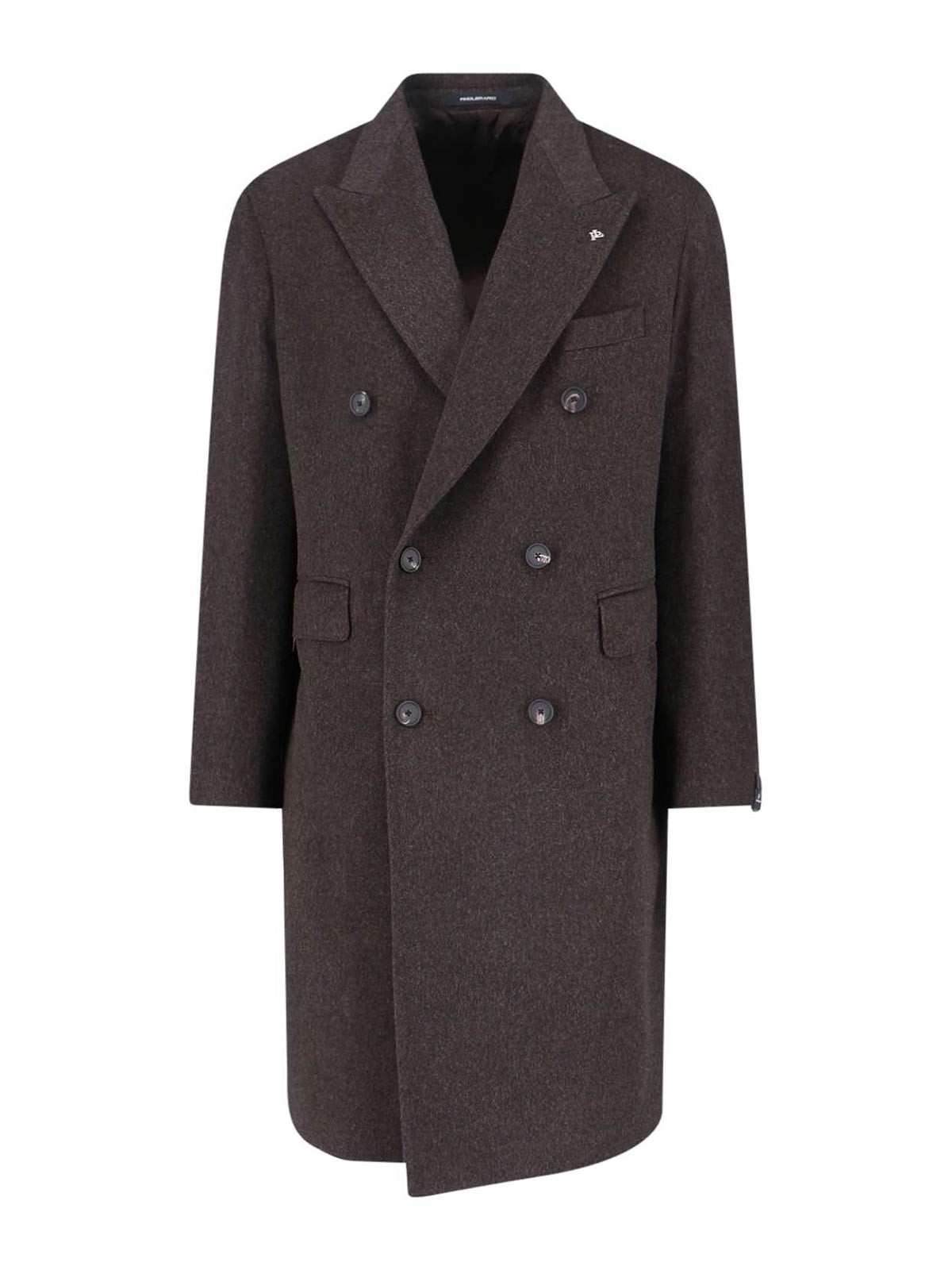 Manteau tagliatore Pino Lerario à double boutonnage, en laine vierge marron, revers pointus, logo en métal argenté, fermeture boutonnée, poche poitrine, deux poches latérales à rabat, fente centrale profonde dans le dos, poignets boutonnés, ourlet droit.