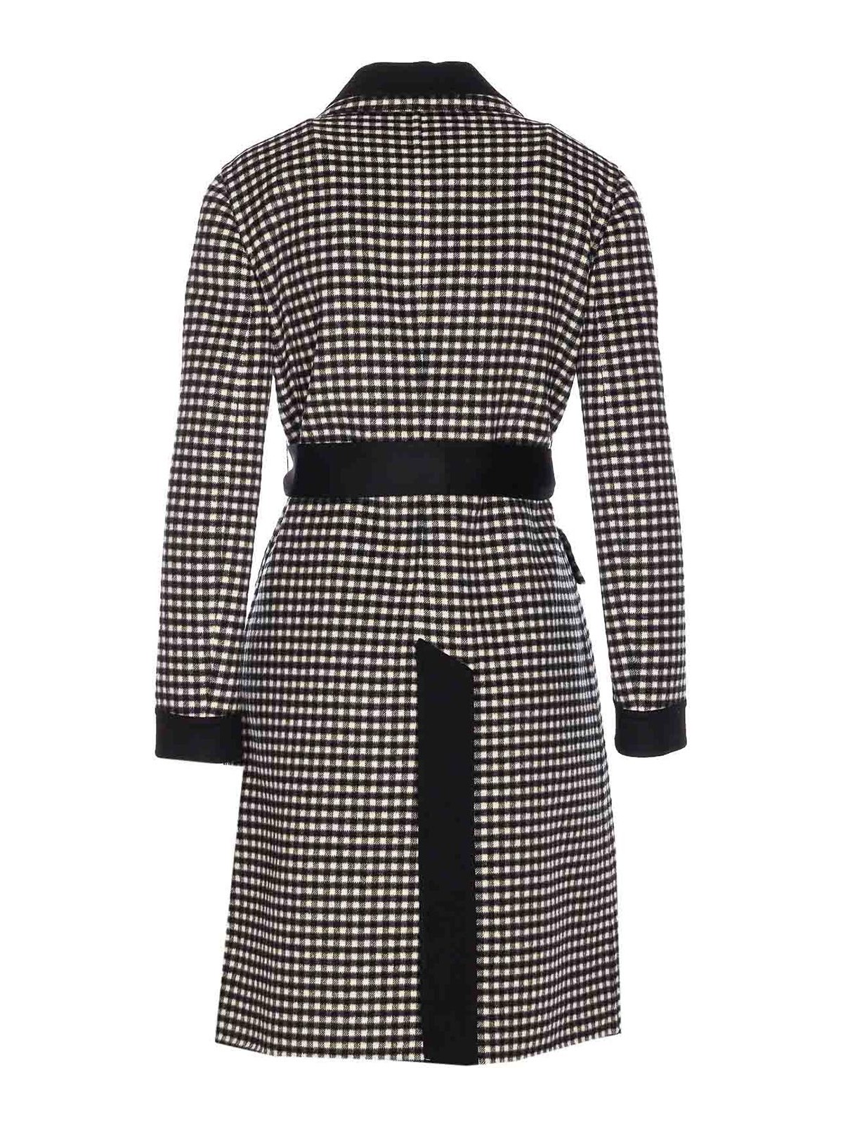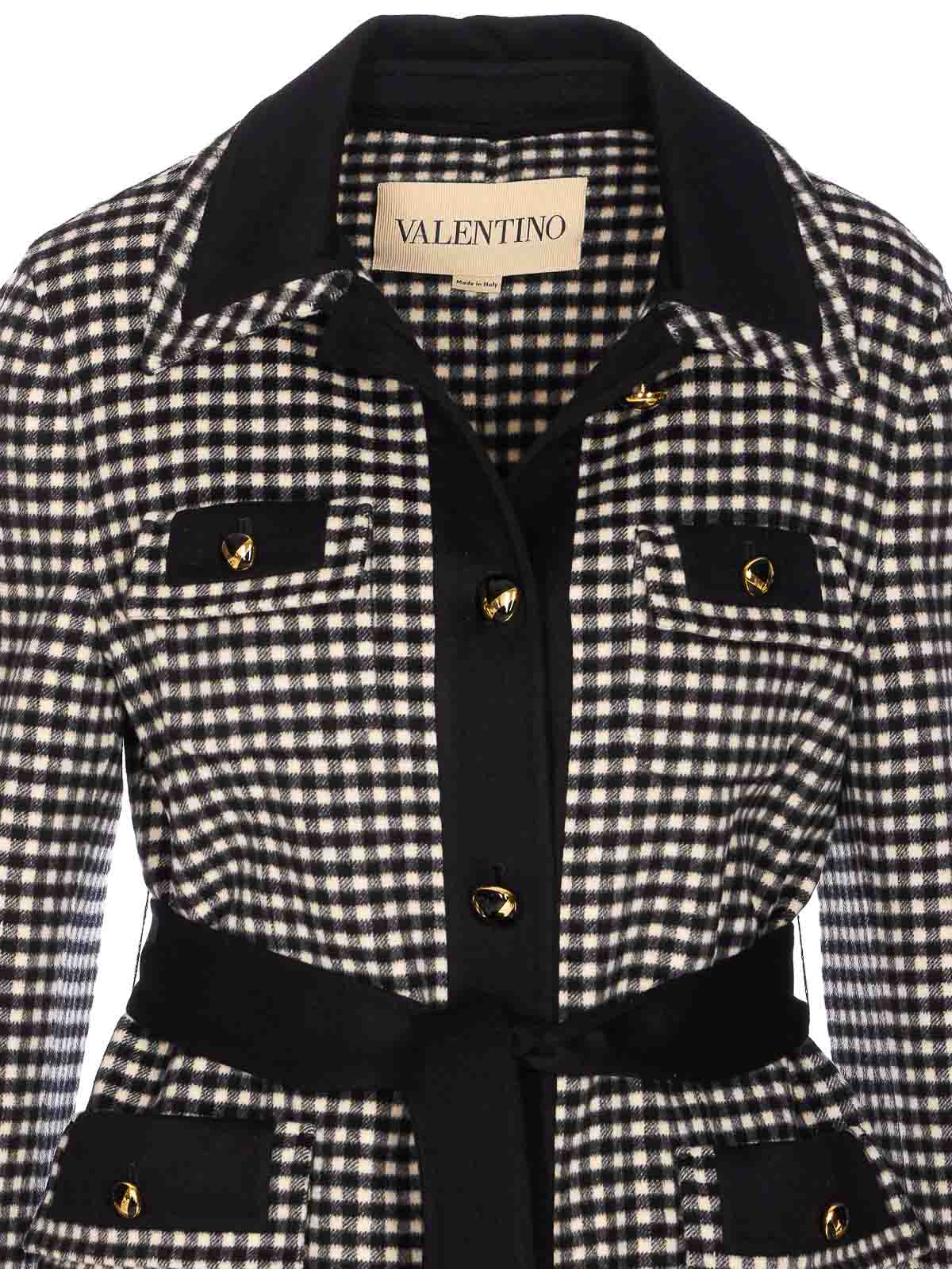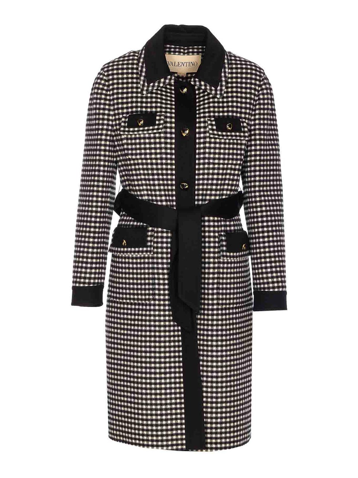 Manteau à carreaux noir et blanc Valentino avec boutons frontaux, col régulier, ceinture à la taille, manches longues et poches