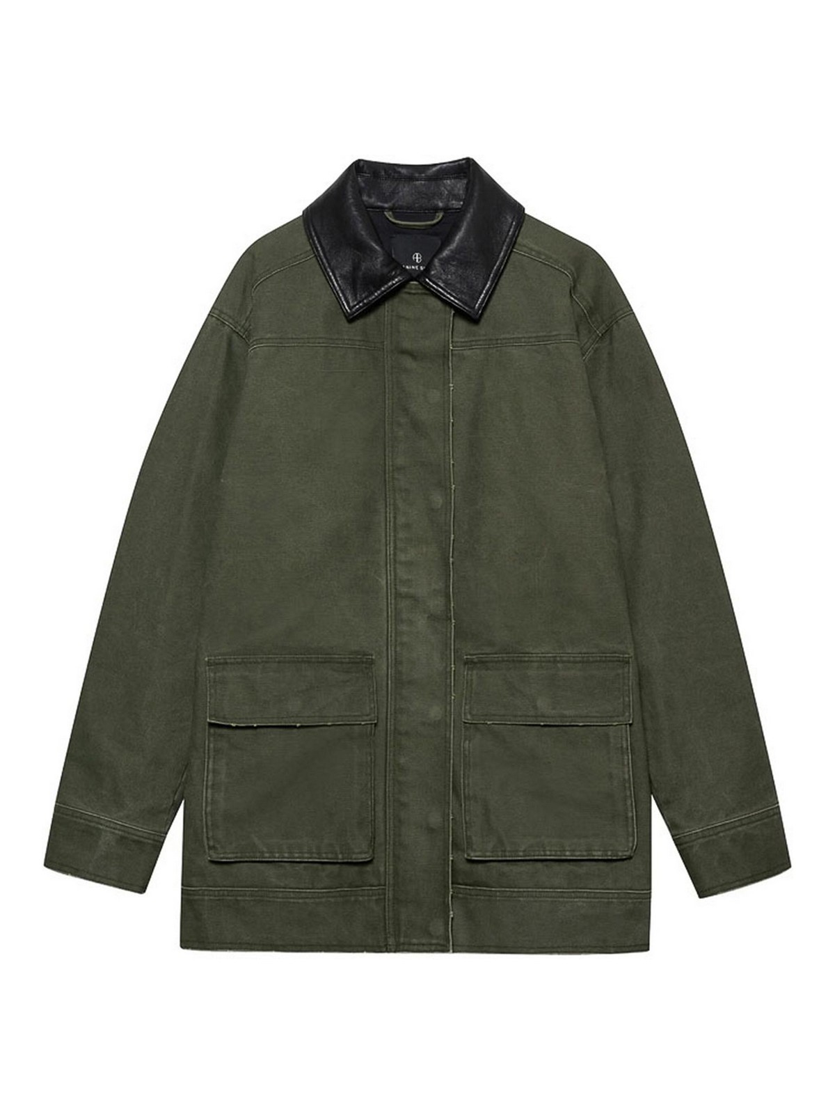 Faux vert militaire, col, poches plaquées, bouton-pression et fermeture éclair cachés