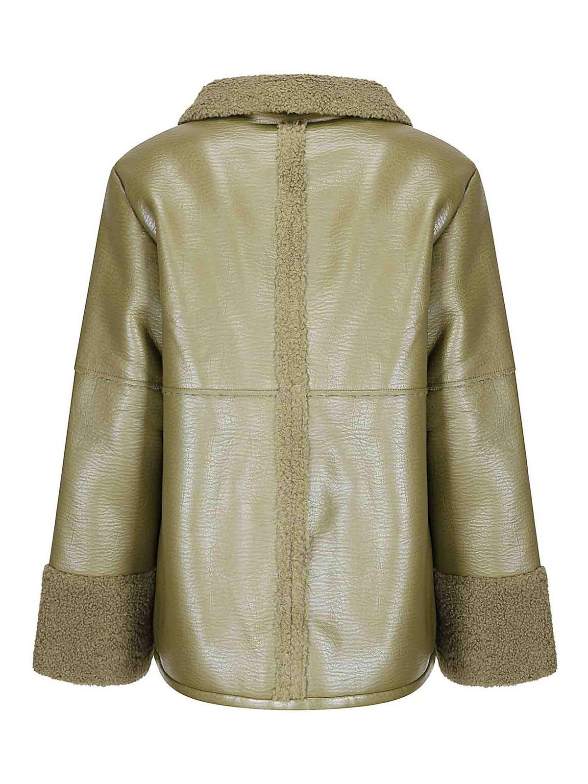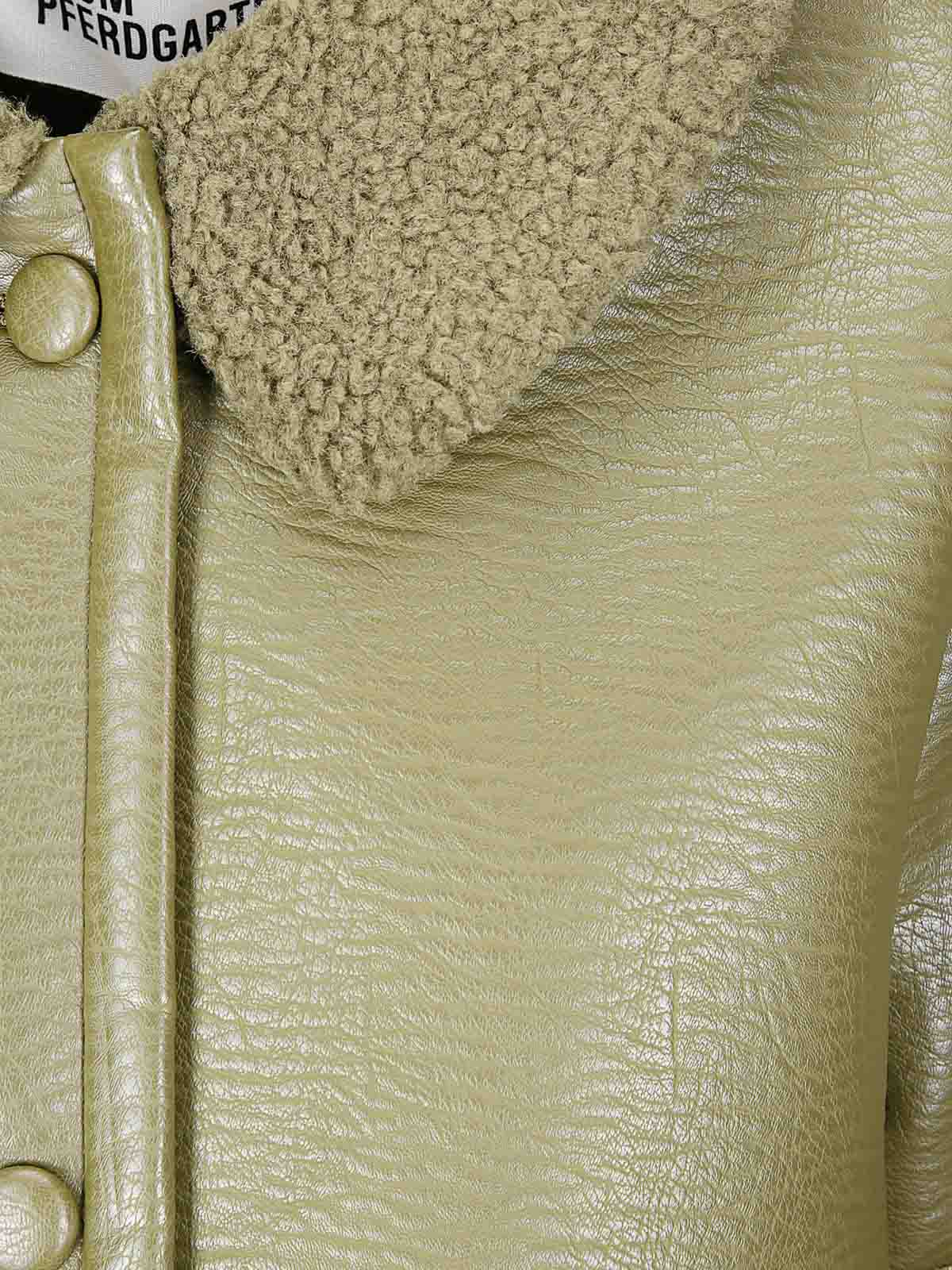 Manteau court vert en peau de mouton avec fourrure synthétique, grandes poches avant, coupe oversize.