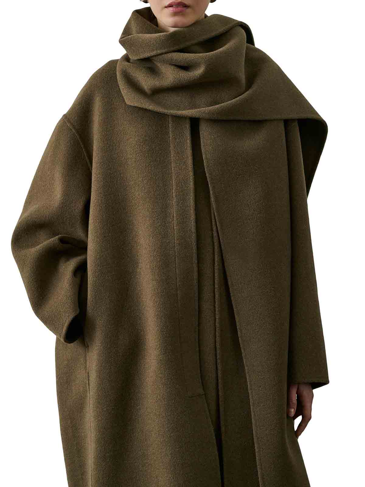 Manteau long réversible, coupe ample, mi-long, col rond, bouton, deux poches latérales, grand foulard intégré amovible avec boutons, épais réversible, gris