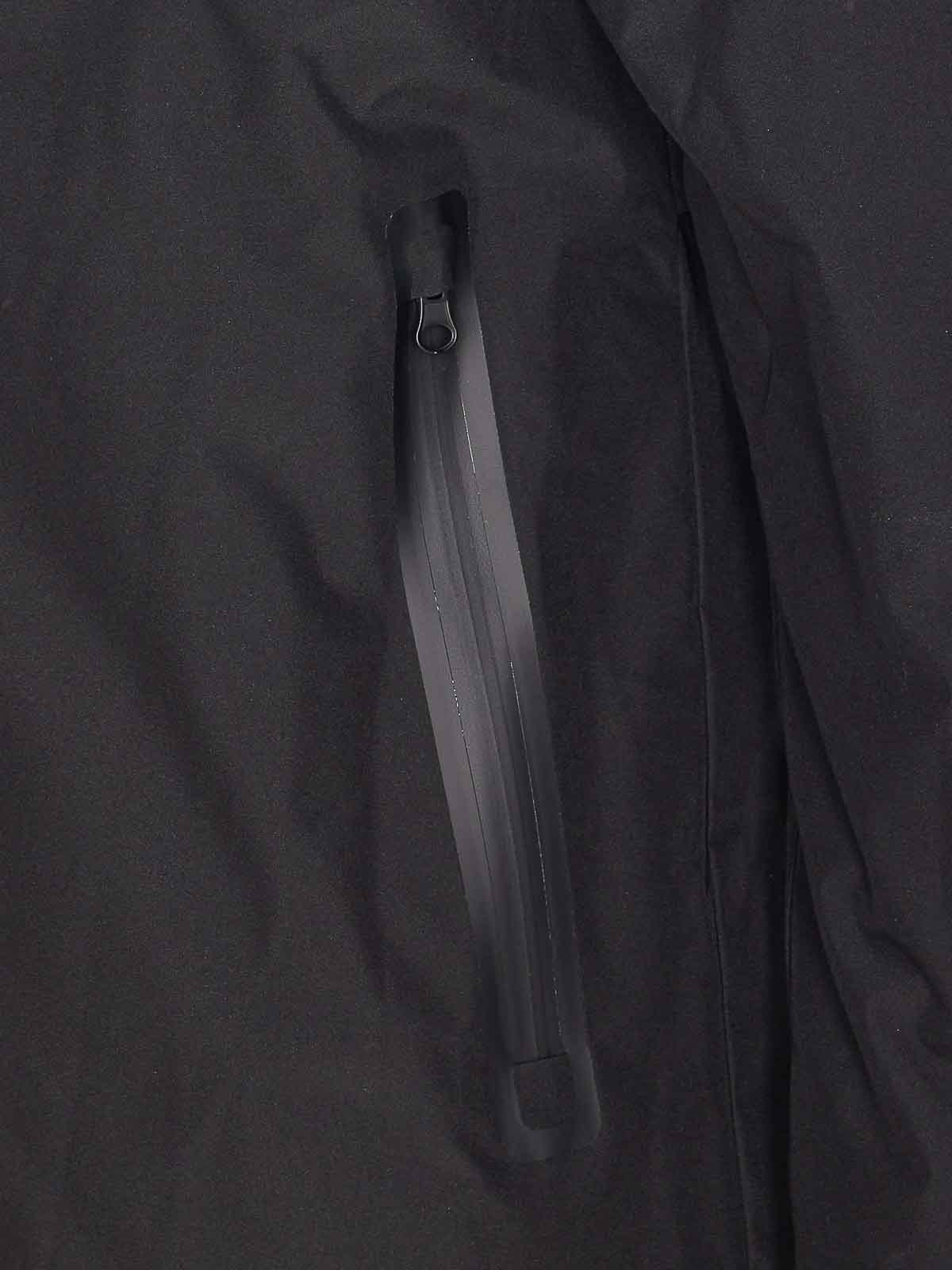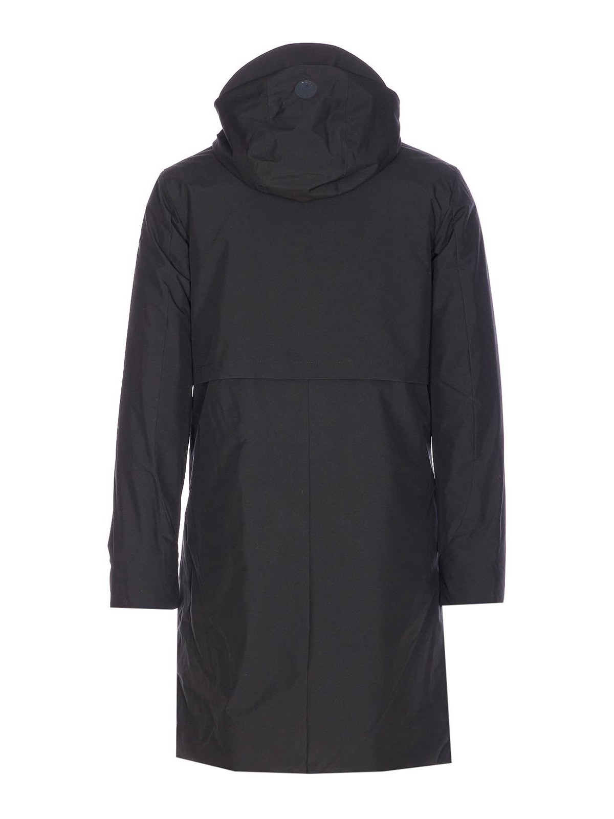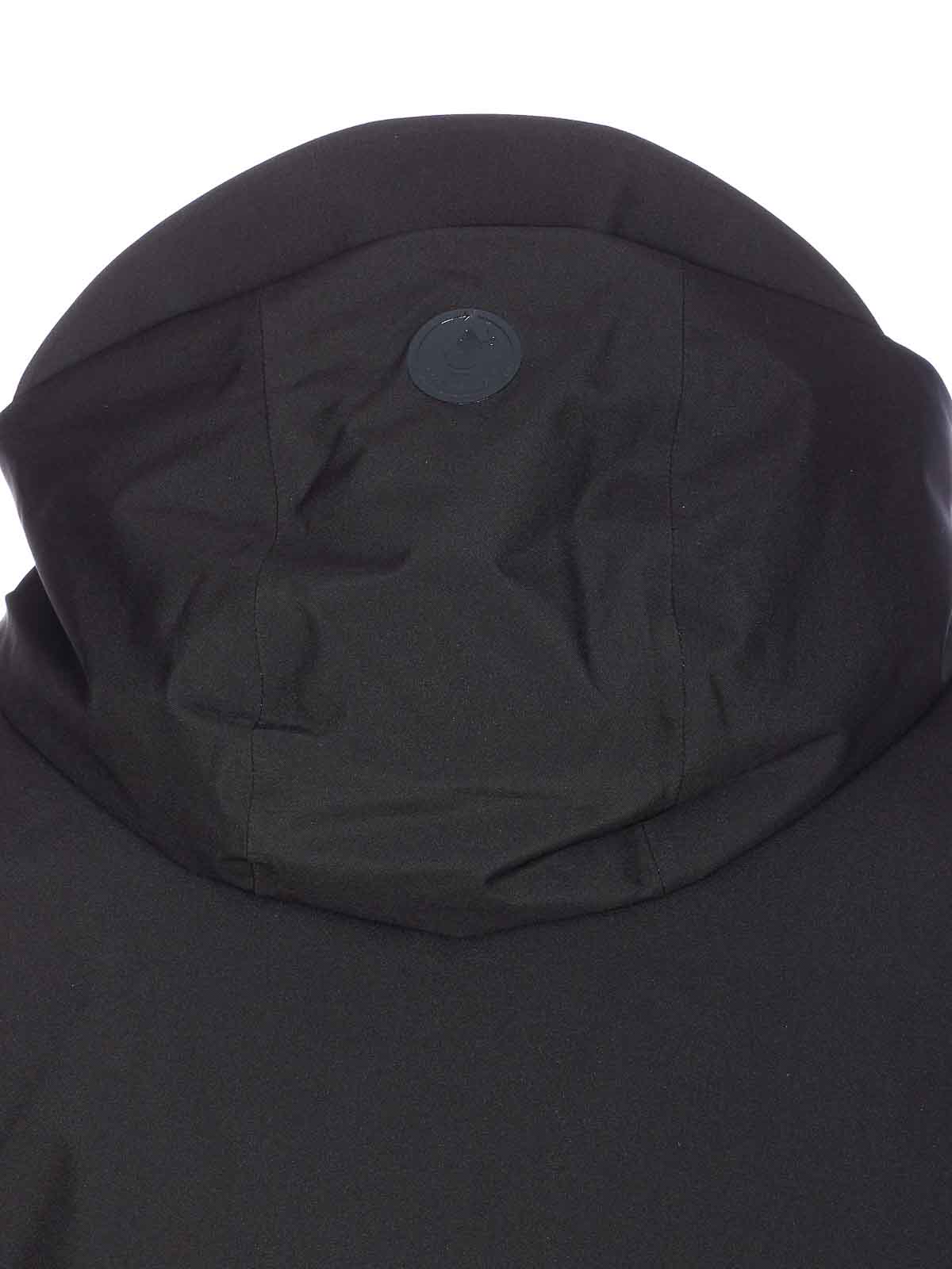 Manteau noir Save the duck avec fermeture zippée et boutonnée, manches longues, poches zippées, capuche rembourrée