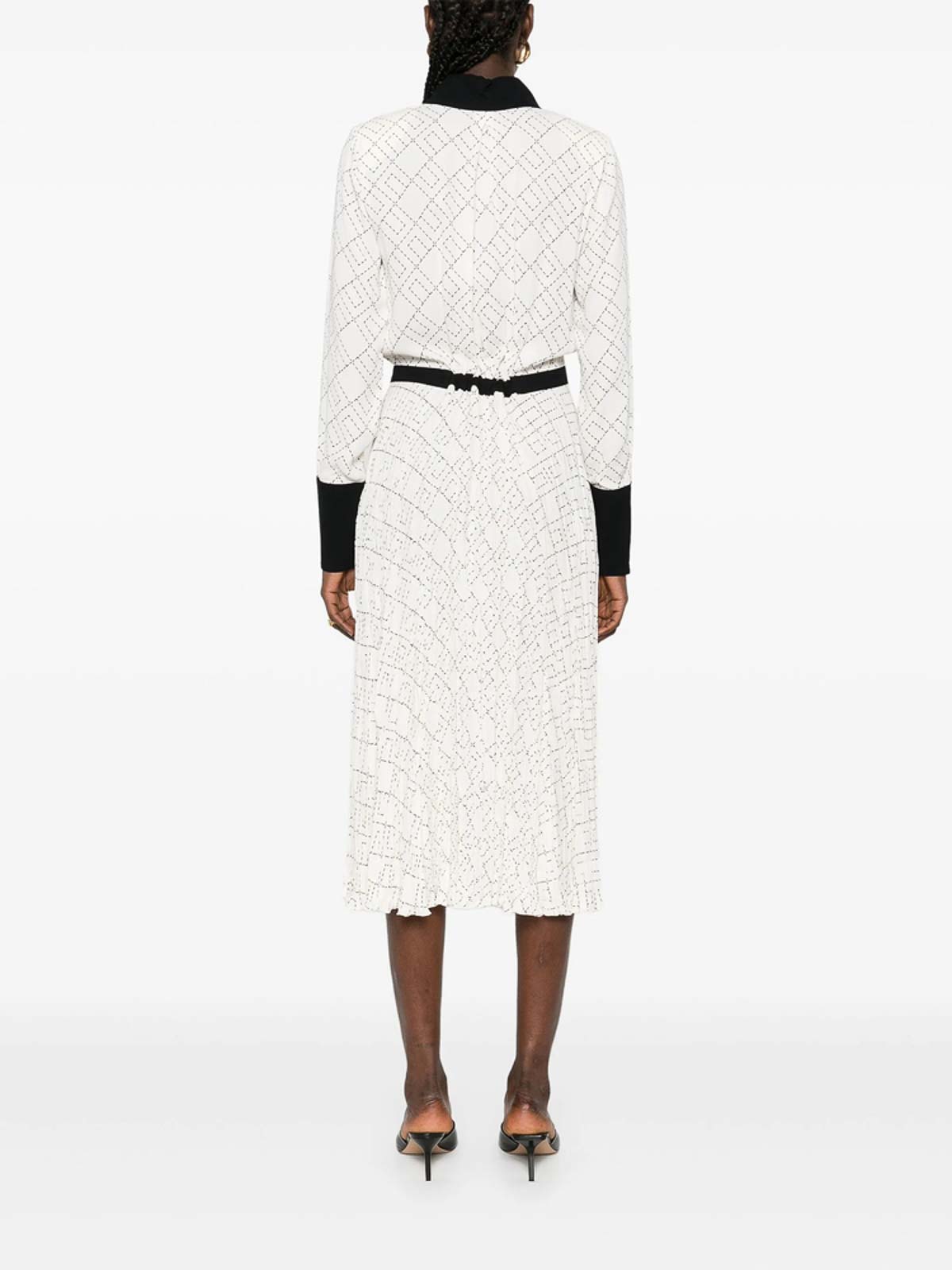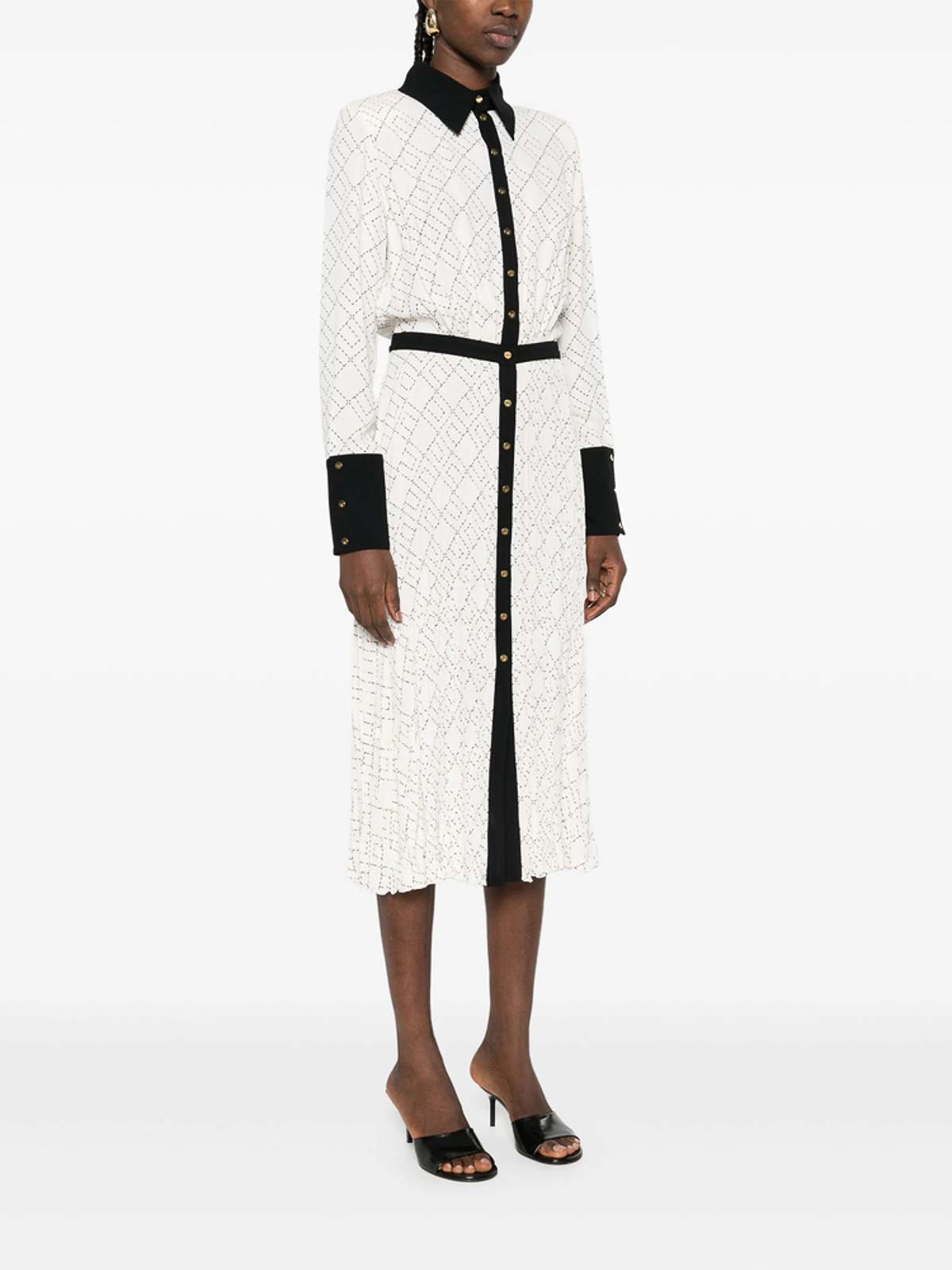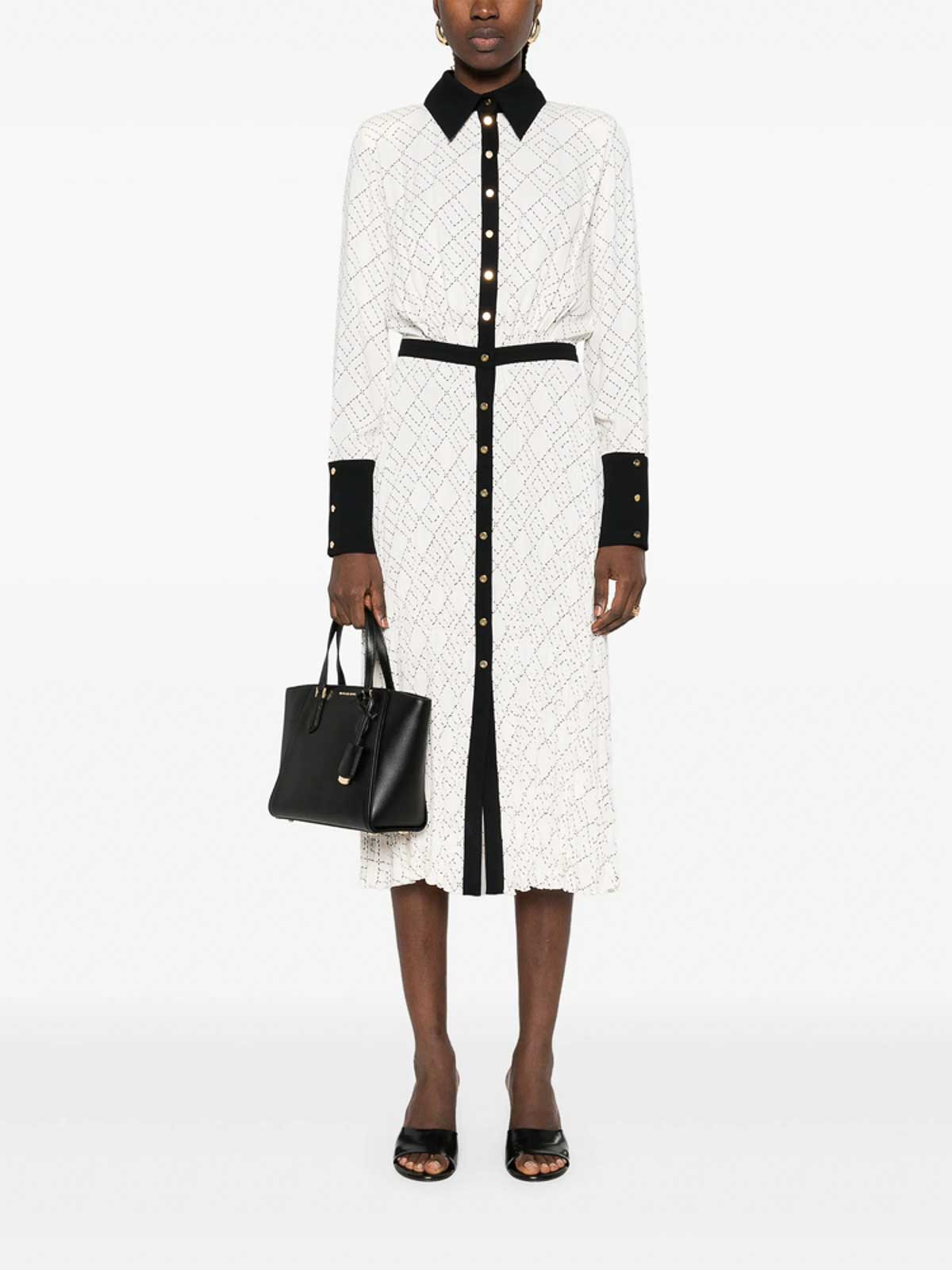 Imprimé géométrique blanc cassé, panneau noir, boutons ton sur ton, poignets noirs, manches longues