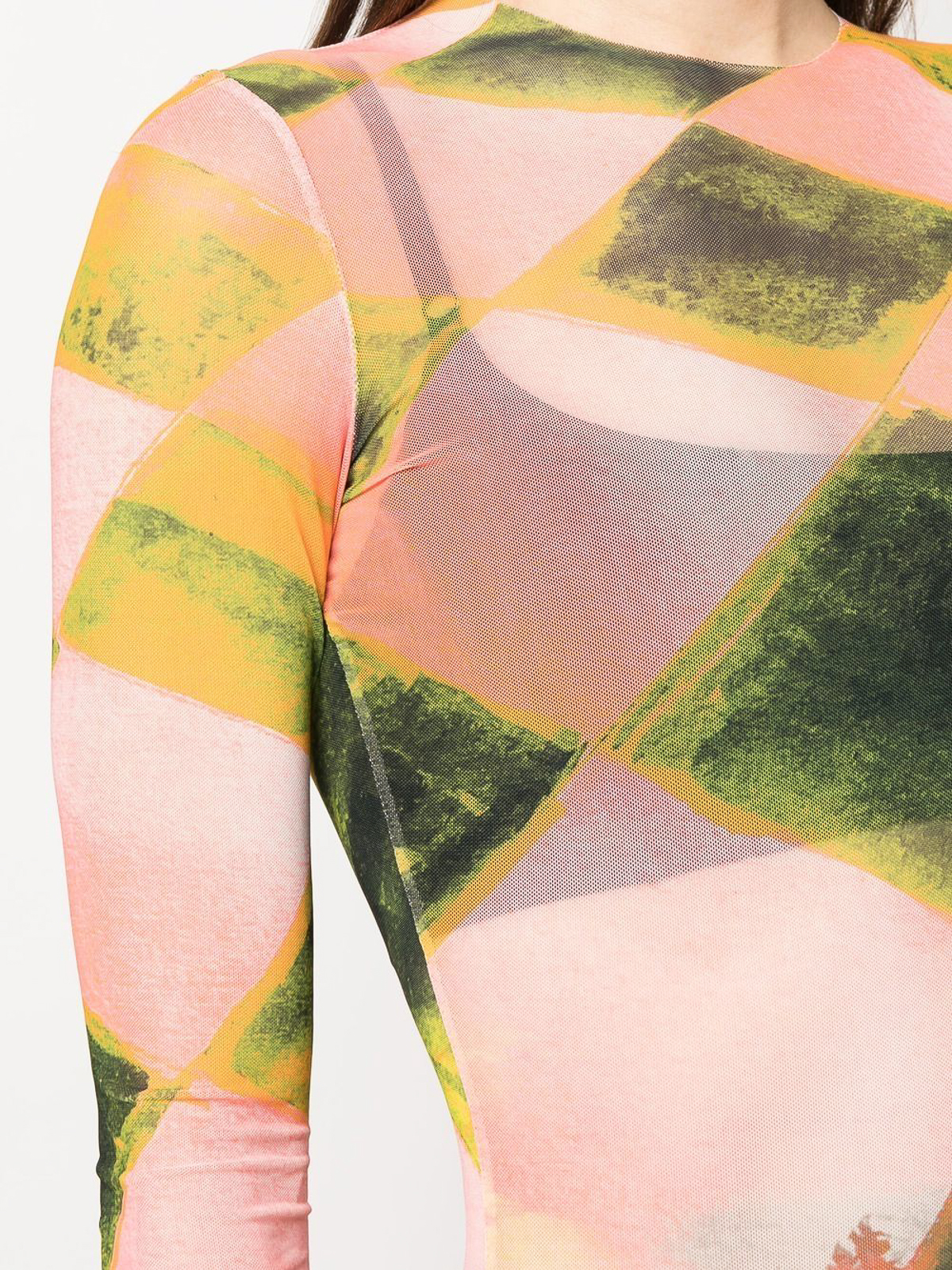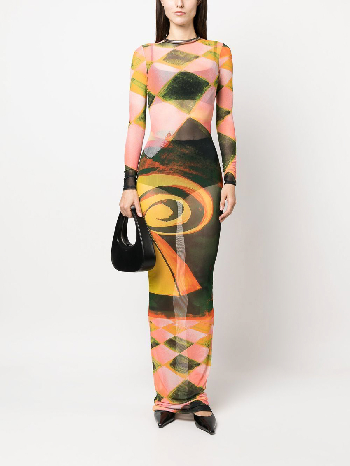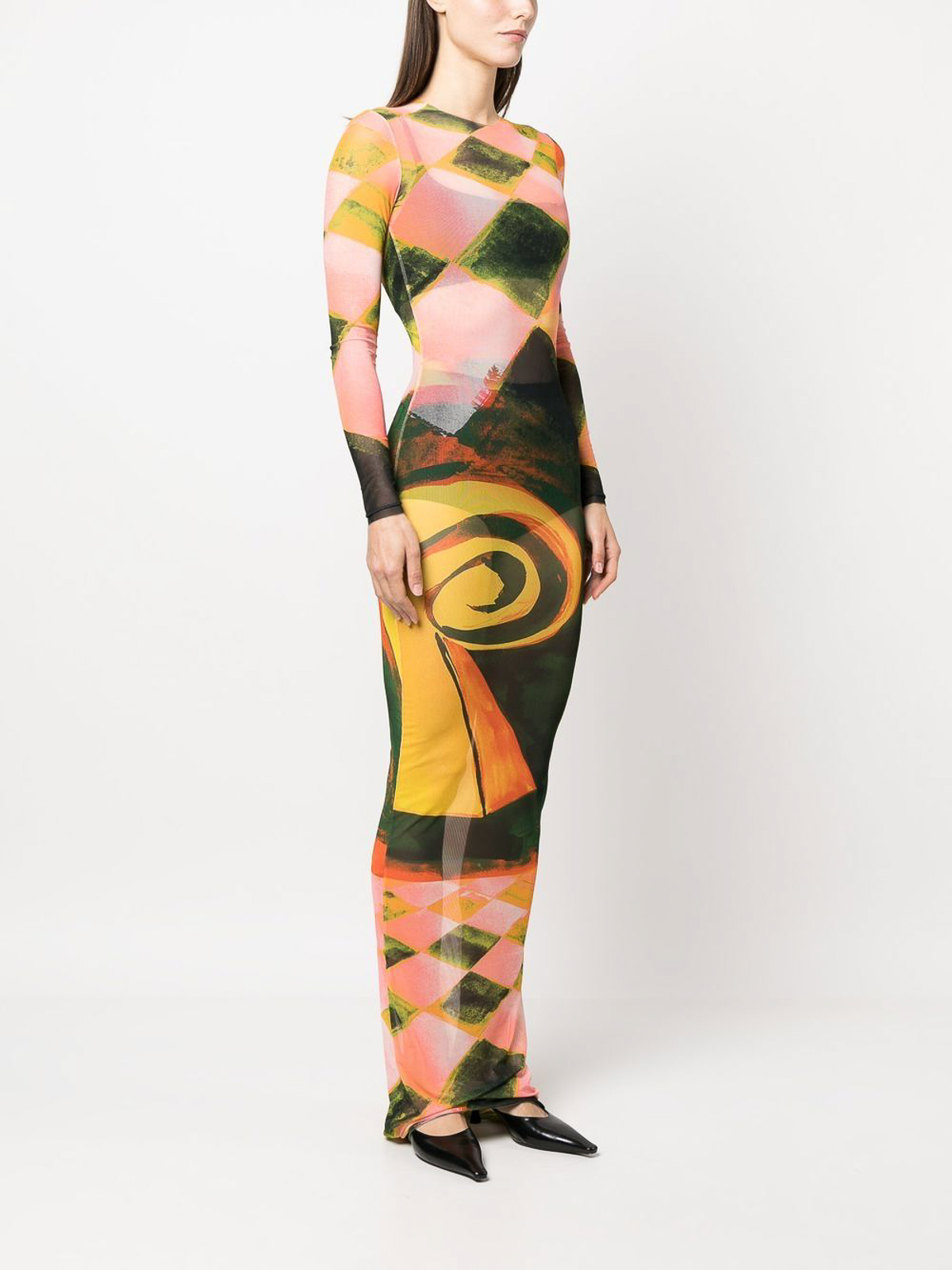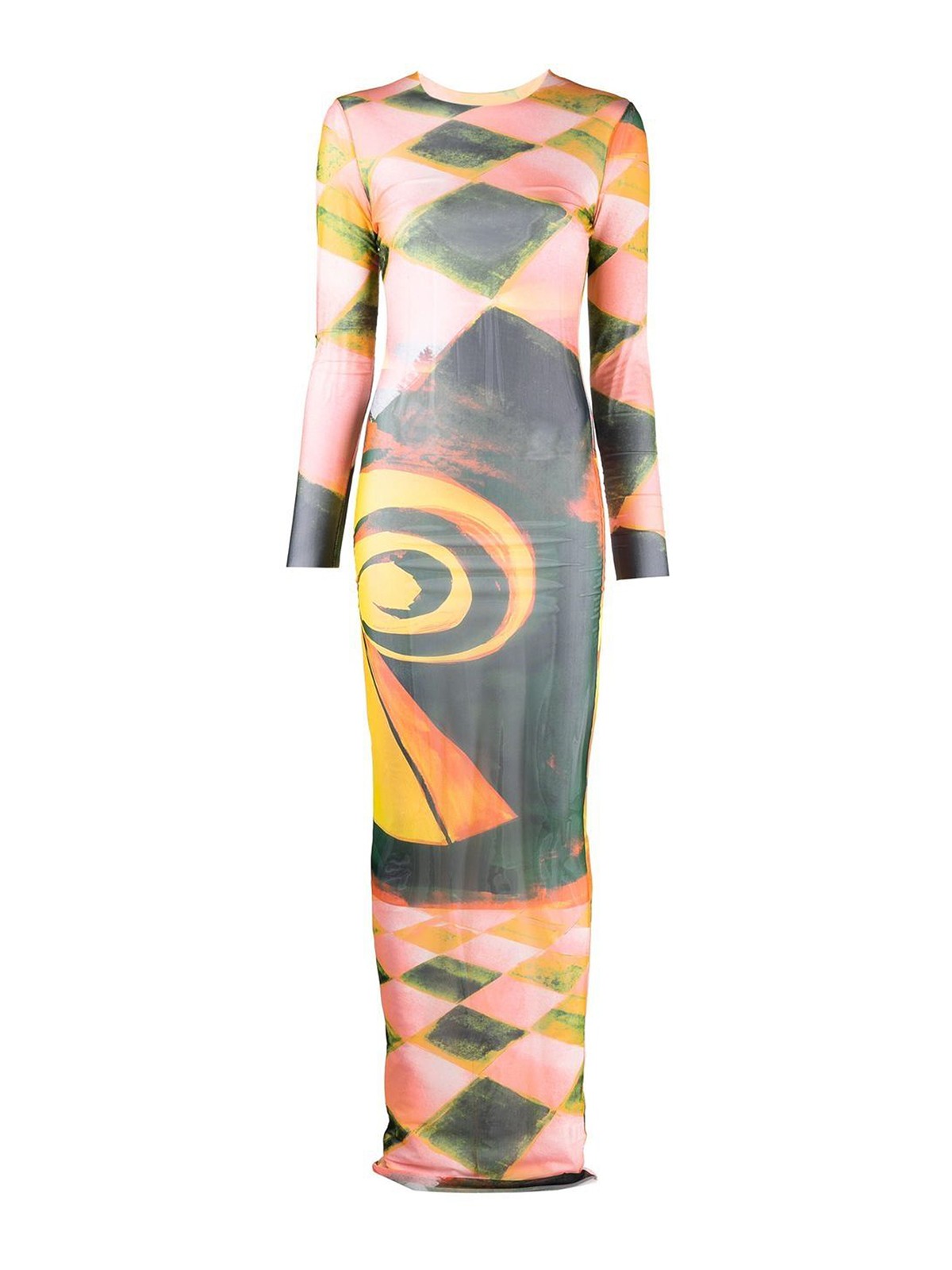 Robe à imprimé abstrait à marée haute multicolore, design stretch, imprimé à motifs abstraits, col rond, manches longues, longueur longue et ourlet droit.