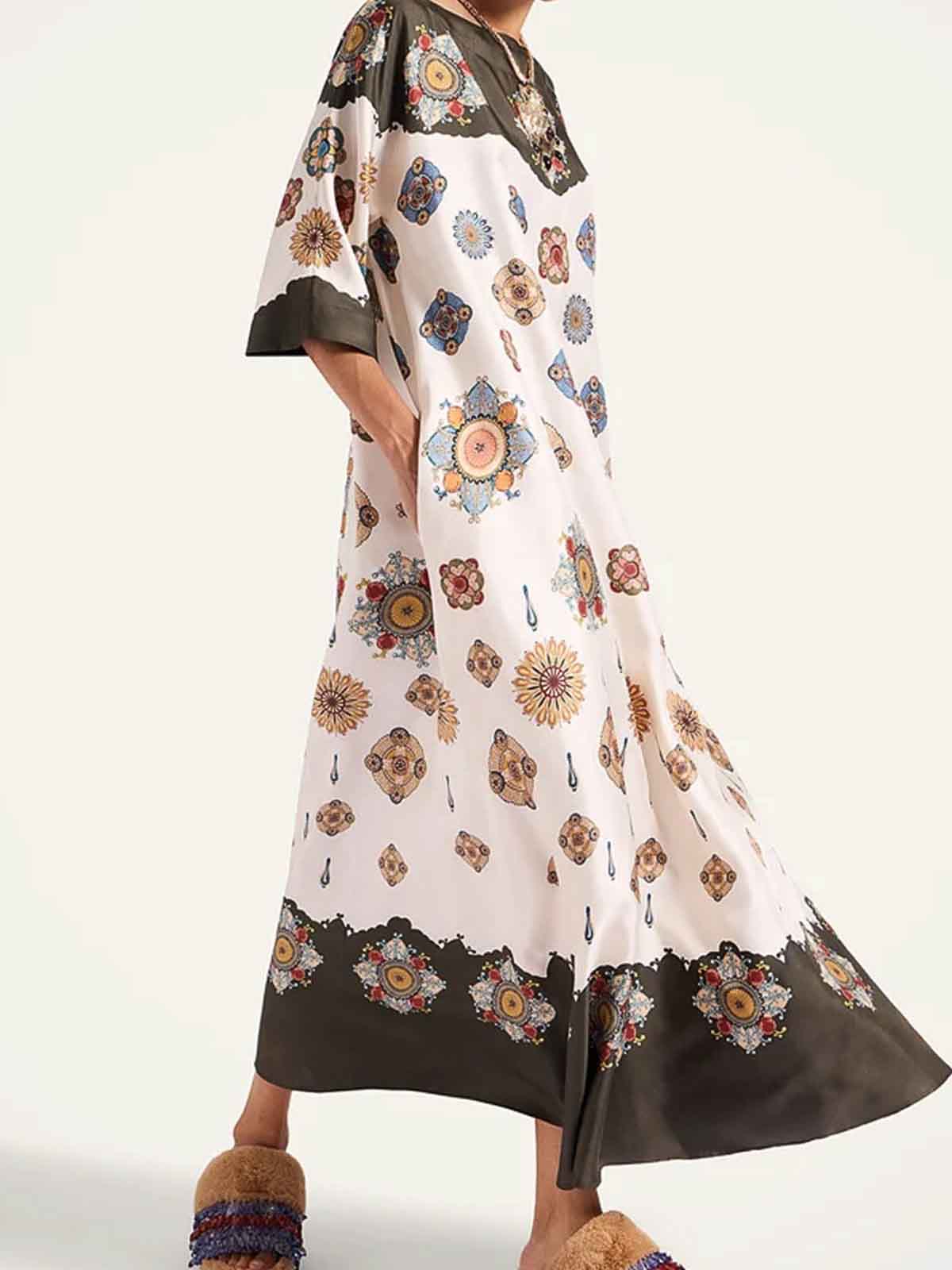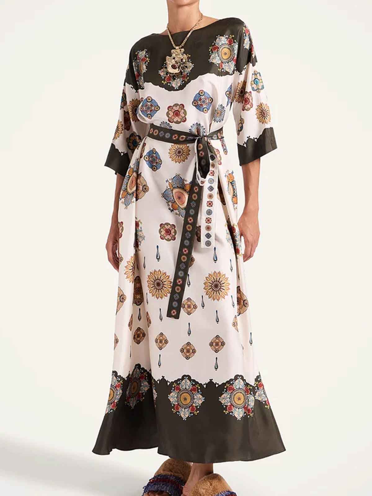 Sergé de soie, imprimé fait main, coupe généreuse, poches latérales cachées, ceinture ajustable et amovible, sans passants, manches 3/4. Composition : 100 % soie fabriquée en Italie