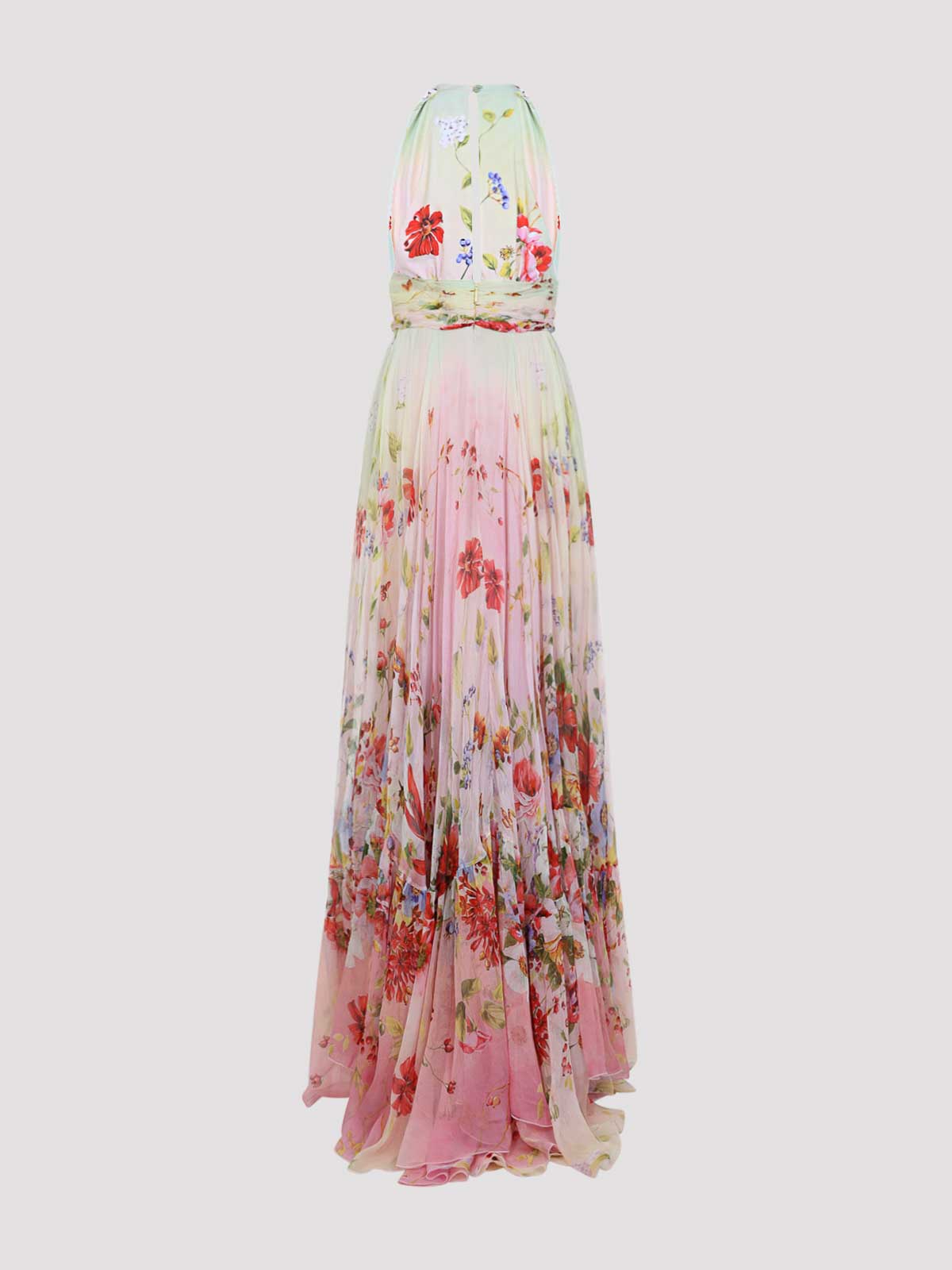 Robe longue en soie multicolore Roberto Cavalli Miami Flowers. Robe longue confectionnée en pure soie multicolore ornée d'un imprimé floral emblématique sur l'ensemble, dotée d'un col licou, d'une encolure en V sur le devant, d'une fermeture à crochet dissimulée à l'arrière du col, d'une découpe dans le dos, d'une bretelle ton sur ton froncée à la taille, d'une fermeture zippée dissimulée au dos et d'une jupe évasée.