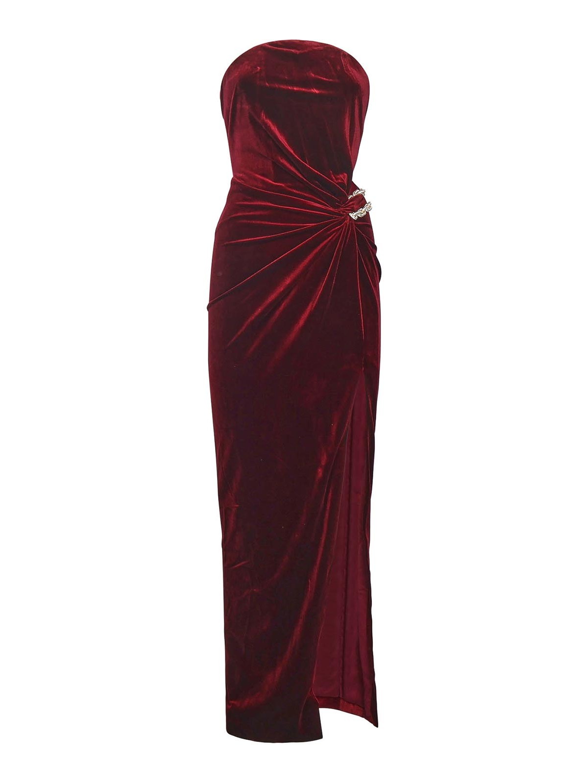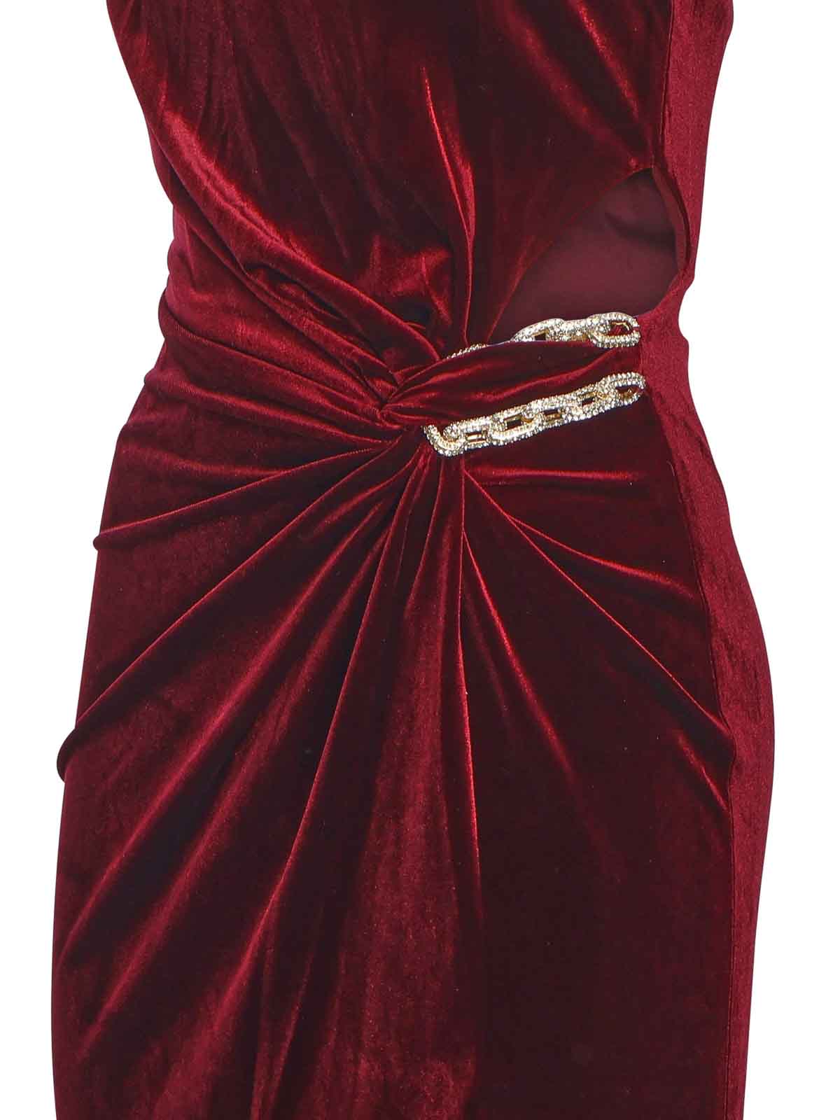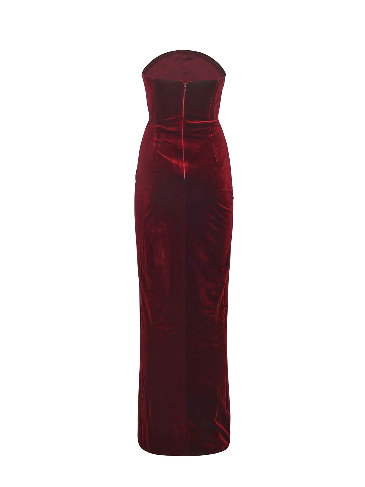 Encolure bandeau, corset à fente latérale profonde, fermeture éclair au dos, découpe latérale avec chaîne ornée, coupe ajustée. La taille indiquée sur la photo est de couleur bordeaux.