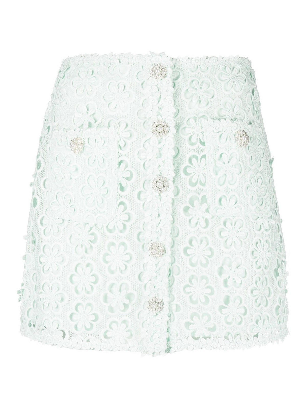 Minijupe en dentelle Daisy tirée de Self-Portrait, ornée de détails en dentelle florale vert menthe, de boutons en fausse perle, de deux poches plaquées sur le devant et d'une longueur de cuisse, taille UK