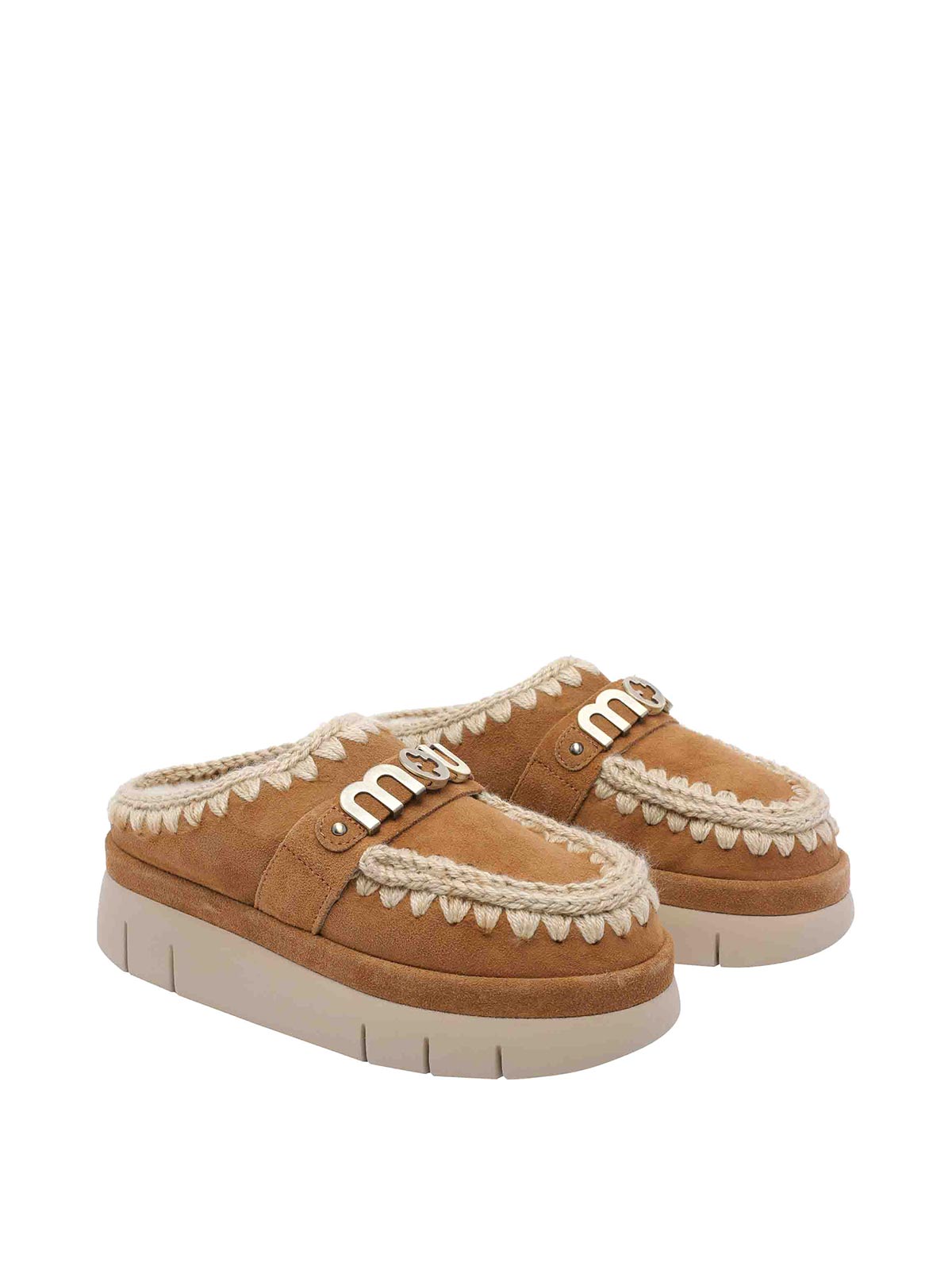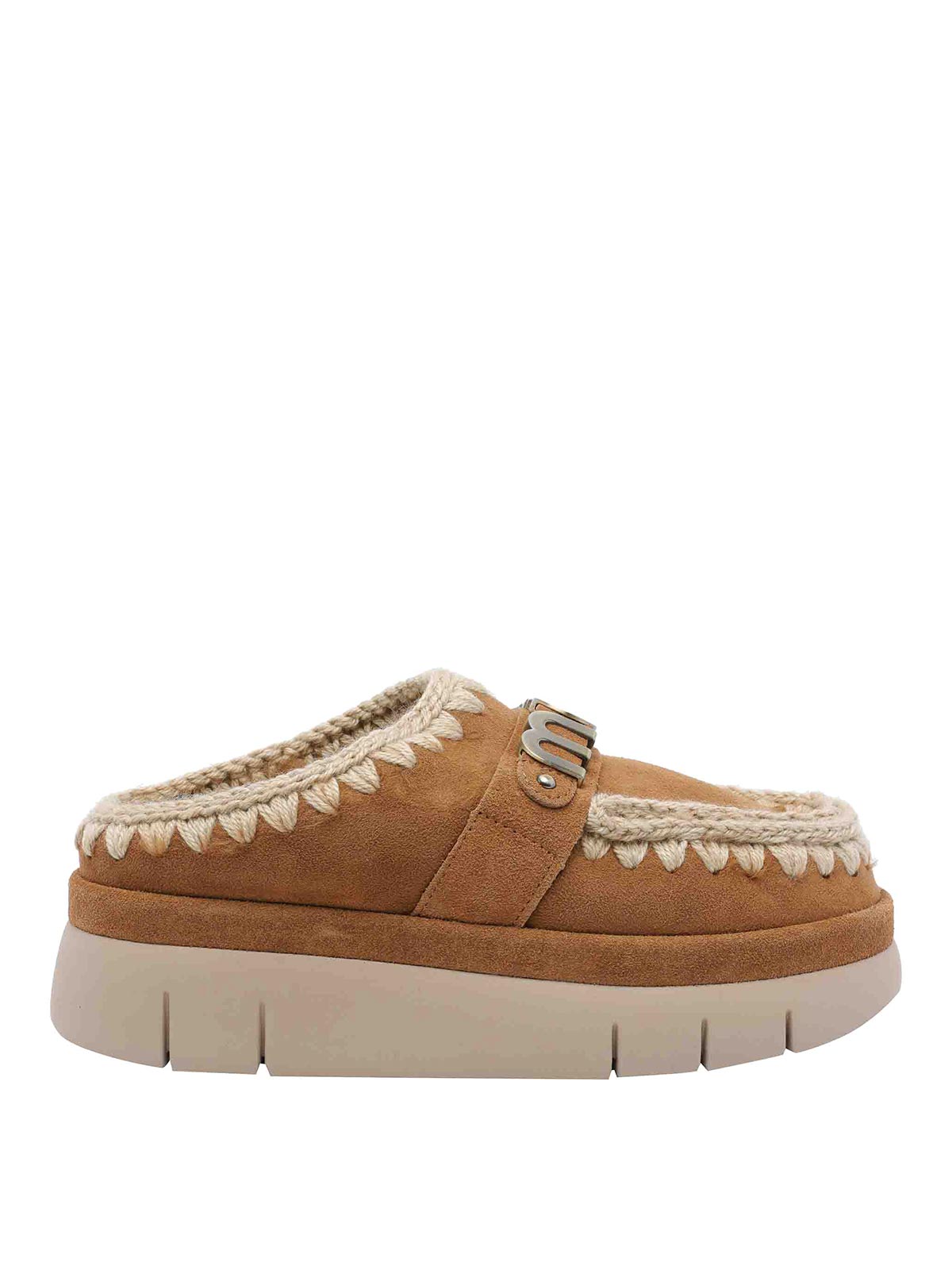 Mules à sabots rembourrés marron Mou, dessus en daim, logo lettré sur le devant, bout rond