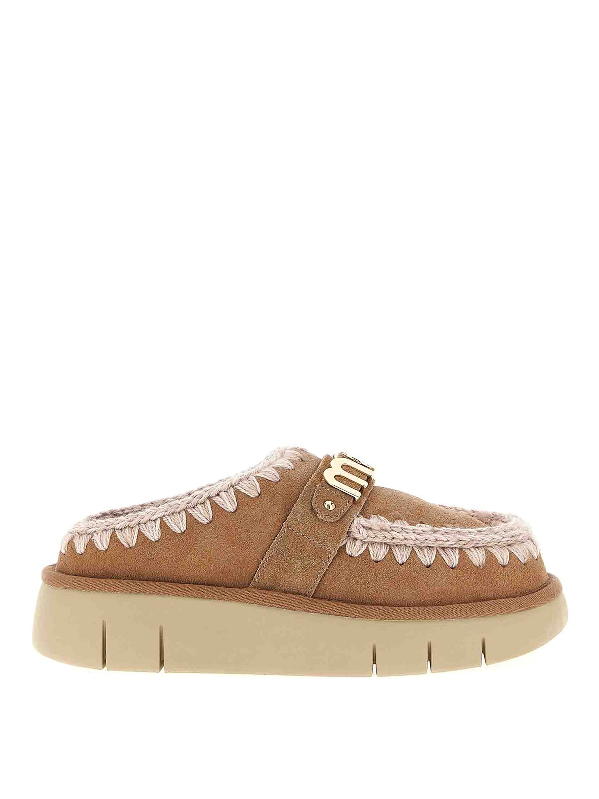 sabots en daim « Bounce Clog » avec coutures apparentes, doublure en fourrure, semelle en caoutchouc, logo métallique sur le devant.