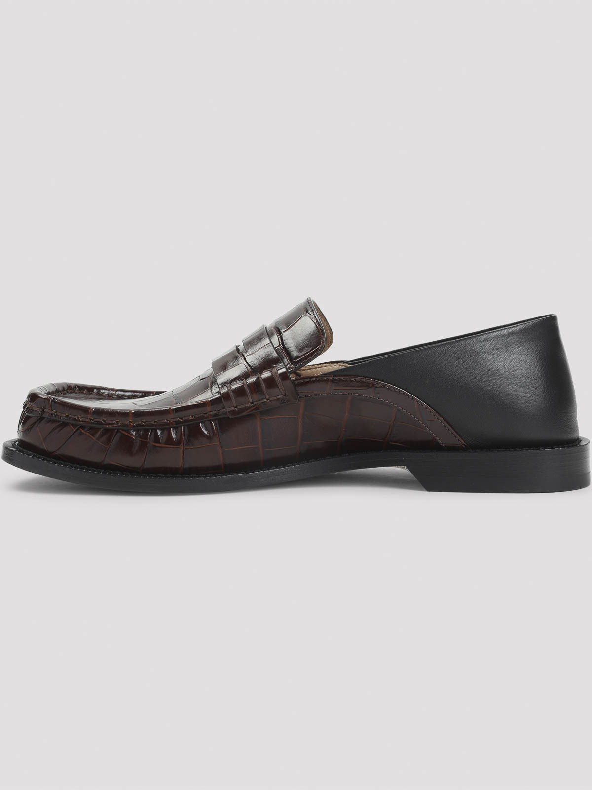 Mocassins Loewe en cuir de veau marron foncé à rabat Campo. Confectionnés en cuir de veau embossé croco marron foncé, ils sont dotés d'un bout en forme de pétale emblématique, d'un passepoil sur le devant, d'une lanière en penny, d'un dos pliable en cuir noir souple en cuir d'agneau nappa à porter comme des mules, d'une semelle intérieure rembourrée en cuir et d'une semelle extérieure en caoutchouc.