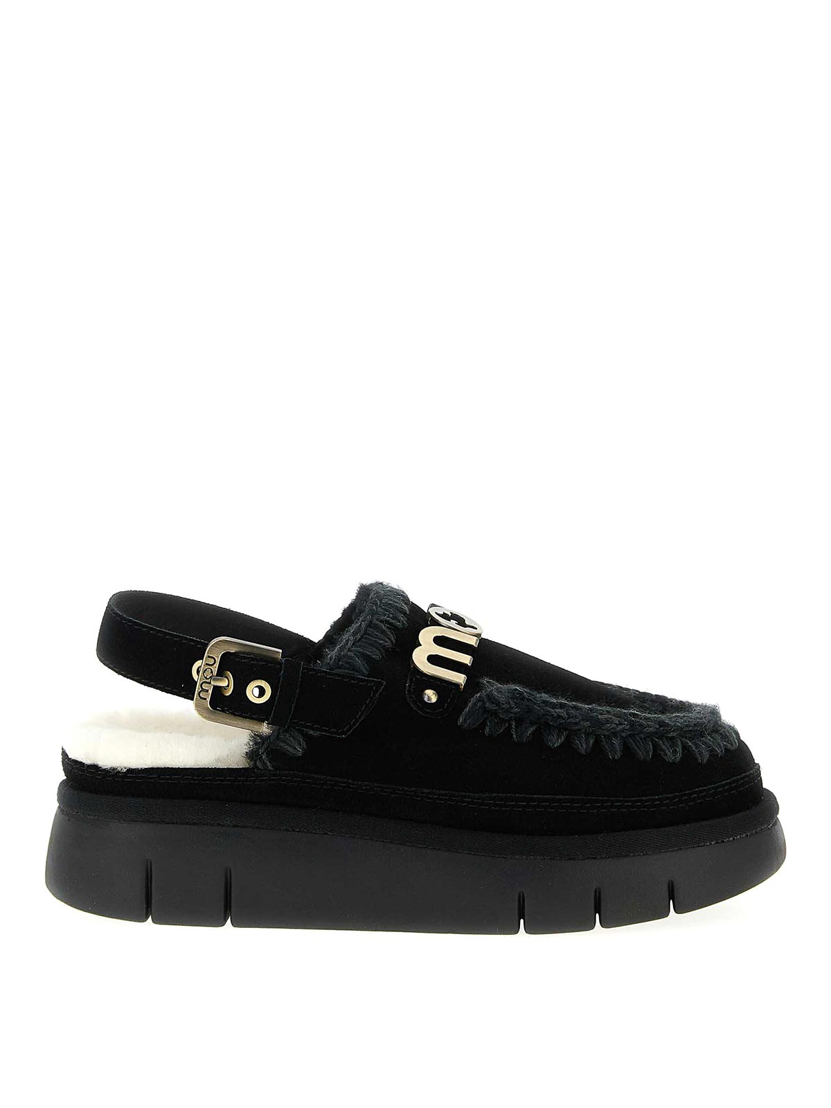 Sabots en daim « Bounce Clog Back Strap » avec coutures apparentes, doublure en fourrure, sangle arrière ajustable avec boucle, semelle en caoutchouc, logo métallique sur le devant.