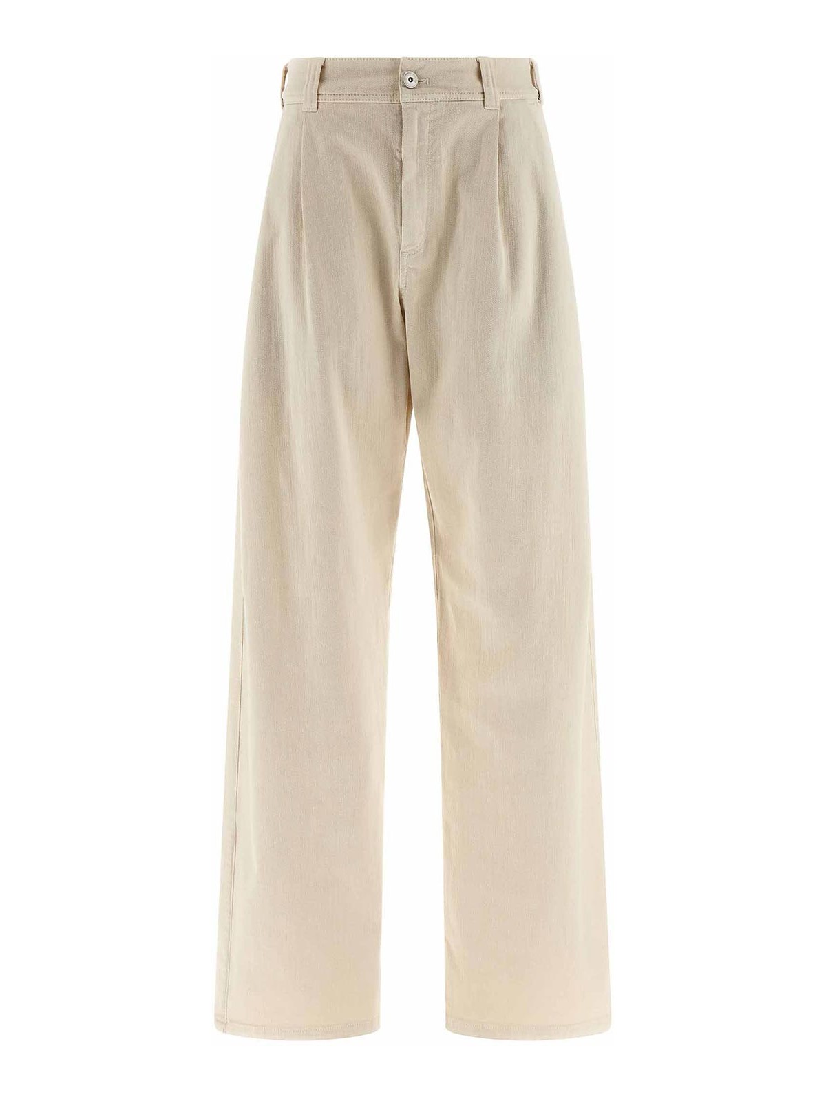 Pantalon en toile de coton texturée, jambe large et droite avec pince aux genoux, fermeture zippée et boutonnée sur le devant, poches, détail de monile au dos.