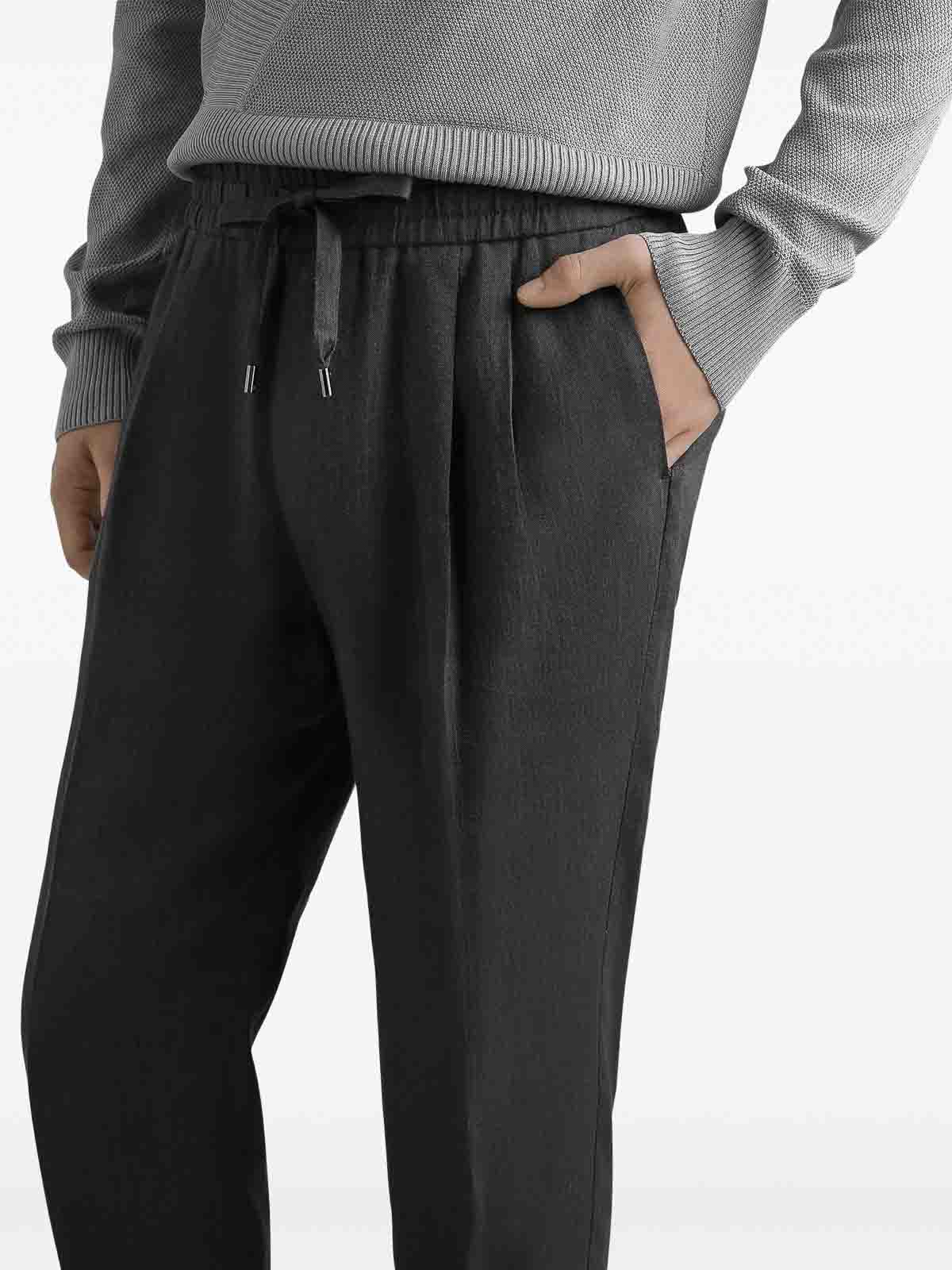 couleur design : gris foncé, lin/lin, ceinture à cordon de serrage, détail plissé sur le devant, logo à l'arrière, jambe fuselée, poches latérales.