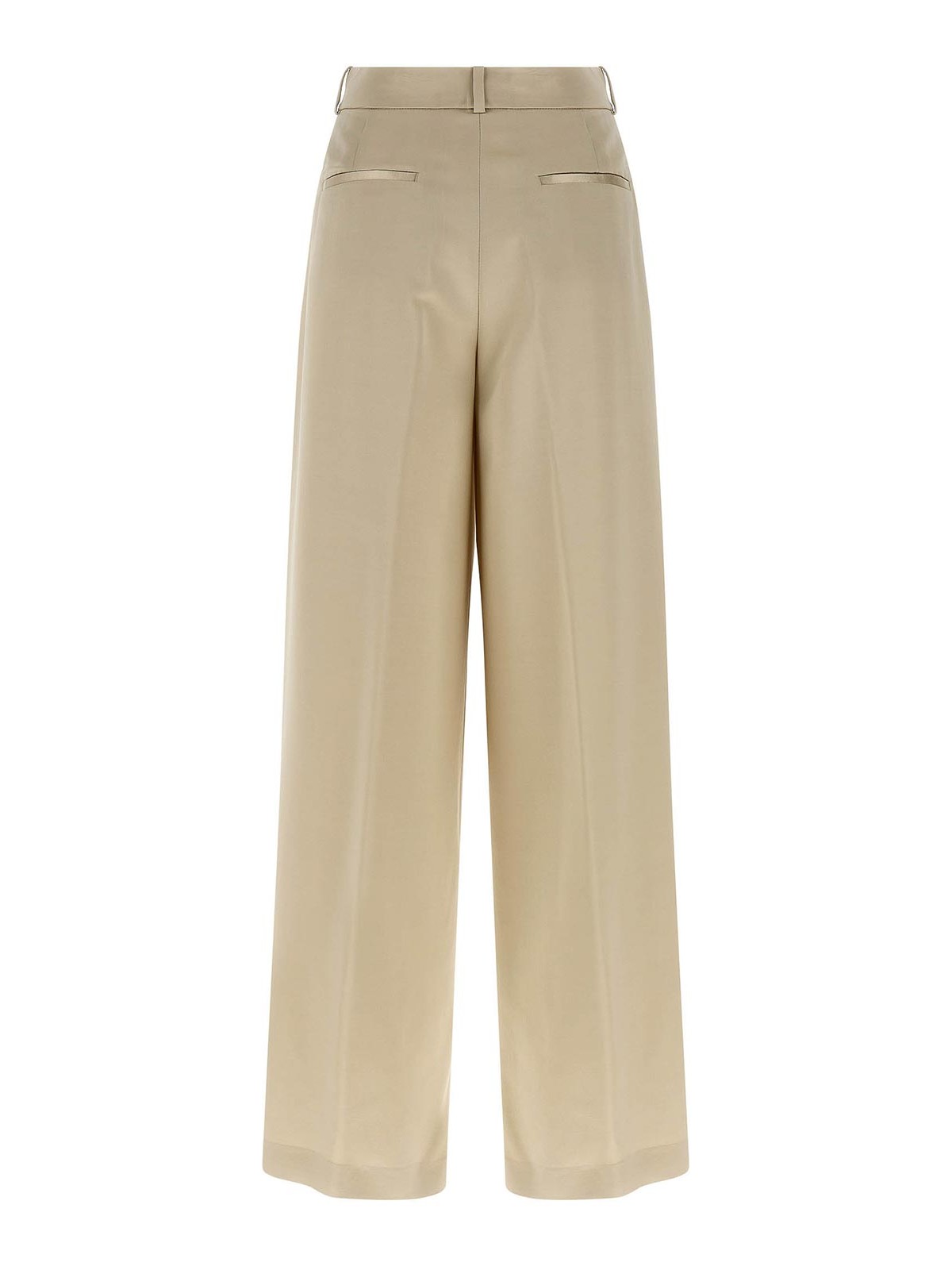 Pantalon en satin de viscose lisse et laine, style palazzo avec jambe large et droite, fermeture zippée à crochet et bouton sur le devant, poches.