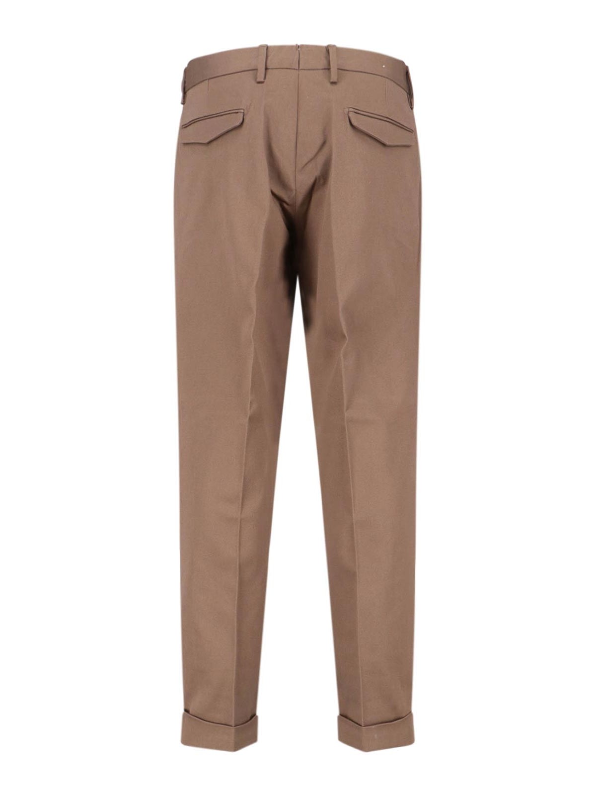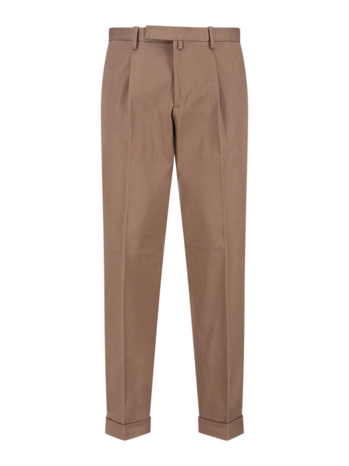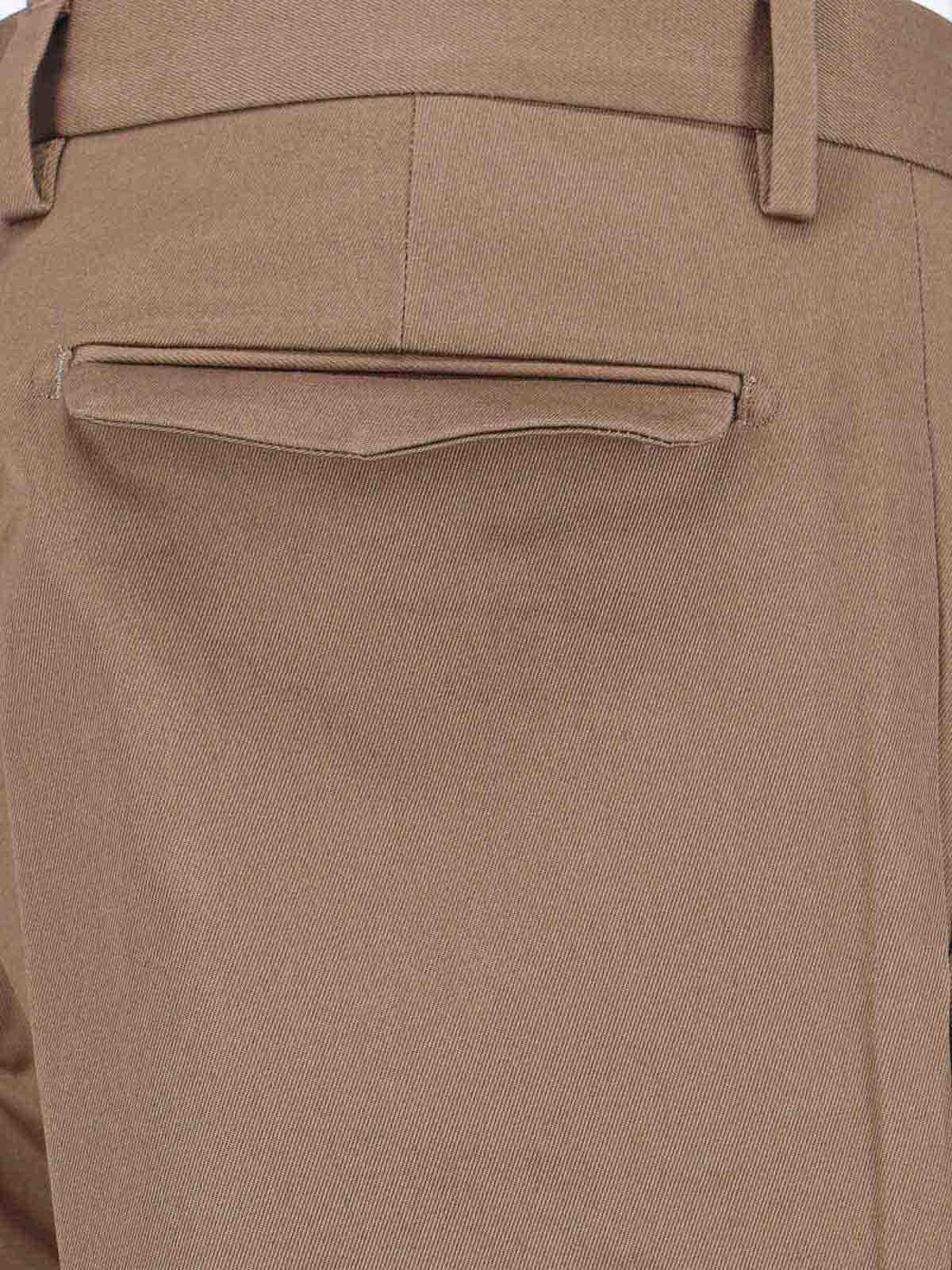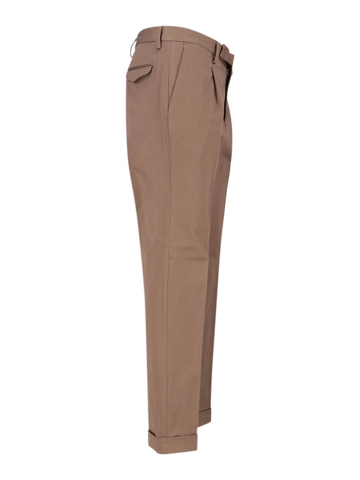 Pantalon BG 21s Briglia 1949, en coton beige, taille moyenne, passants de ceinture, fermeture boutonnée et zippée, plis sur le devant, deux poches latérales, deux poches arrière, jambe droite.