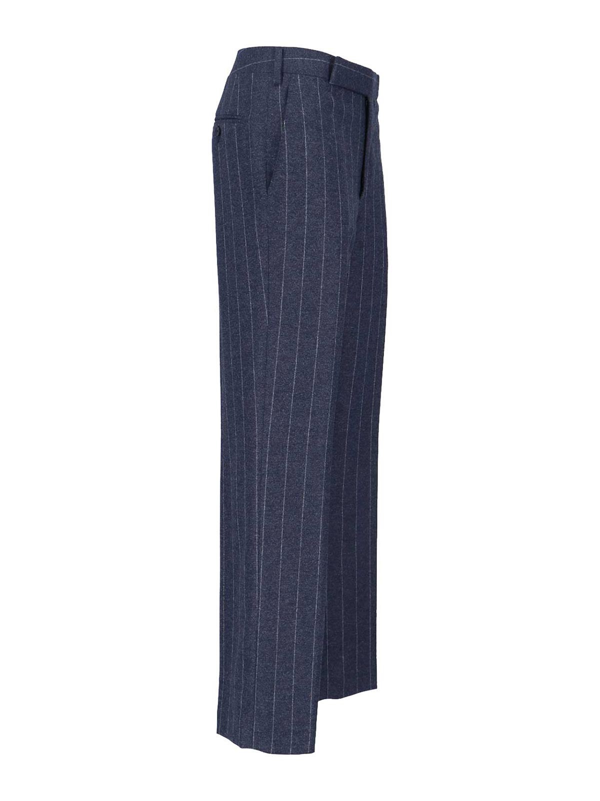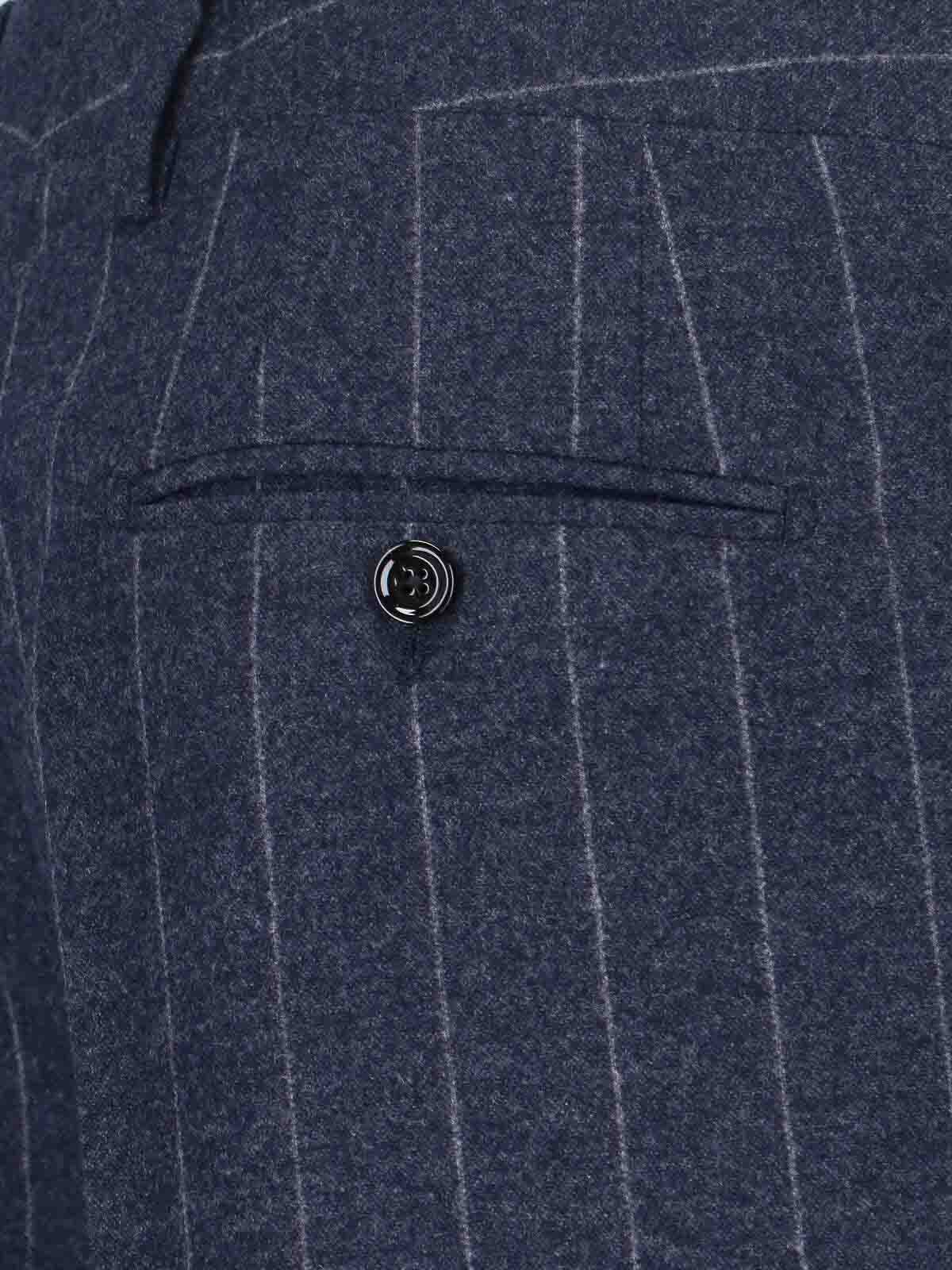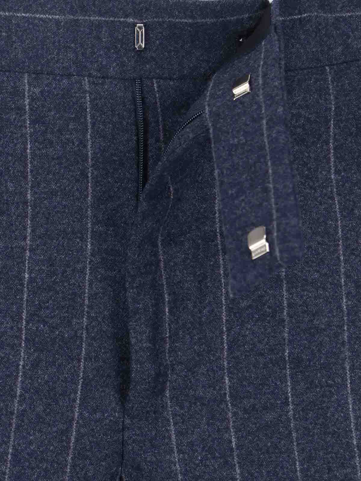 Pantalon Lardini en laine vierge et cachemire, bleu, motif à fines rayures, passants de ceinture, fermeture à crochet et à glissière, deux poches latérales, deux poches arrière boutonnées, jambe droite.