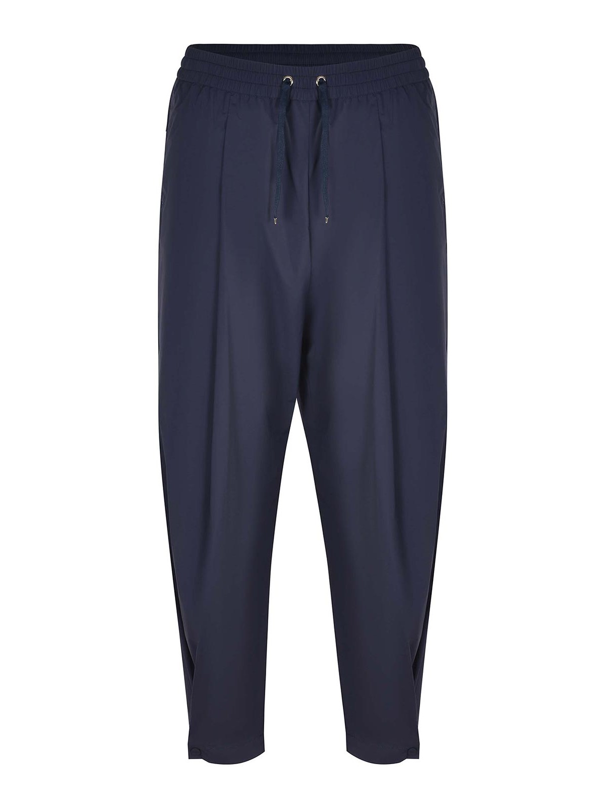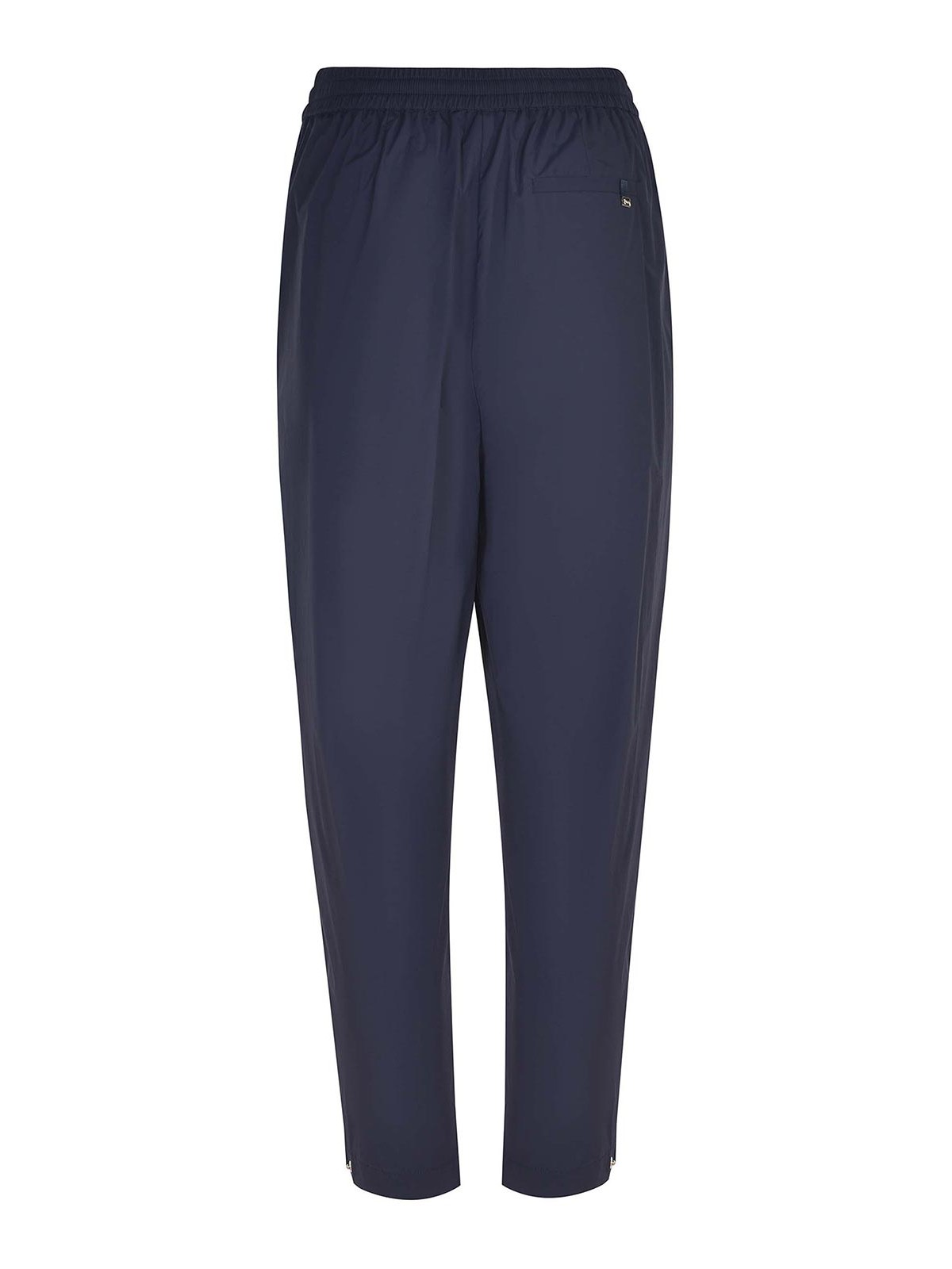 Pantalon Herno en nylon bleu nuit. plis sur le devant, ceinture élastique avec cordon de serrage gros-grain, poches latérales. cheville ajustable avec bouton-pression. poche arrière passepoilée, écusson logo Herno appliqué, 86 % polyamide, 14 % élasthanne