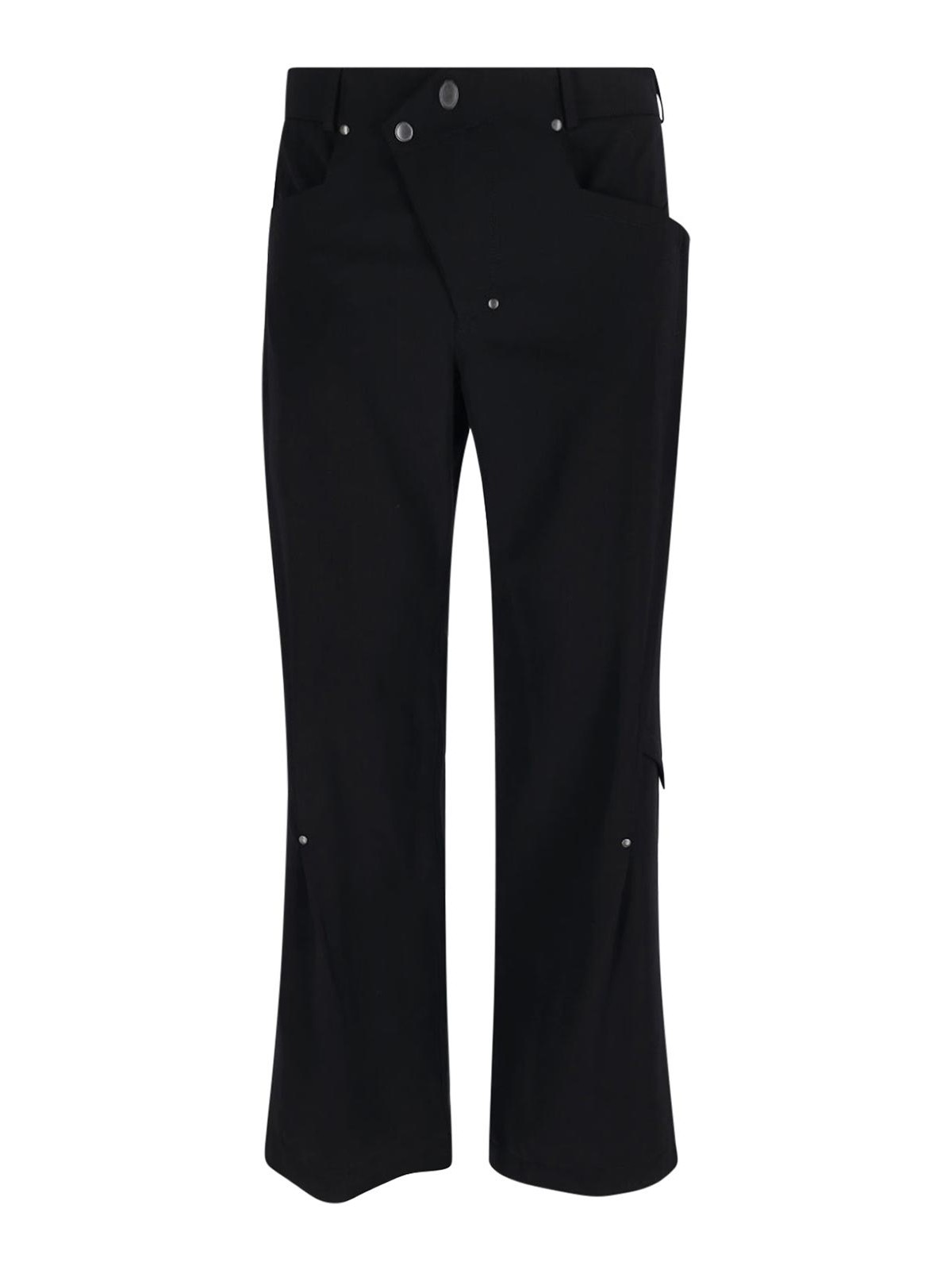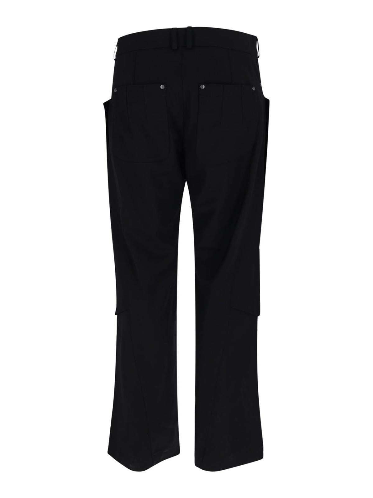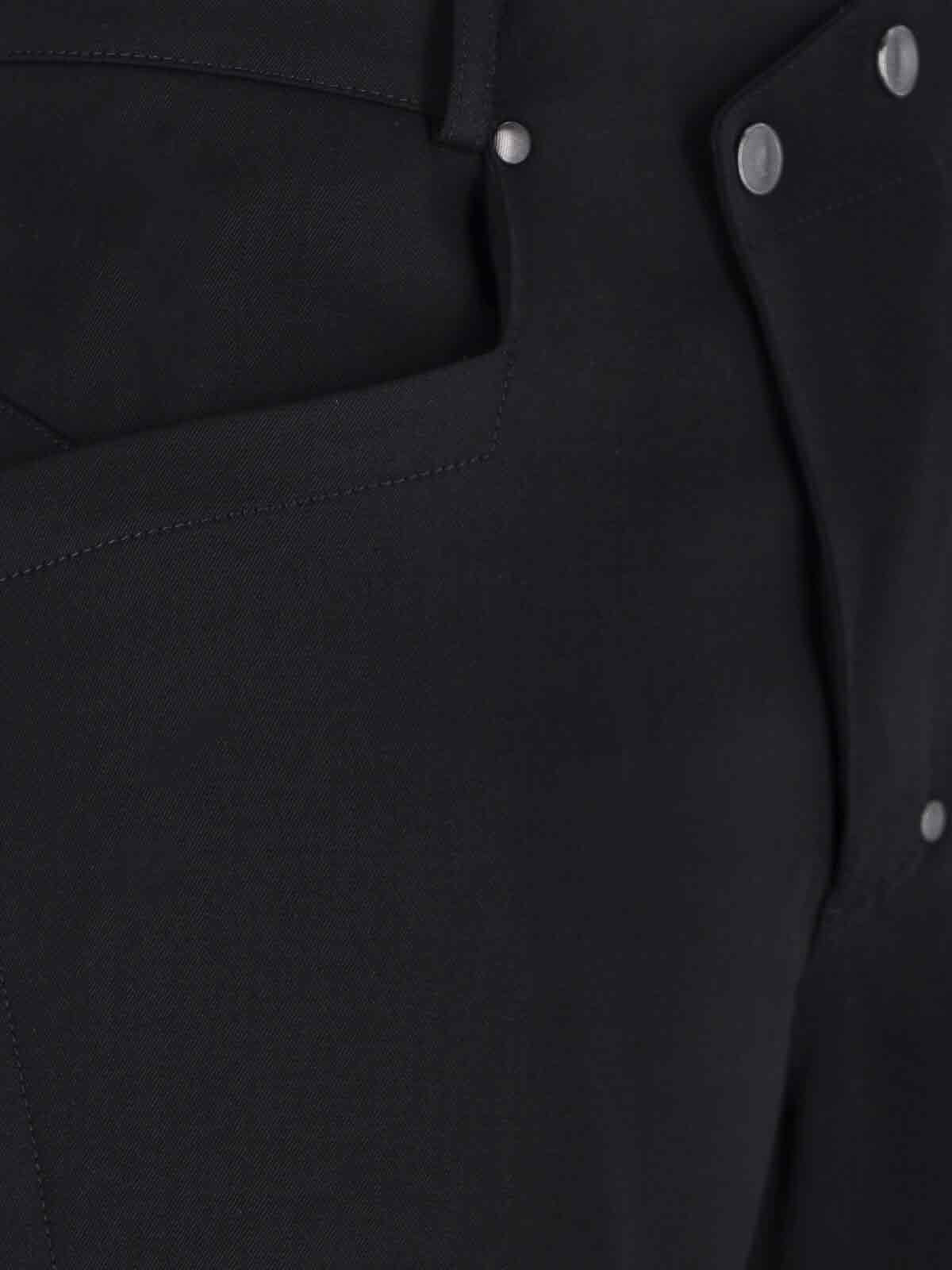 Pantalon kraner Kiko Kostadinov, en laine vierge noire, passants de ceinture, fermeture boutonnée et zippée, détail du panneau avant, deux poches latérales, deux poches arrière, jambe droite.