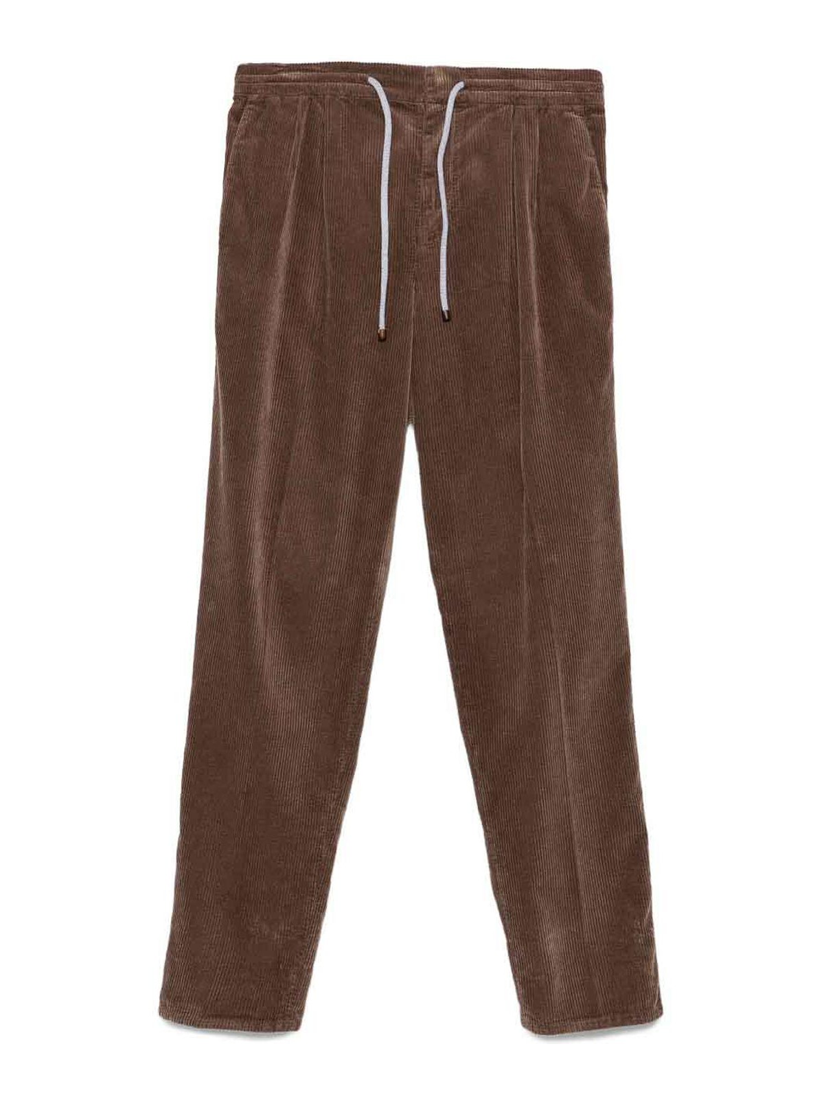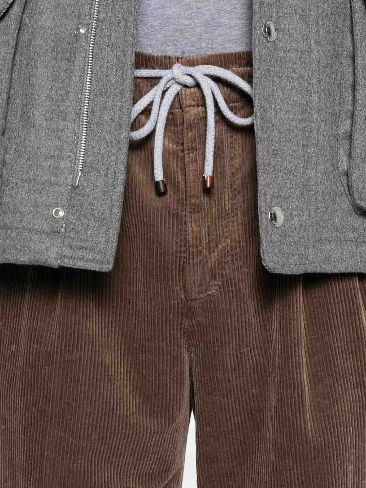 Le pantalon à cordon côtelé marron de Brunello Cucinelli est doté d'un cordon de serrage à texture côtelée et de poignets élastiqués idéaux pour un confort raffiné et un style chic décontracté, brunello cucinelli, pantalon à cordon côtelé, marron, texture côtelée, cordon de serrage, ourlets élastiqués, coupe décontractée