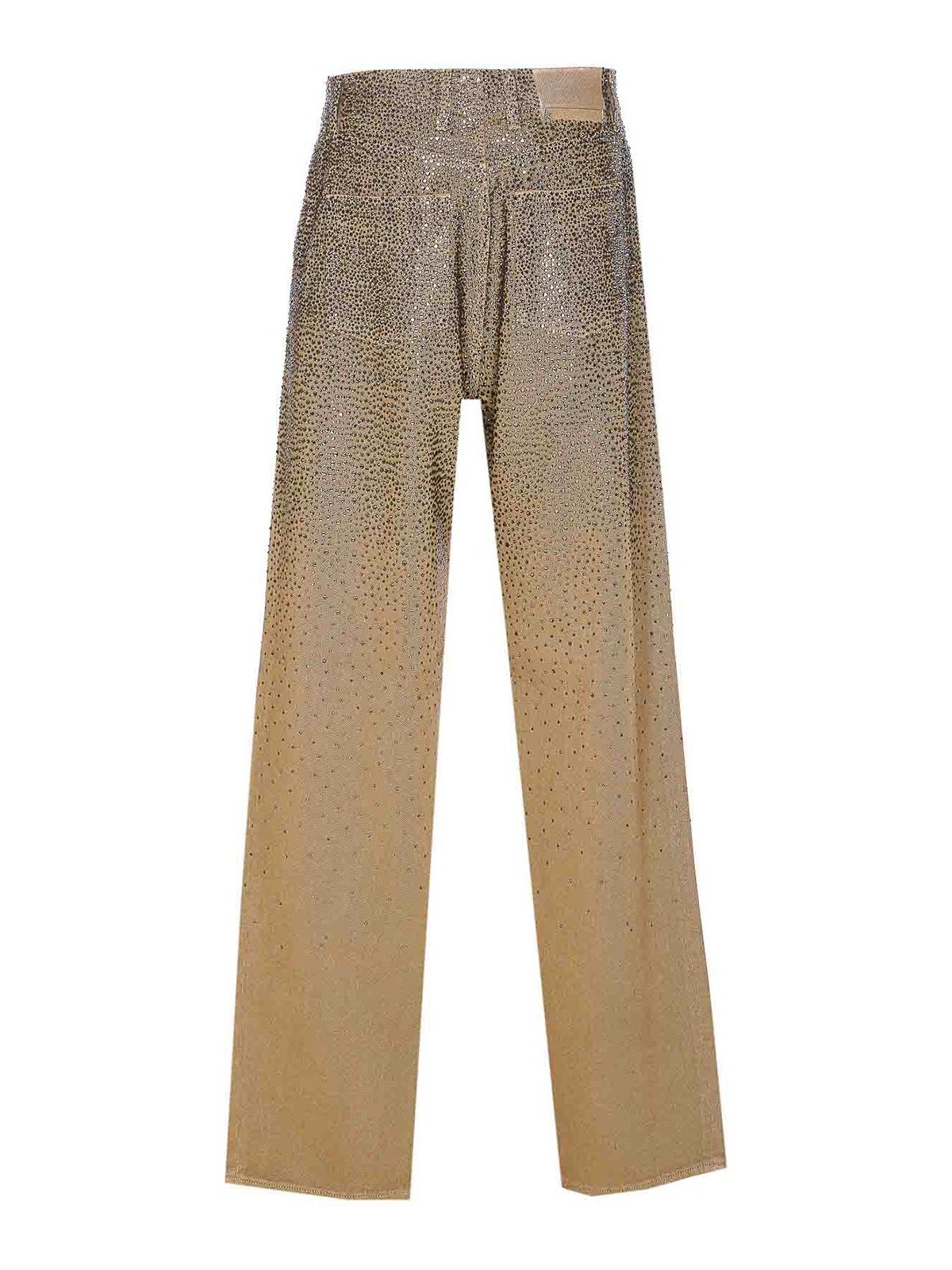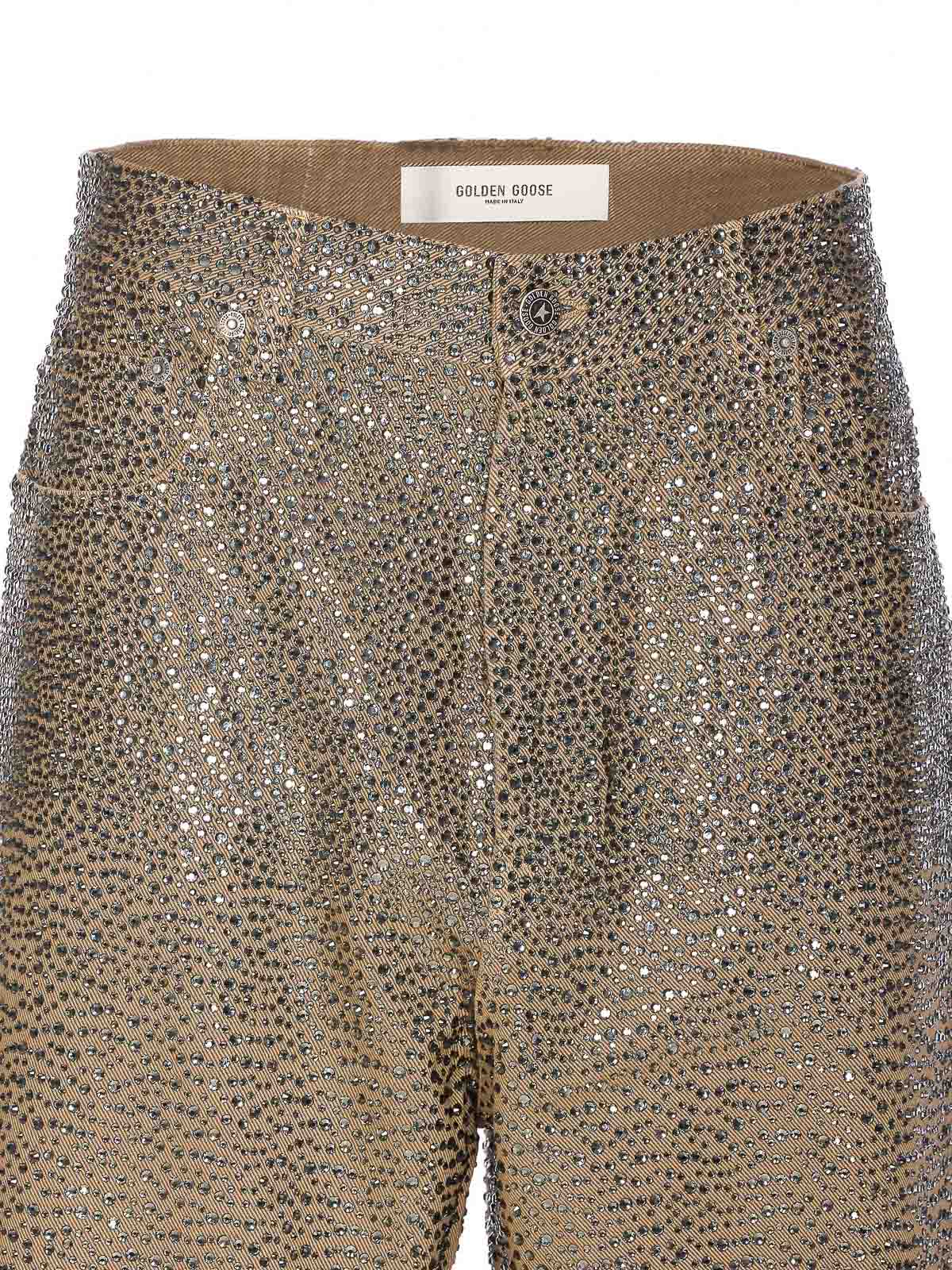 Poches zippées et boutonnées en jean beige oie doré sur toute la longueur de la jambe.