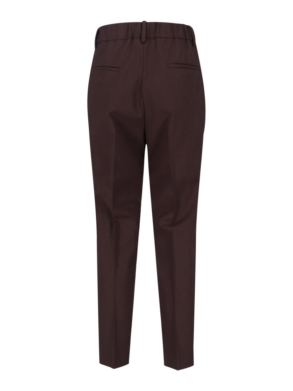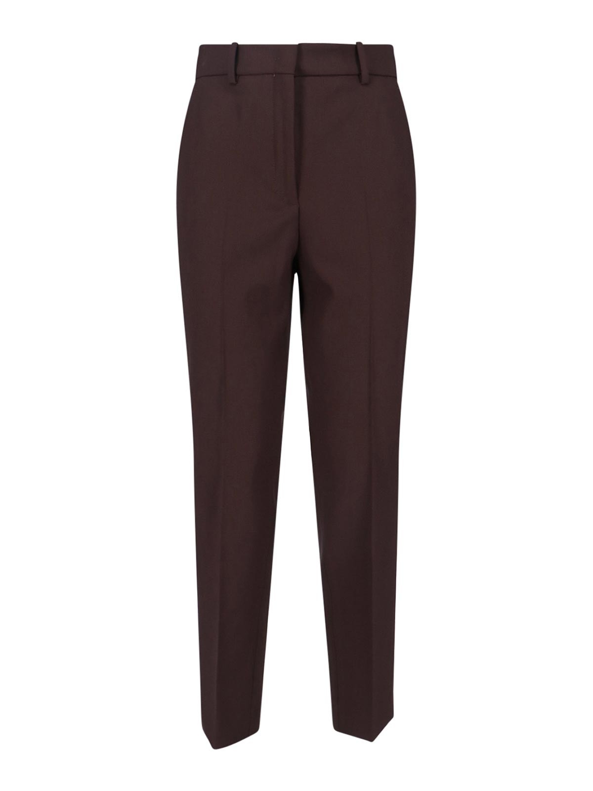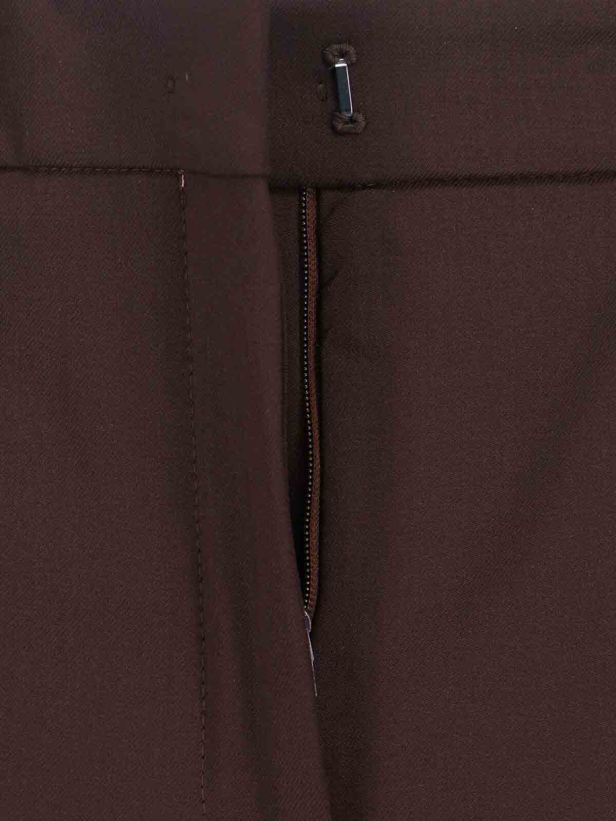 Pantalon droit en incotex, en laine vierge marron, taille élastiquée moyenne, passants de ceinture, fermeture à crochet et à glissière, deux poches latérales, deux poches arrière passepoilées, jambe droite.