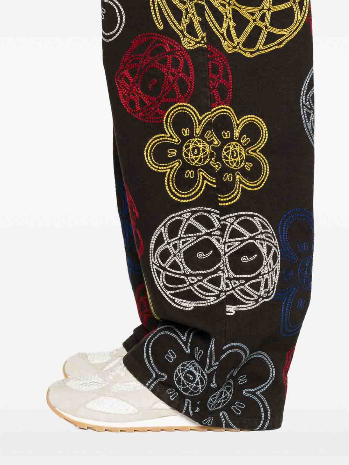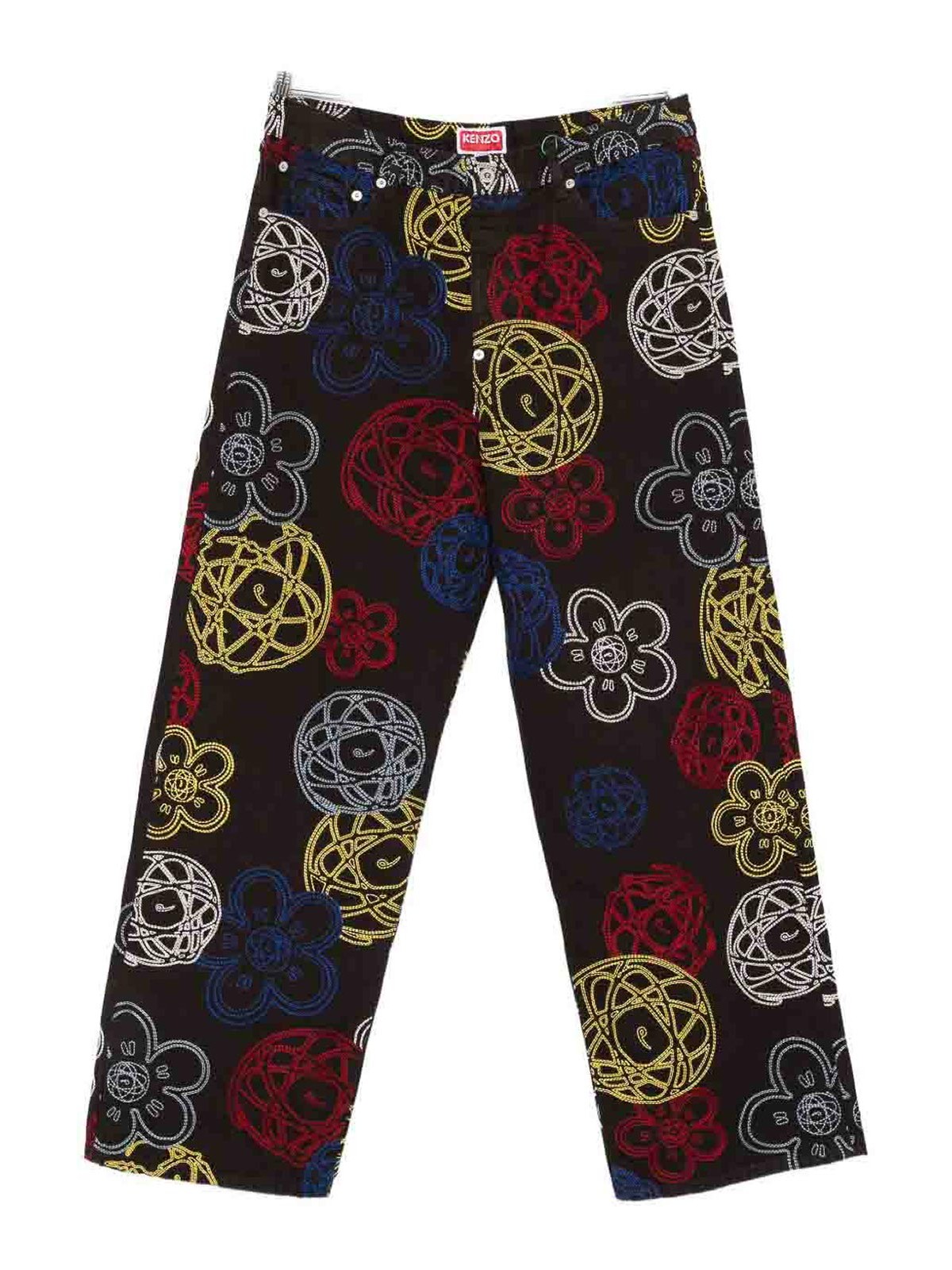 Motif floral marron, motif globe, détails brodés, fil multicolore, deux poches arrières, deux poches latérales, étiquette graffiti rouge sur la ceinture arrière.