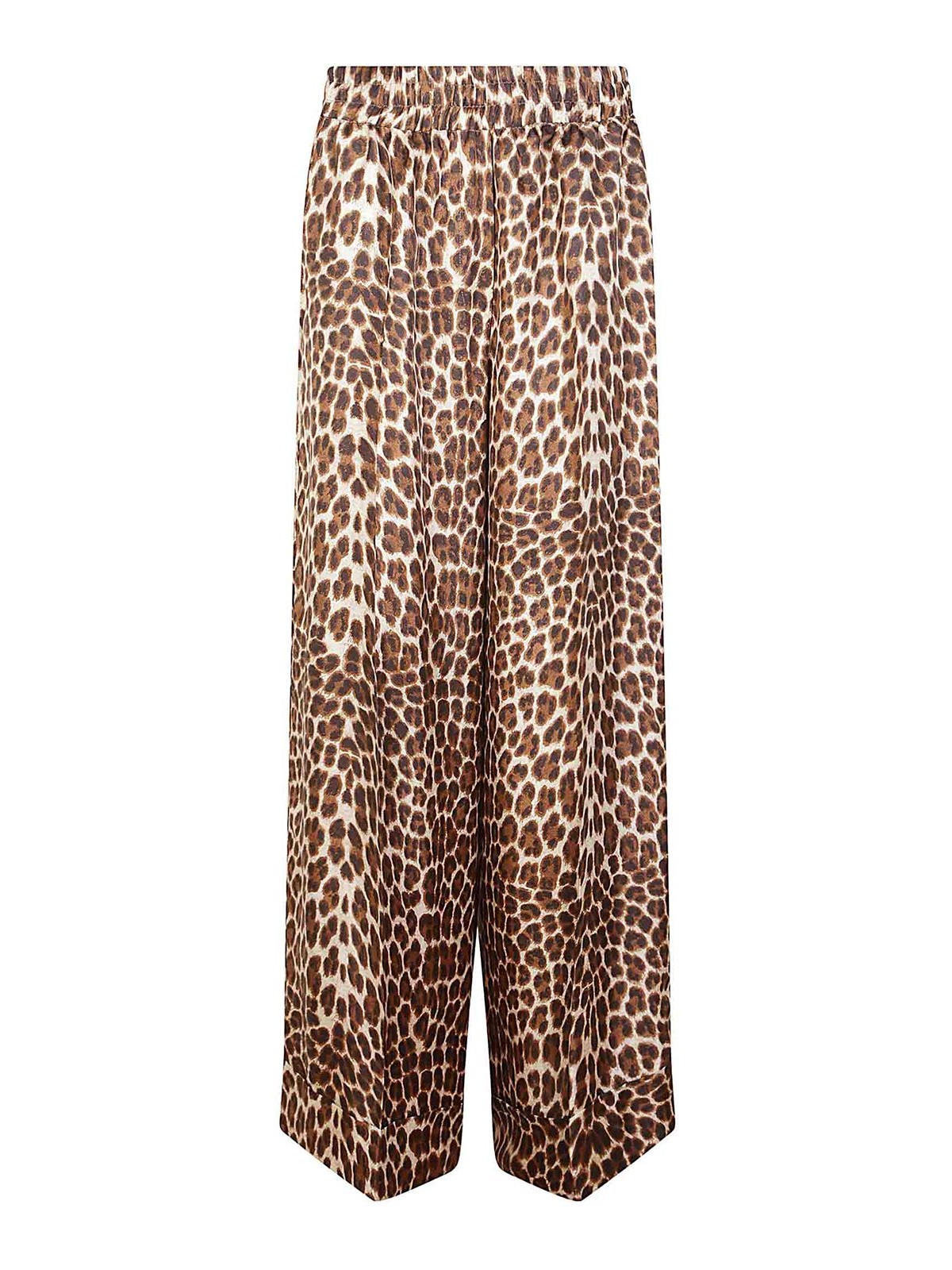 Pantalon en twill de soie, imprimé léopard, poches passepoilées, taille élastique, ligne évasée.