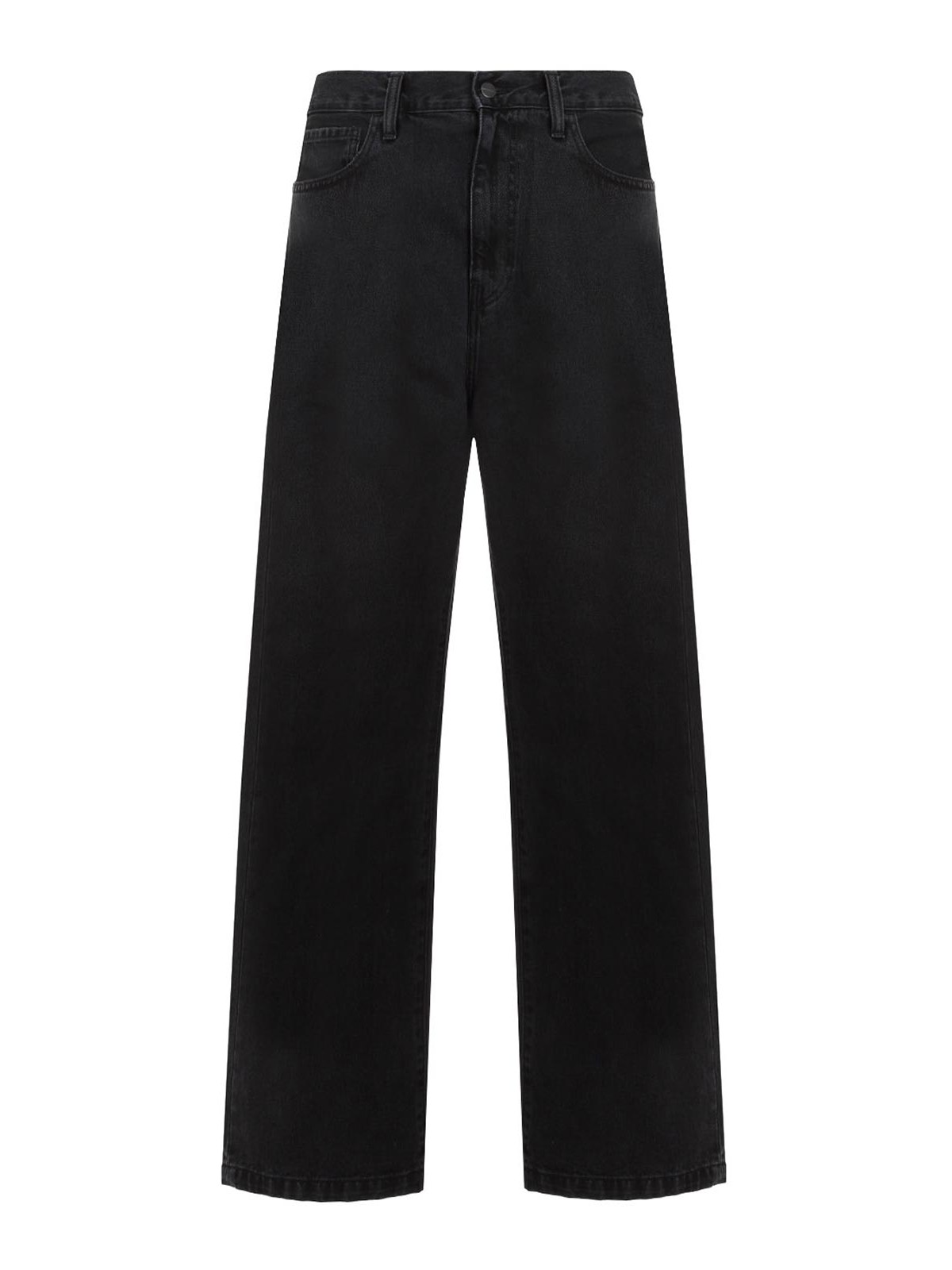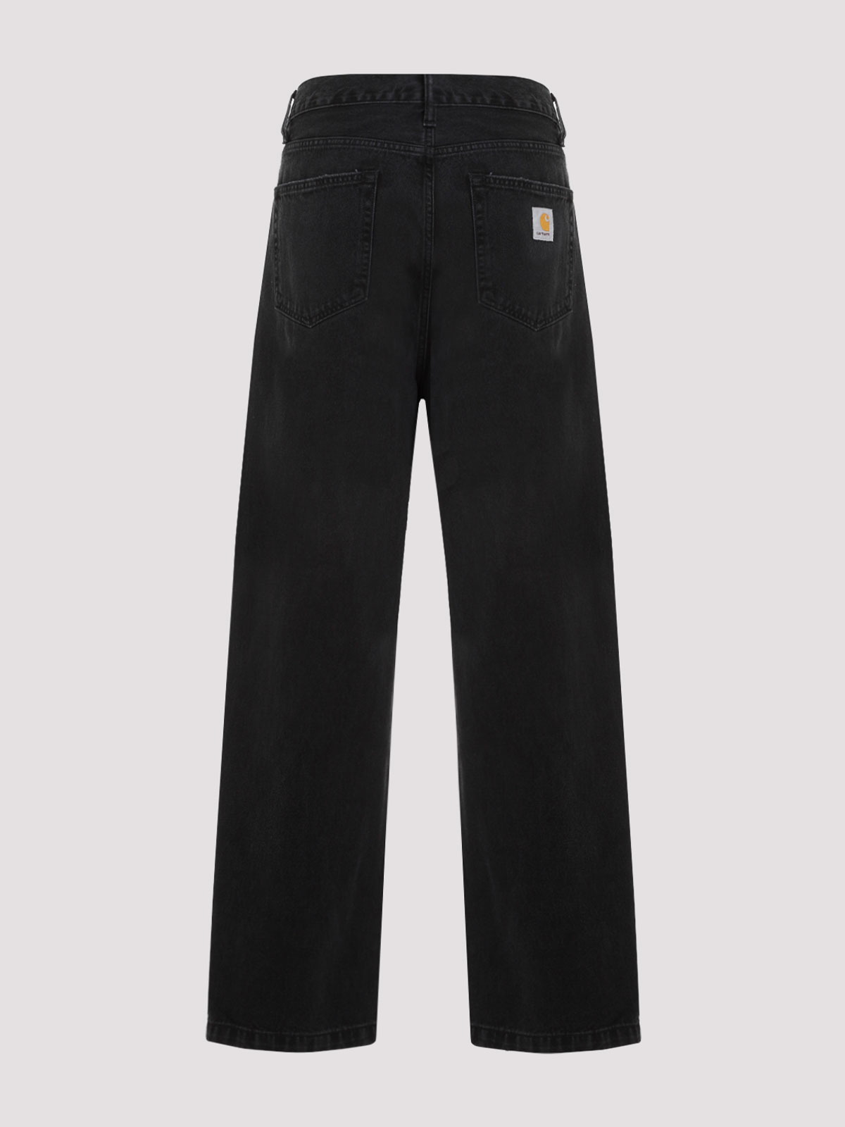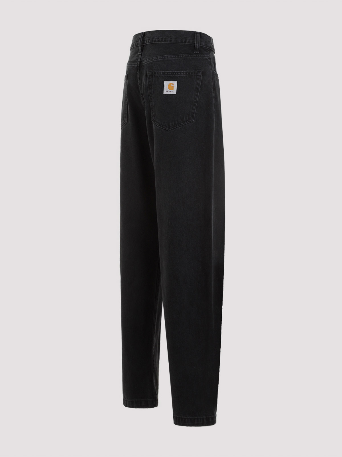 Pantalon à genou simple Carhartt en coton noir Wip. Fermeture zippée dissimulante sur le devant, fermeture boutonnée sur le devant, passants de ceinture, poches latérales, poches arrière avec écusson logo emblématique, petites poches latérales le long des jambes, ourlet droit.