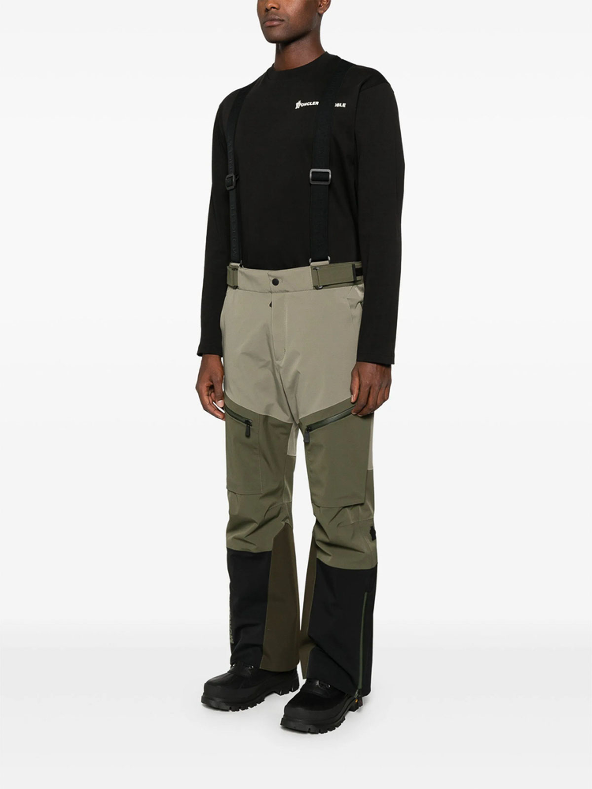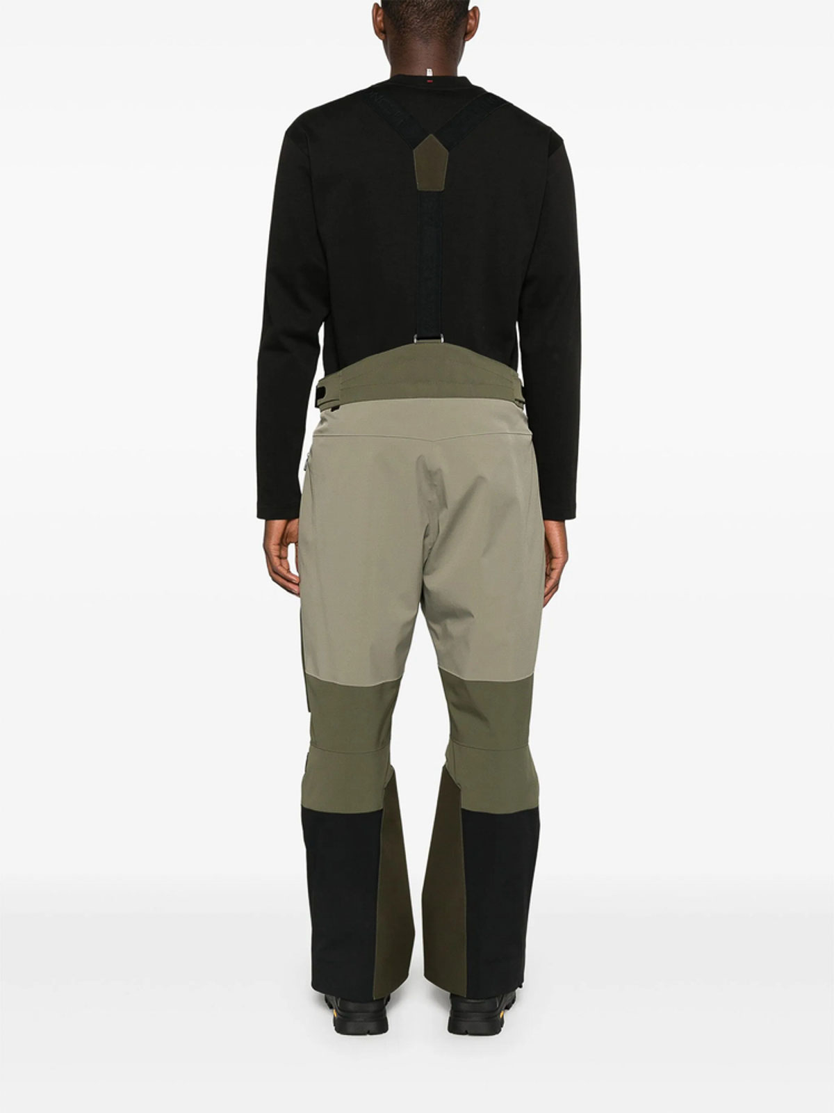 Bretelles réglables vertes, poches boutonnées et zippées, jambe droite