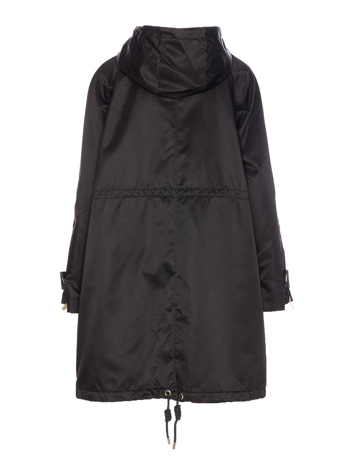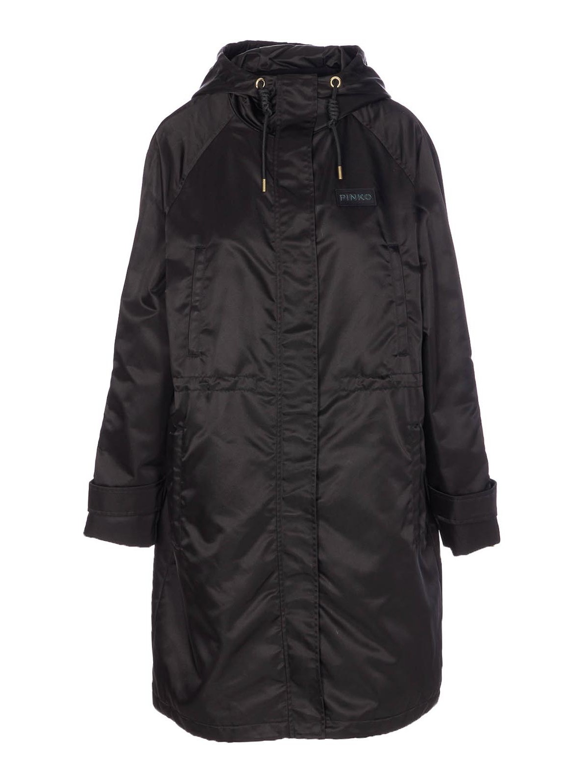 Parka Delma noire Pinko avec fermeture zippée et boutonnée, manches longues, capuche, coulisse à la taille, poches zippées, bretelle aux poignets