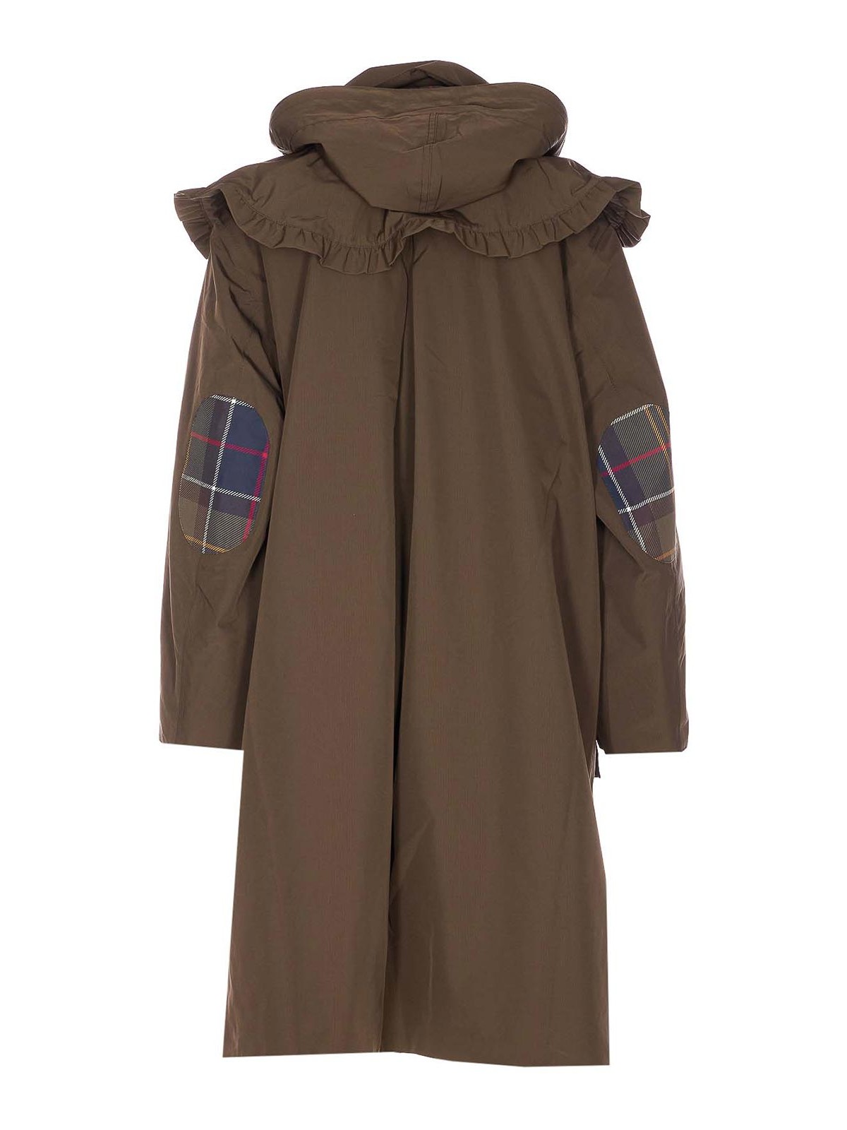 Parka noire Barbour x Ganni olive avec fermeture éclair et boutons, manches longues, détails des poches maxi, logo appliqué sur le devant, col régulier, capuche amovible
