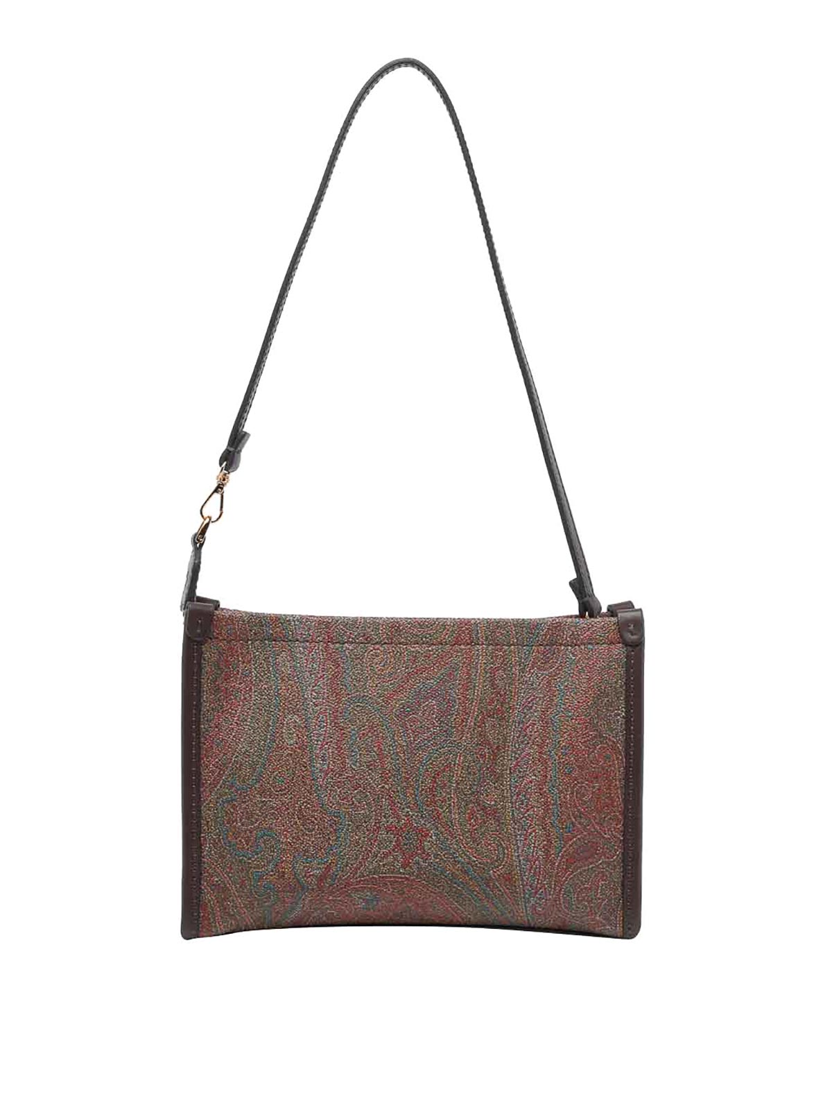 Pochette en arnica Pegaso marron Etro, fermeture zippée, poche intérieure ouverte, bandoulière adaptable et amovible, imprimé cachemire