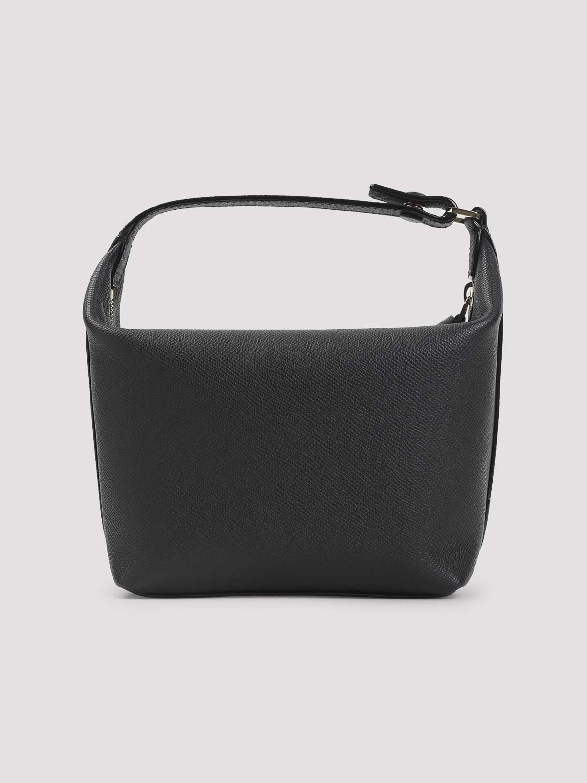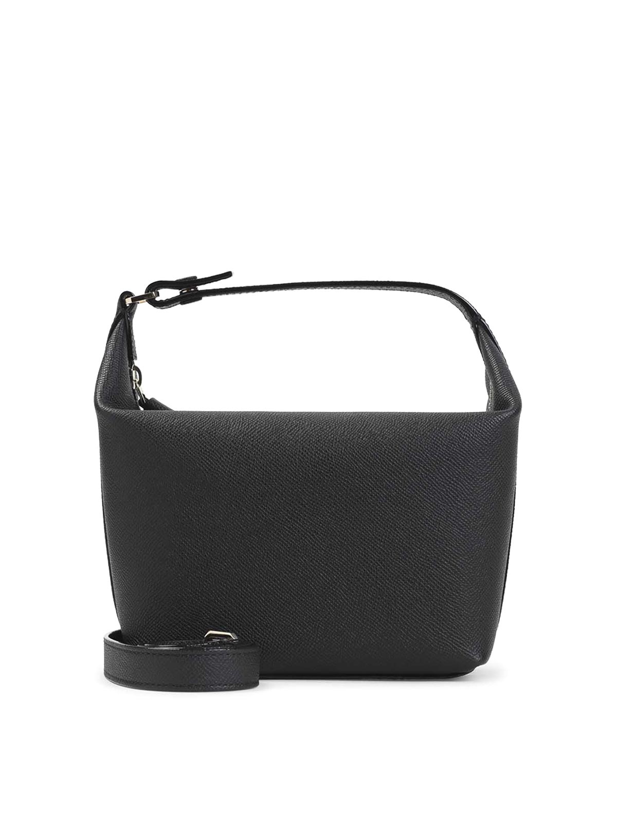 Pochette mochi en cuir de veau noir Valextra Sahara. Sac en cuir de veau noir pur, poignée supérieure, fermeture zippée sur le dessus, sangle en cuir réglable et amovible, un compartiment principal. Détails dorés.