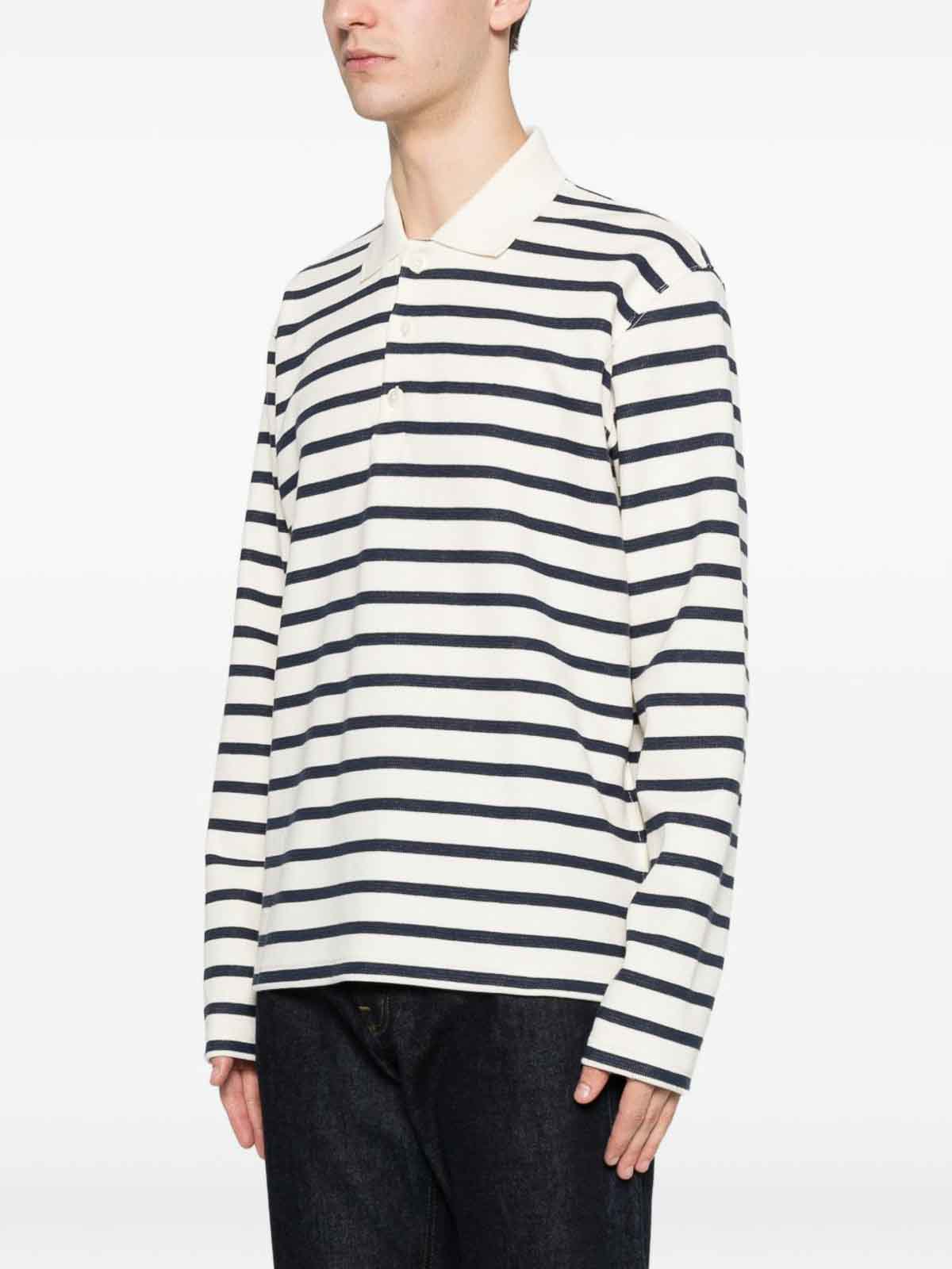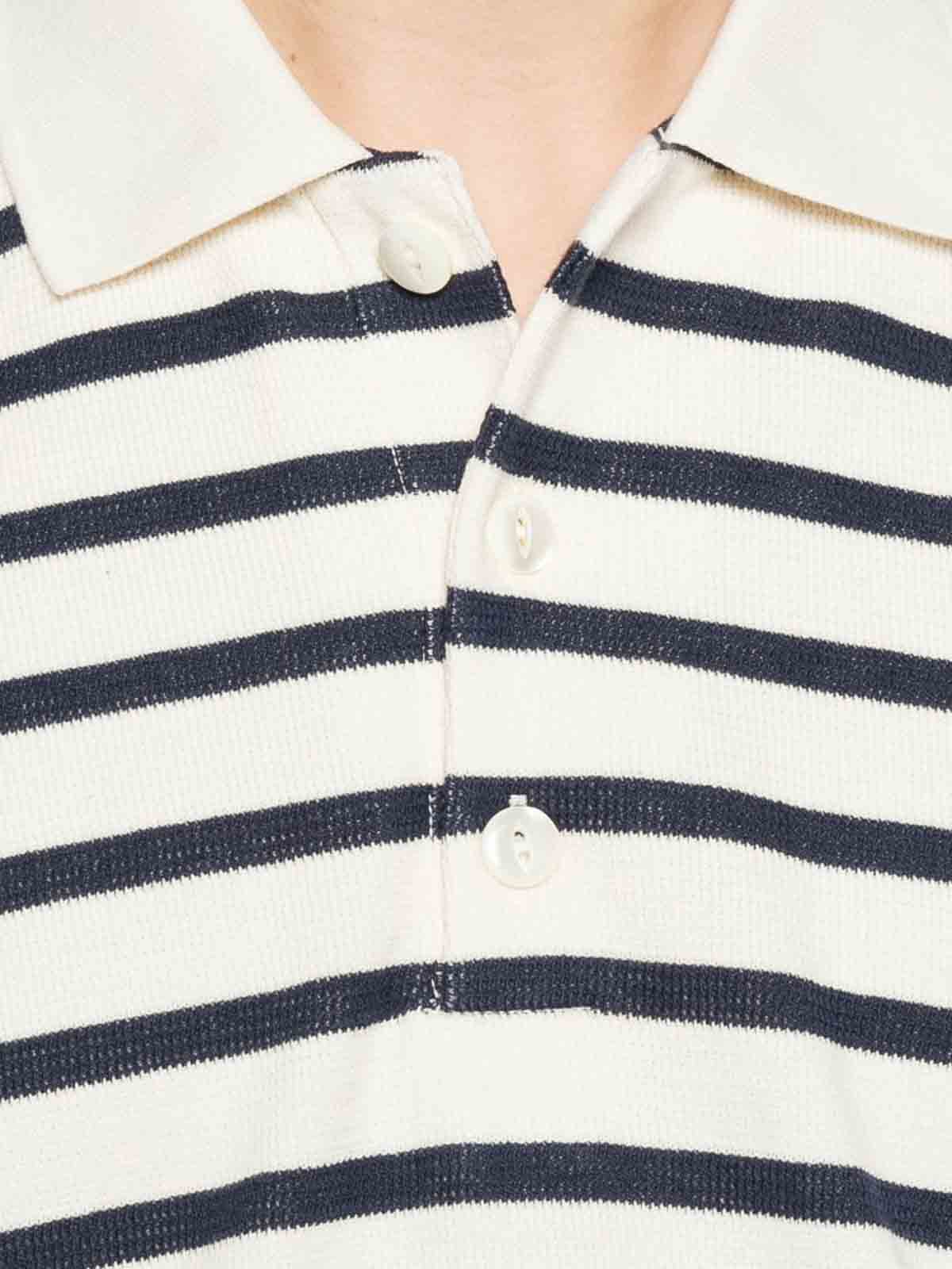 Manches longues rayées beiges/bleues, col polo, patte de boutonnage, fentes latérales