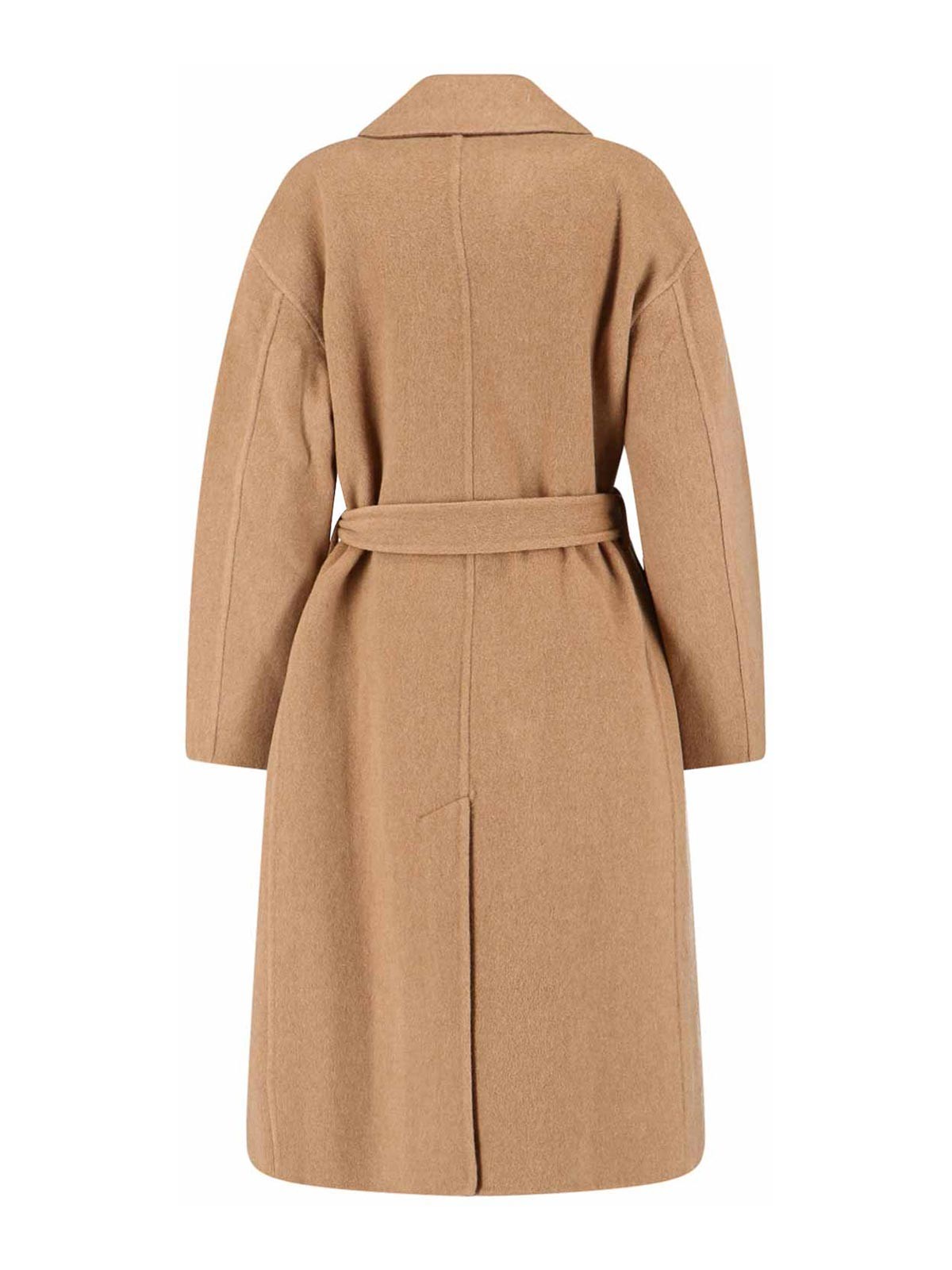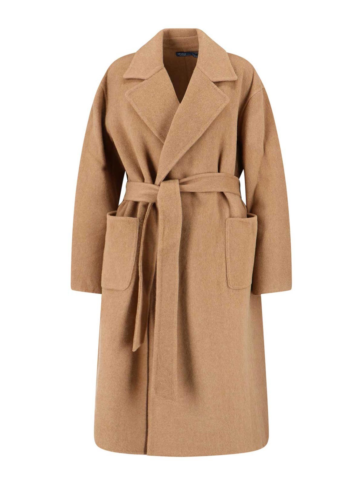 Manteau portefeuille en laine Polo Ralph Lauren, en laine beige, revers classiques, ceinture ajustable à la taille, deux poches latérales plates, fente arrière centrale, ourlet droit.