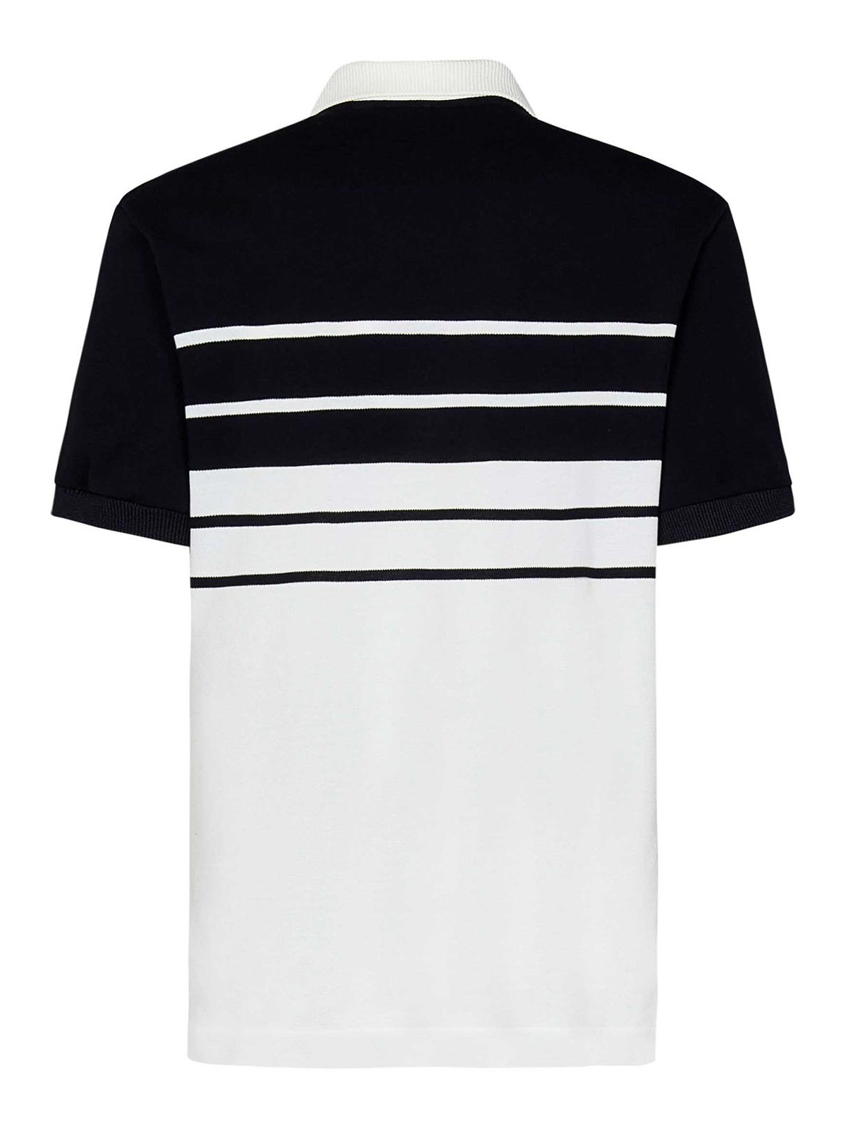 Col polo contrastant à deux boutons, manches courtes, poignets côtelés, écusson brodé sur la poitrine, motif rayé, fentes latérales en bas, coupe classique, couleur : blanc/bleu marine
