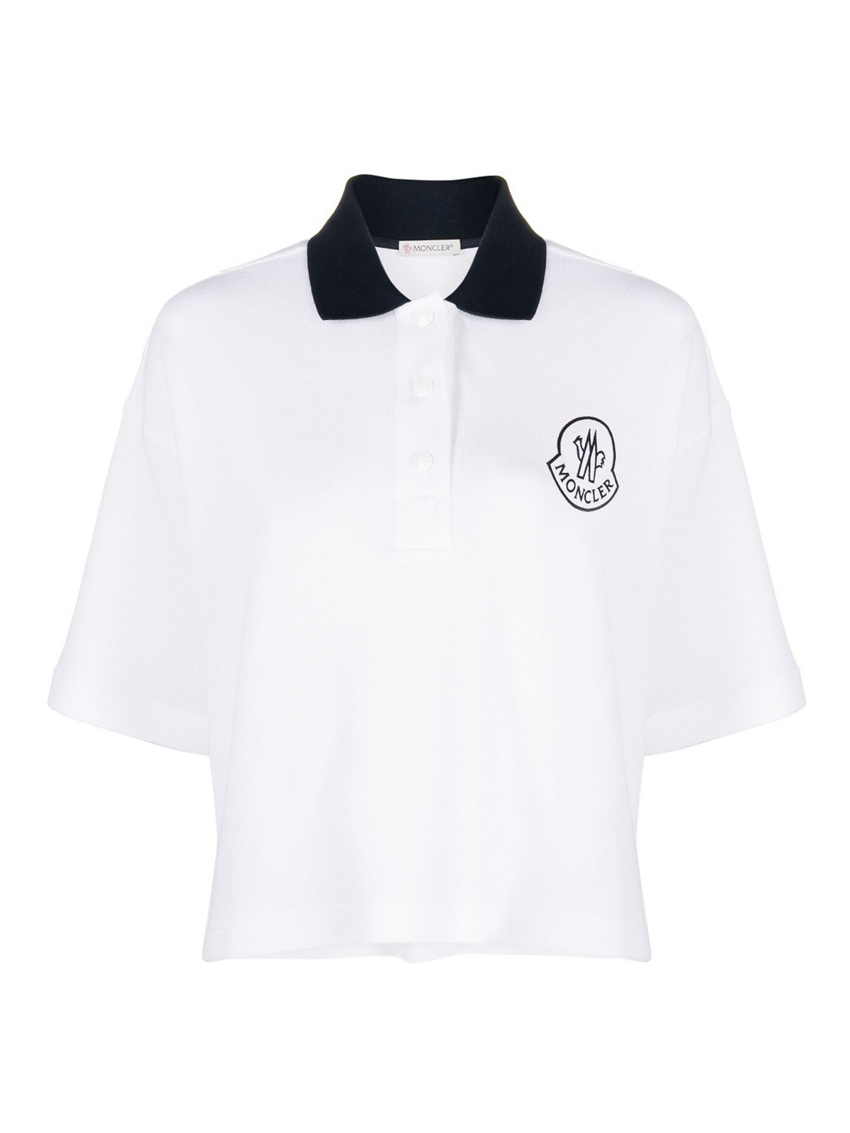 Polo brodé à logo blanc/noir de la marque Moncler avec logo brodé en coton piqué blanc sur la poitrine, patte de boutonnage sur le devant, épaules tombantes, manches mi-longues, ourlet droit et col polo contrastant