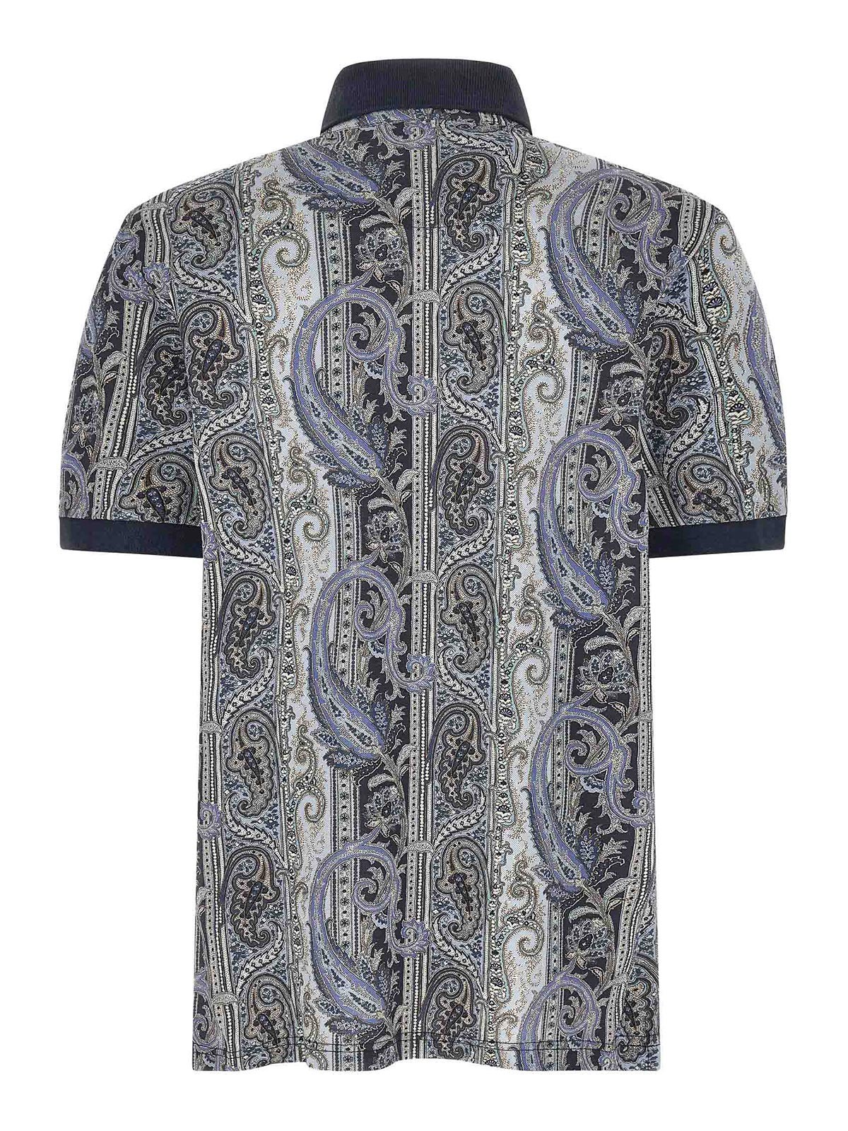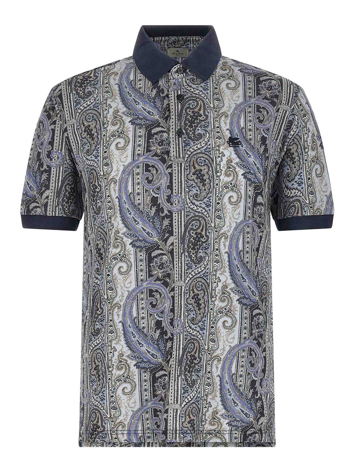 Polo en piquet de pur coton « arnica paisley » sur toute la surface, col et poignets contrastants, logo « Pegaso » brodé et fermeture boutonnée sur le devant, manches courtes à revers, fentes latérales.